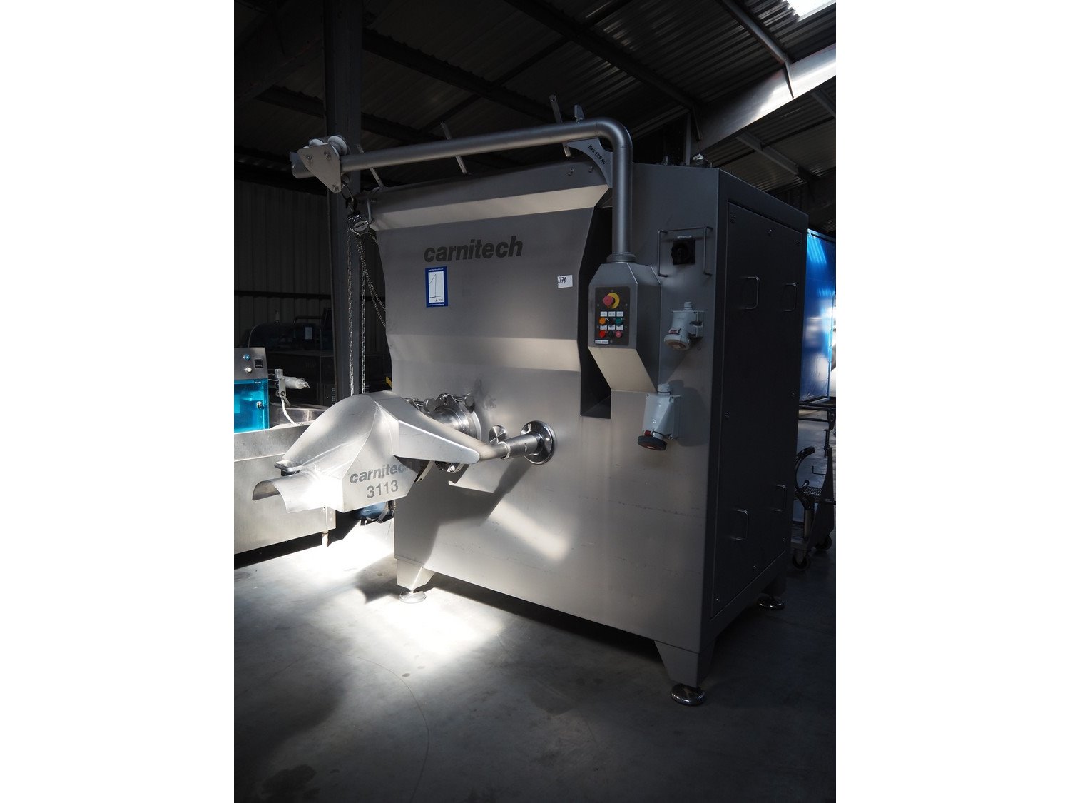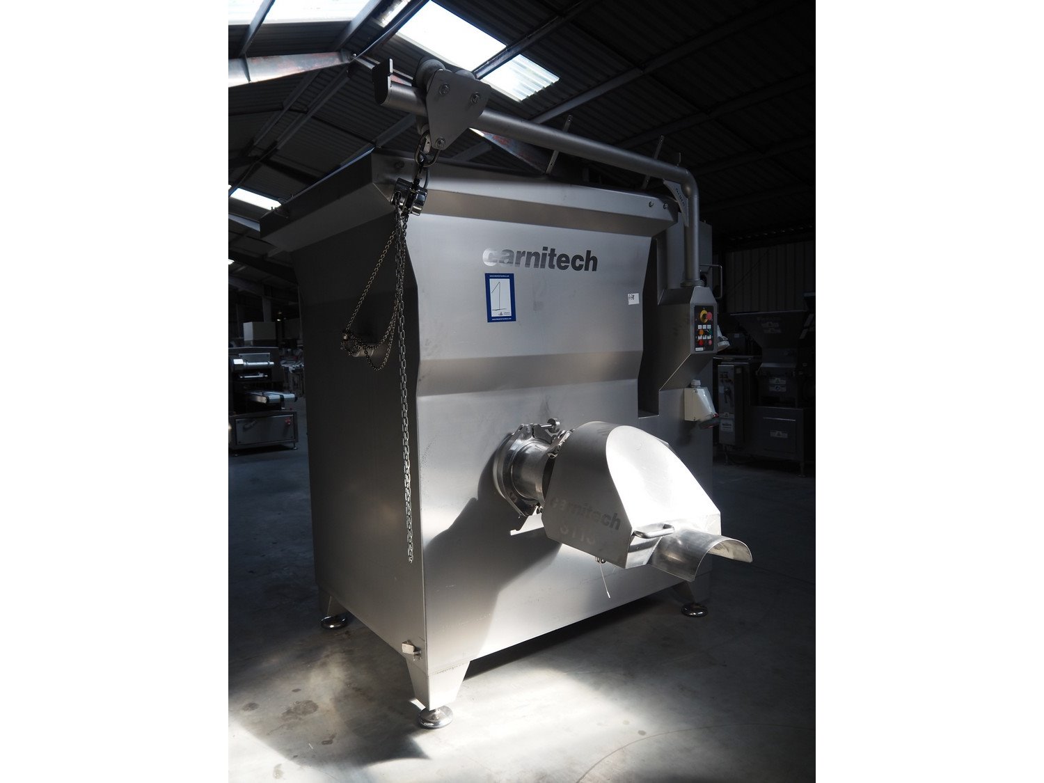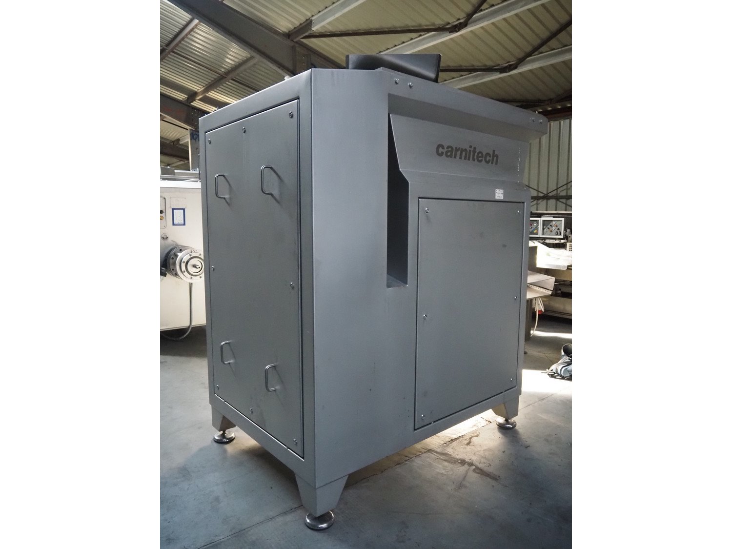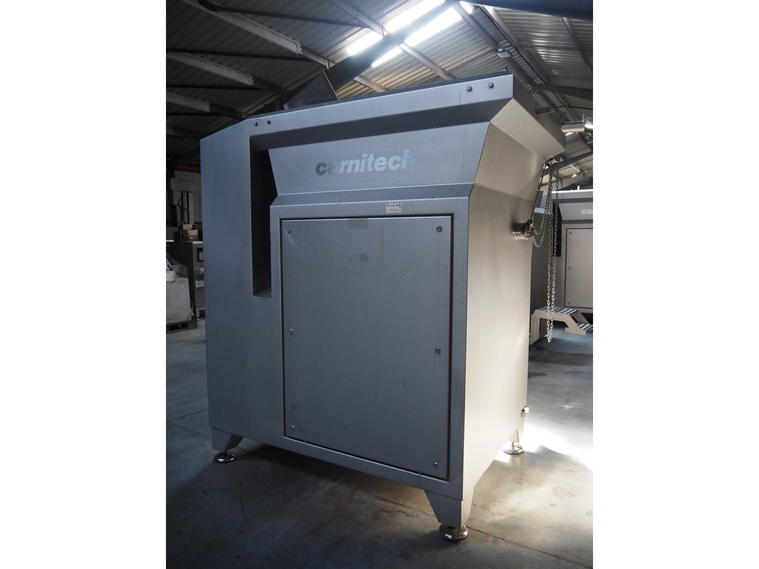Carnitech grinder, model: CT3113, type: ON 23960 00, serial number: 04-2063, year of construction: 2005, 400 V, 3 Ph, 50 Hz, plate diameter: 225 mm, total dimensions: 2200 mm x 2150 mm x 2450 mm. Including s/s tool trolley. Kavel locatie: Lipsko 241, 22-400 Zamość, Polen