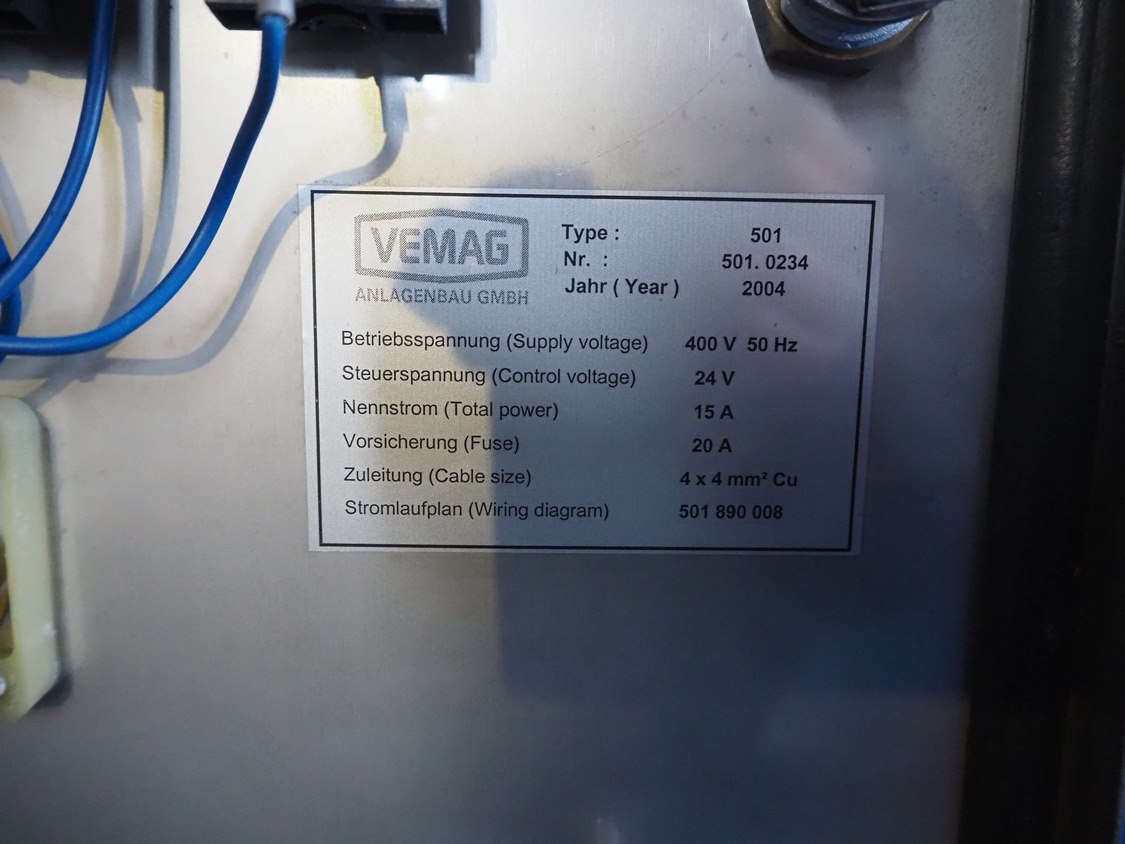 Vemag Maschinenbau GmbH friction smoke generator, type: 501, number: 501.0234, year of construction: 2004, 400 V, 50 Hz, 15 A, dimensions: 1200 mm x 800 mm x 1920 mm. Including switch cabinet. Kavel locatie: Lipsko 241, 22-400 Zamość, Polen