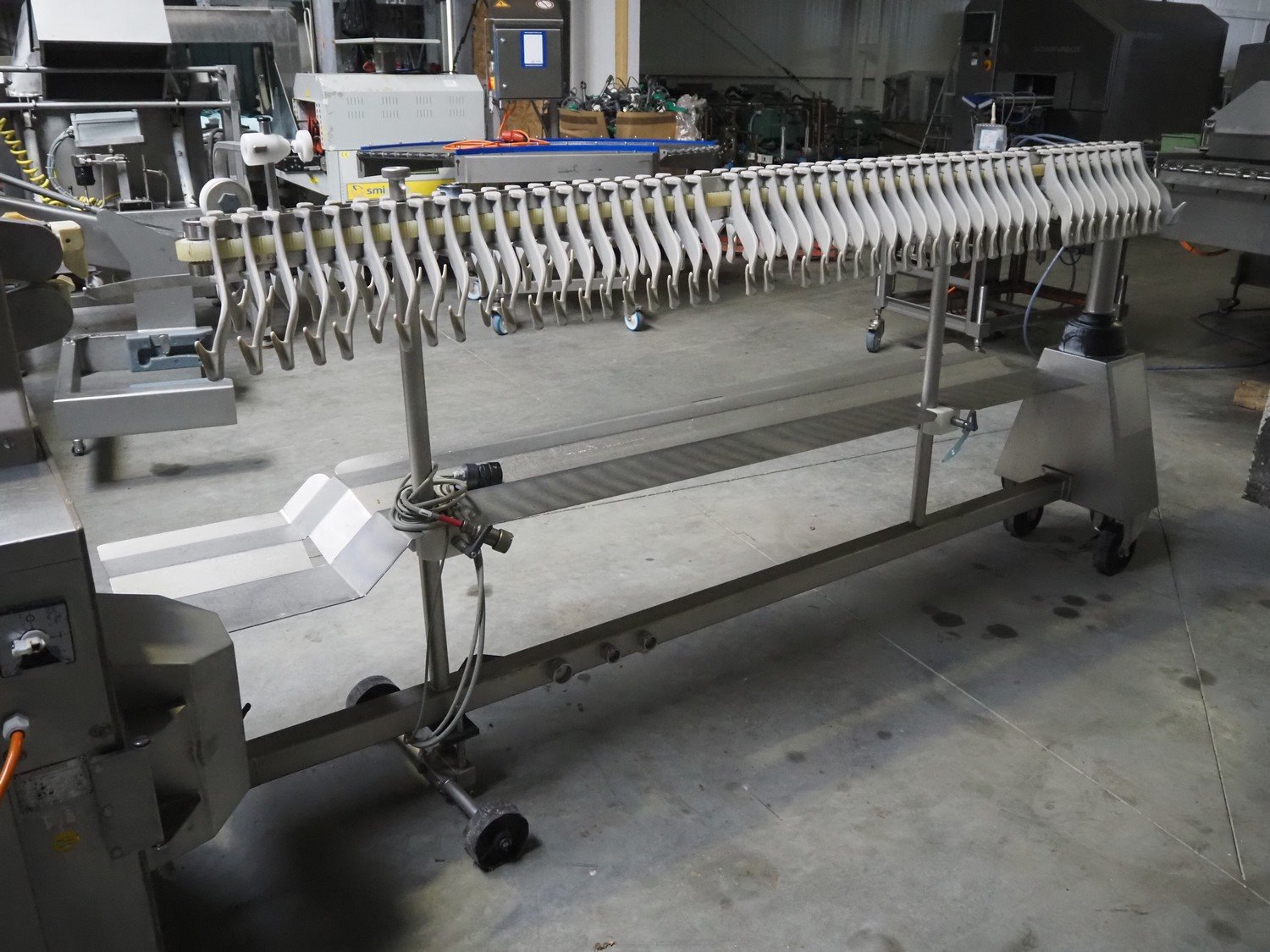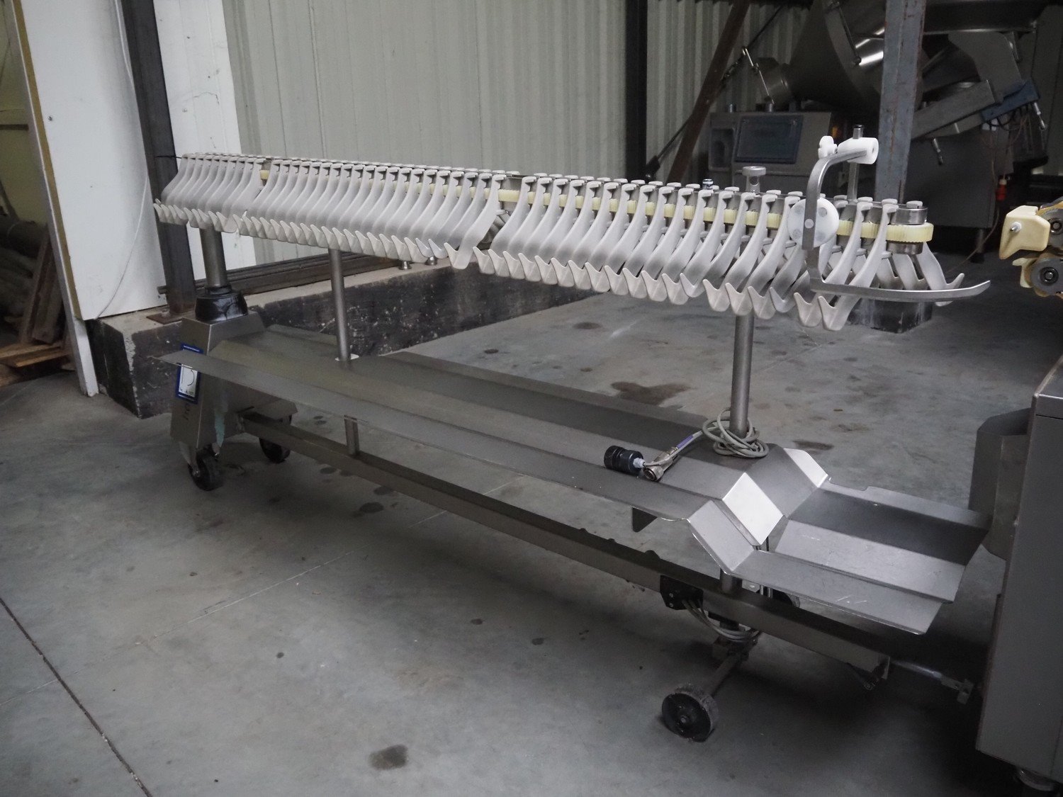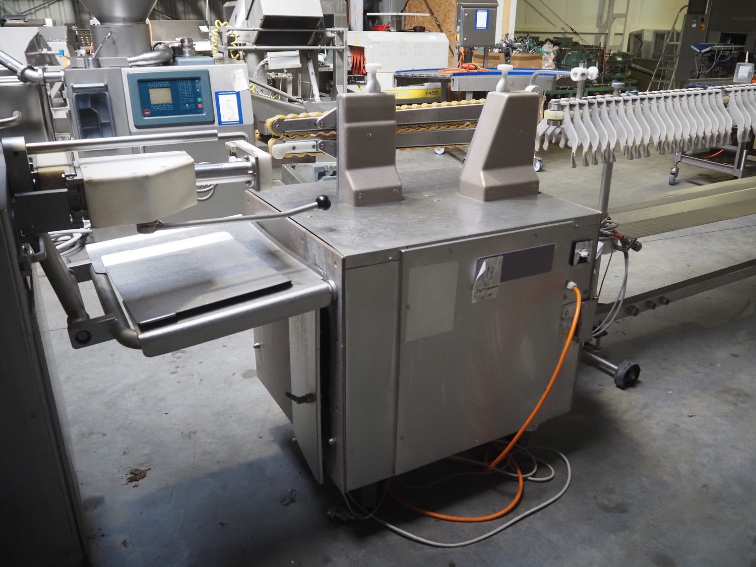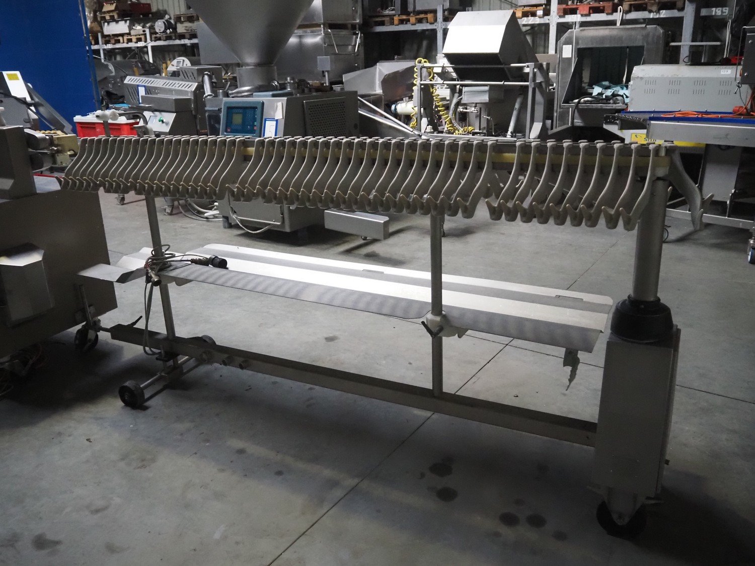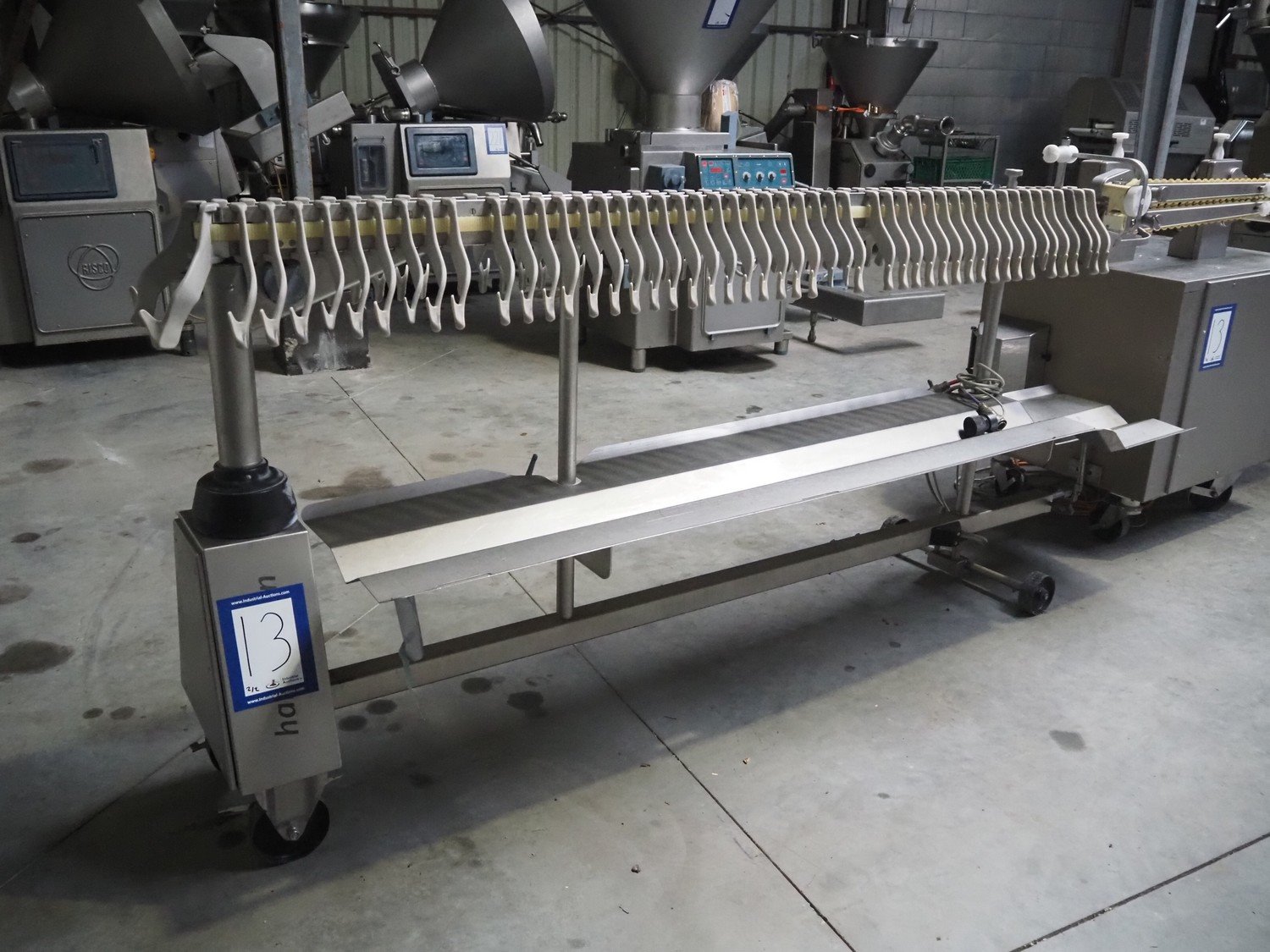 Handtmann linking machine, year of construction: 2000, 400 V, 50 Hz, 3.5 A, 2.5 kW, belt width: 25 mm, total dimensions: 830 mm x 700 mm x 1270 mm. Including Handtmann hanging line, type: 220-16, serial number: 1310, year of construction: 2003, dimensions: 2550 mm x 650 mm x 1290 mm. Kavel locatie: Lipsko 241, 22-400 Zamość, Polen