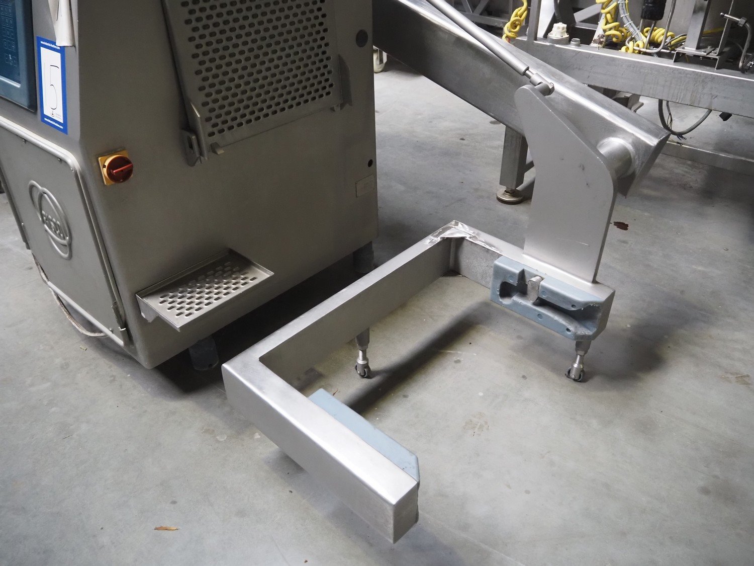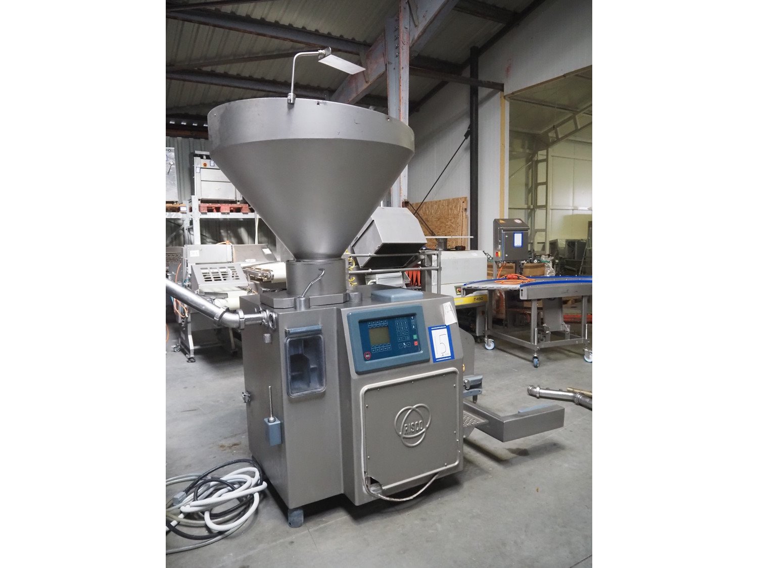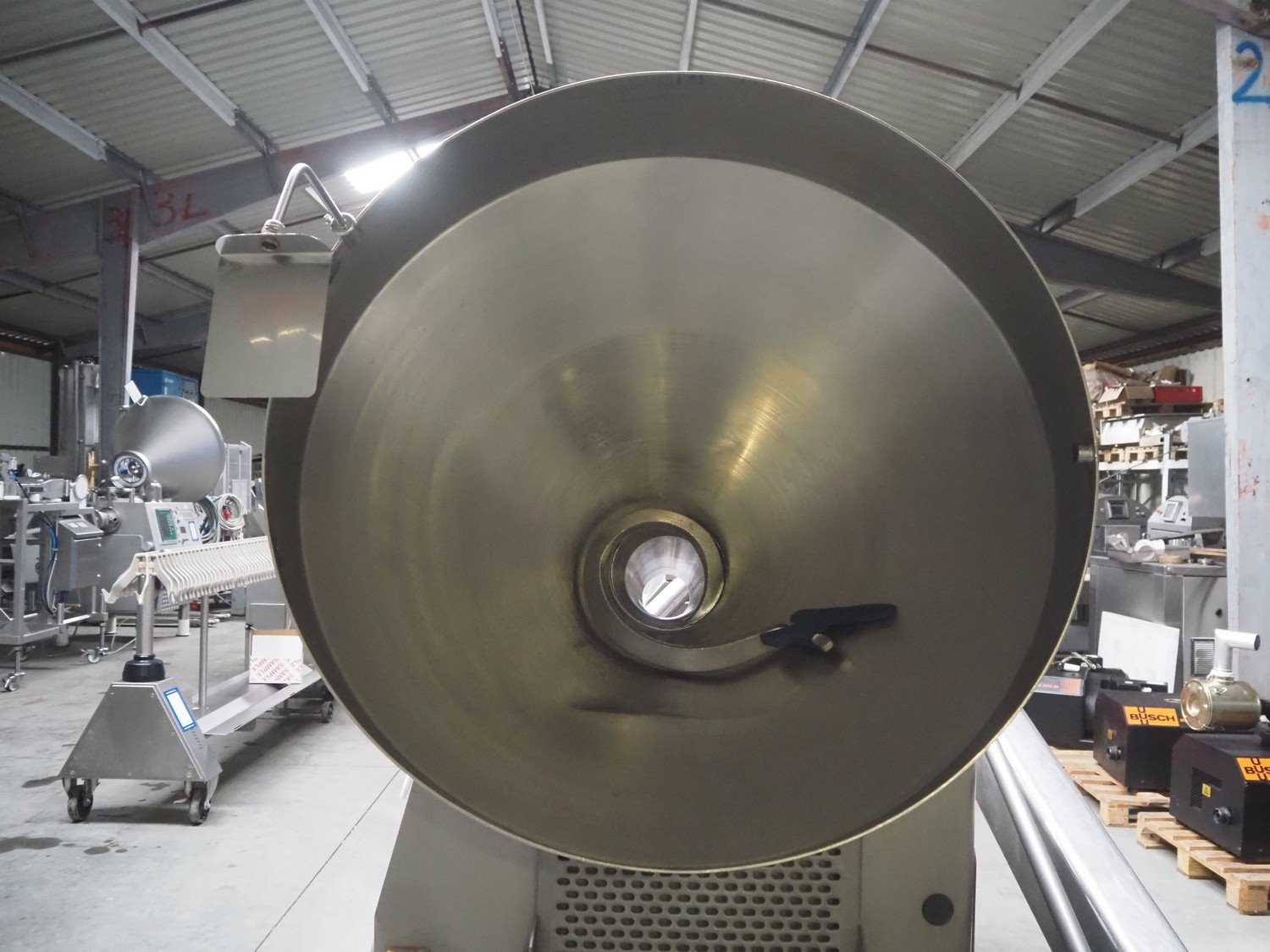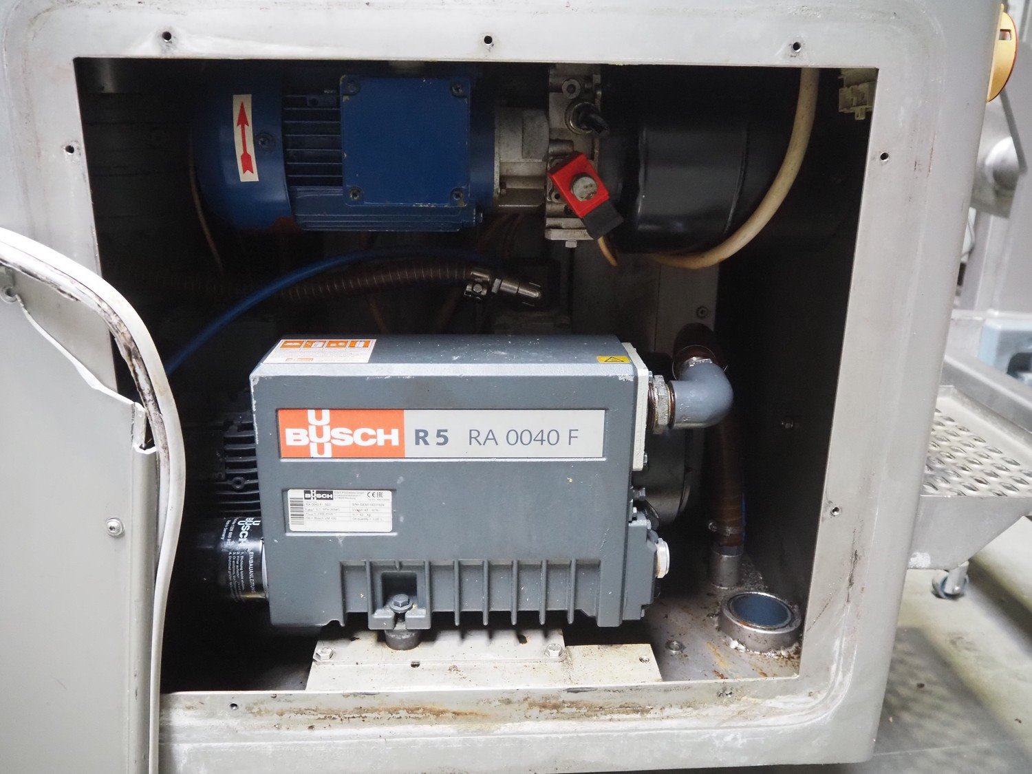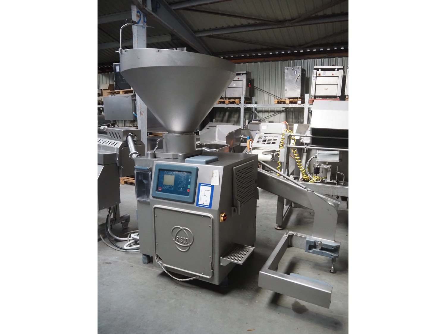 Risco S.p.A. vacuum filling machine with lifter for 200 liter meat bins, model: RS 503, serial number: C804001, year of construction: 2005, 400 V, 3 Ph, 50 Hz, 14 kW, weight: 1060, with Busch vacuum pump, type: RA 0040 F 503, serial number: DEM119231529, Vmax = 40 m³/h, total dimensions: 2000 mm x 1400 mm x 2300 mm. Including extra parts. Kavel locatie: Lipsko 241, 22-400 Zamość, Polen