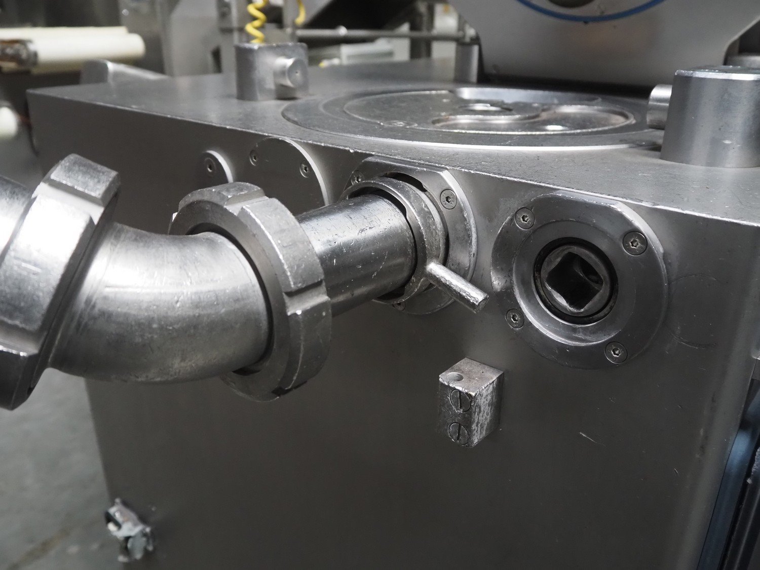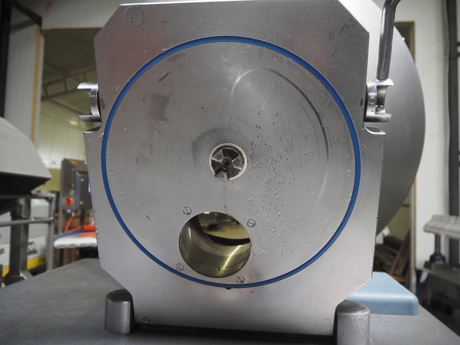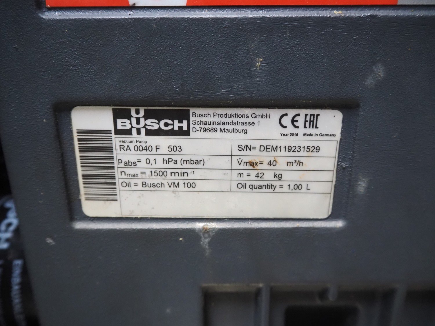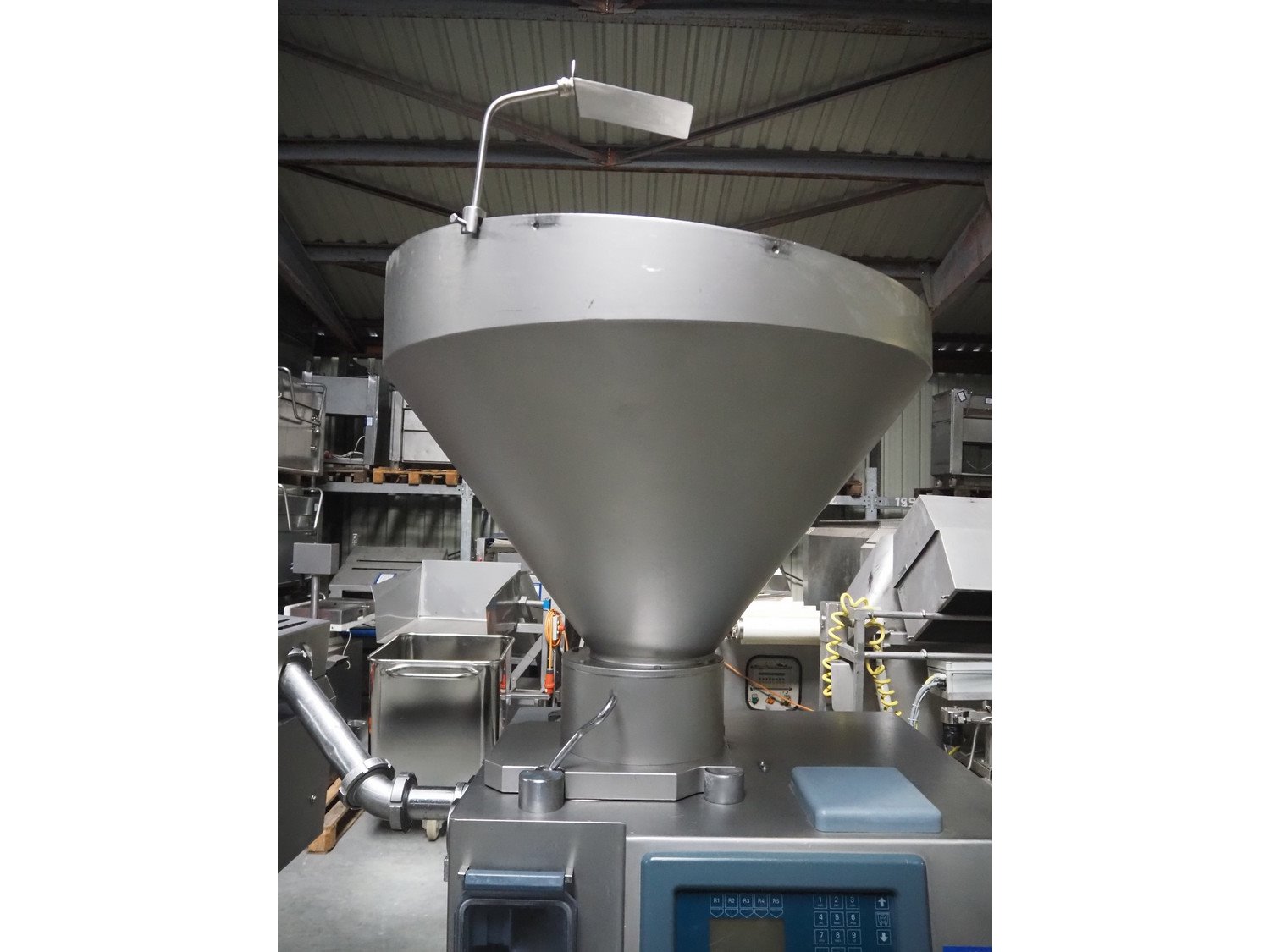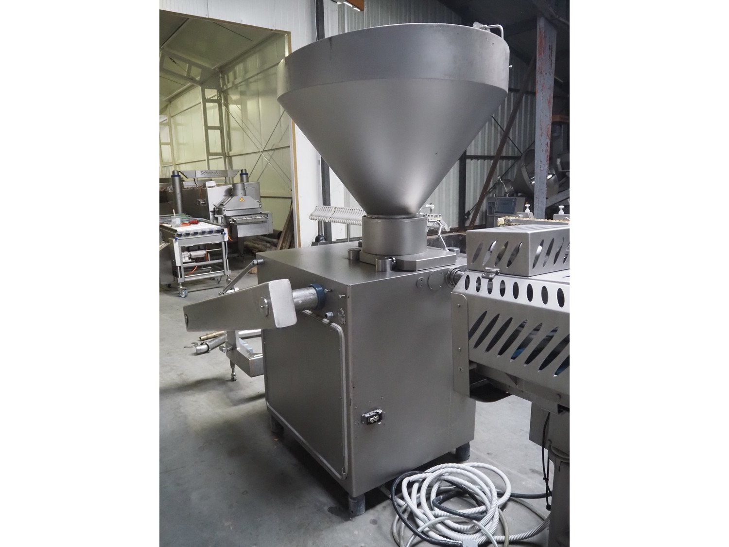 Risco S.p.A. vacuum filling machine with lifter for 200 liter meat bins, model: RS 503, serial number: C804001, year of construction: 2005, 400 V, 3 Ph, 50 Hz, 14 kW, weight: 1060, with Busch vacuum pump, type: RA 0040 F 503, serial number: DEM119231529, Vmax = 40 m³/h, total dimensions: 2000 mm x 1400 mm x 2300 mm. Including extra parts. Kavel locatie: Lipsko 241, 22-400 Zamość, Polen
