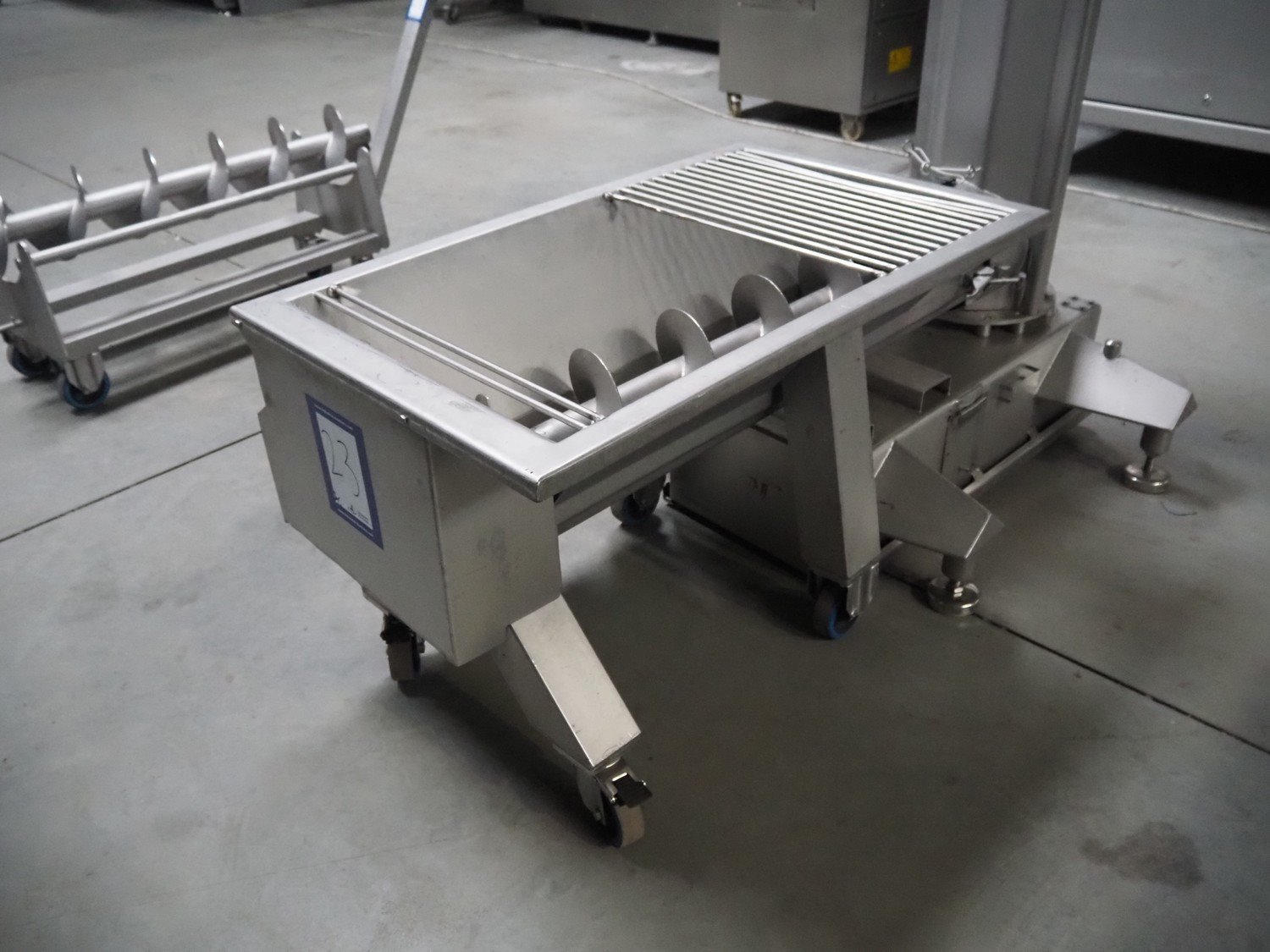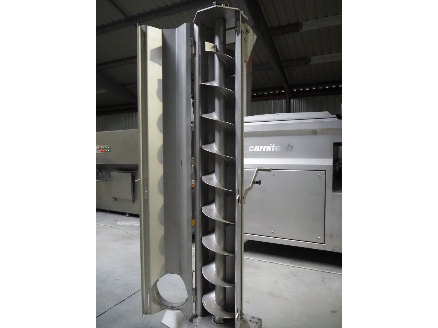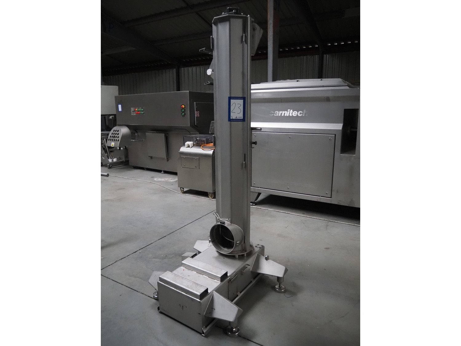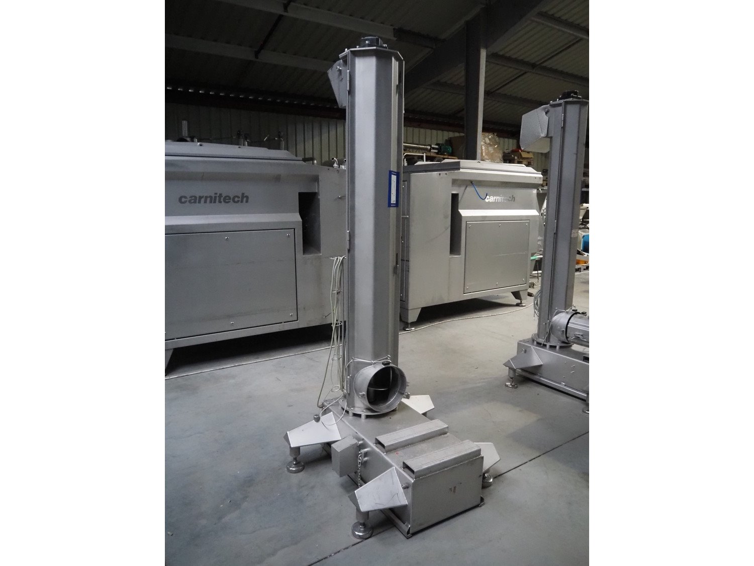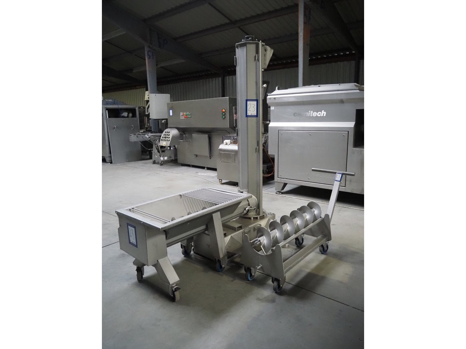 Carnitech giraf, type: Giraf model B, serial number: 04-0250, year of construction: 2005, 400 V, 3 PH, 50 Hz, screw diameter: 230 mm, tier: 190 mm, elevating height: 2000 mm, total dimensions: 1000 mm x 1000 mm x 2400 mm. Including mobile s/s infeed bunker, dimensions: 1400 mm x 400 mm x 400 mm. Including trolley with screw, dimensions: 1300 mm x 500 mm x 970 mm. Kavel locatie: Lipsko 241, 22-400 Zamość, Polen