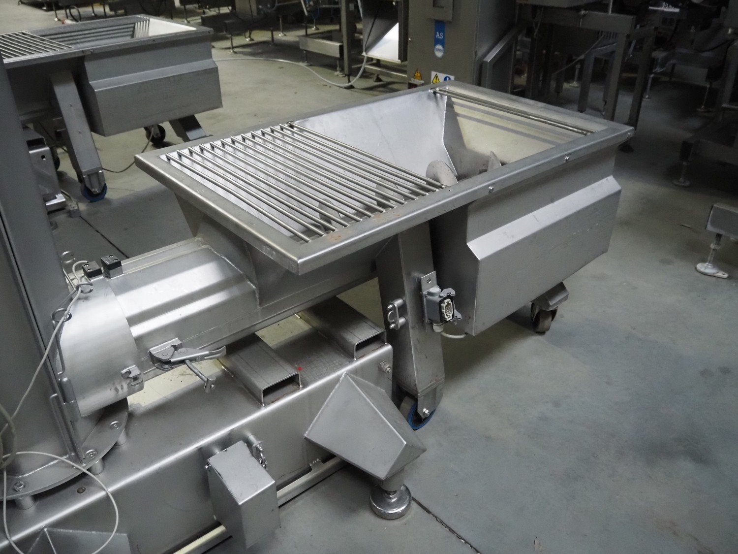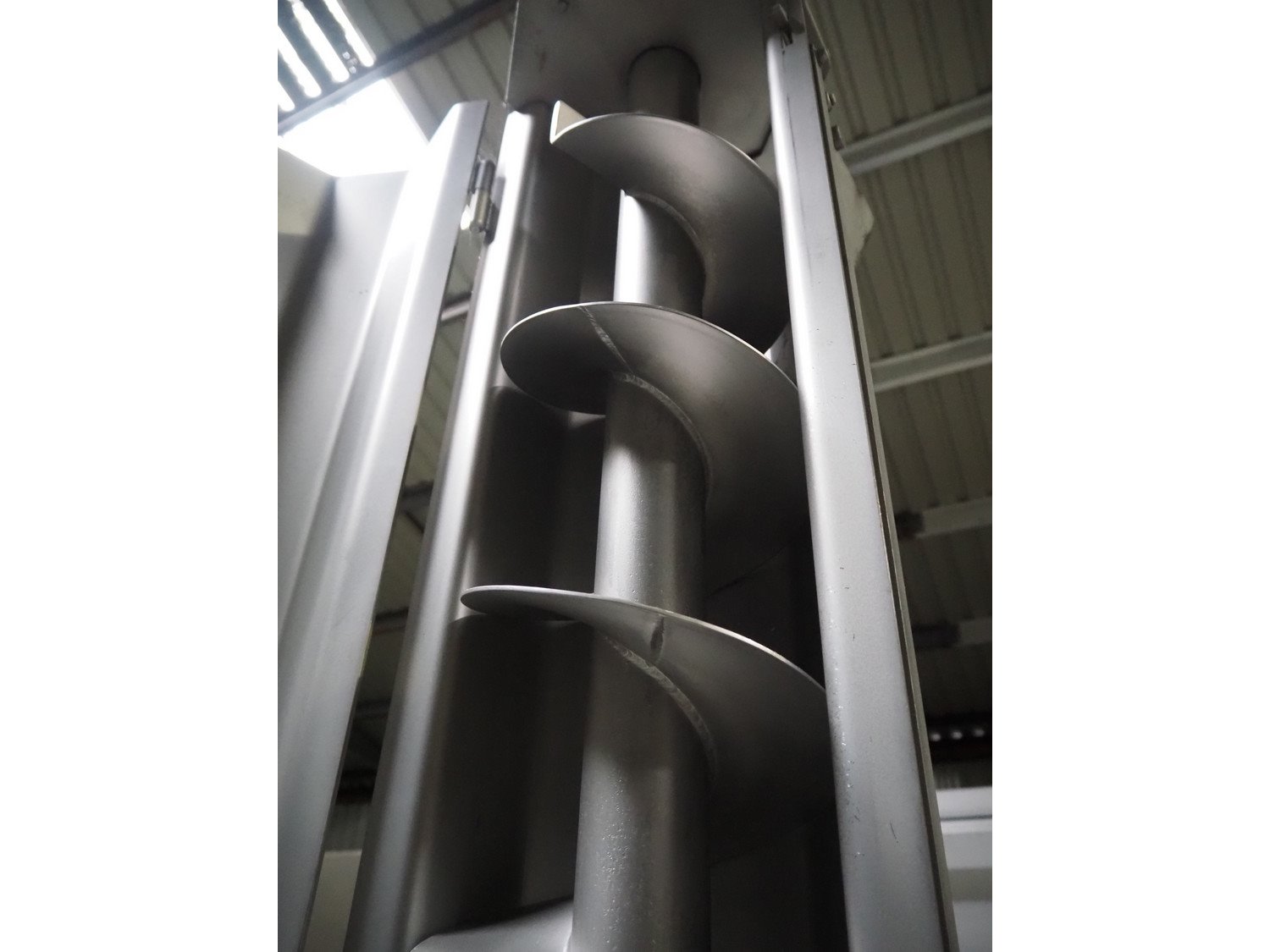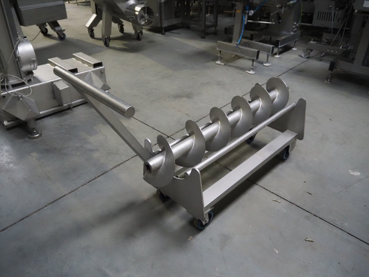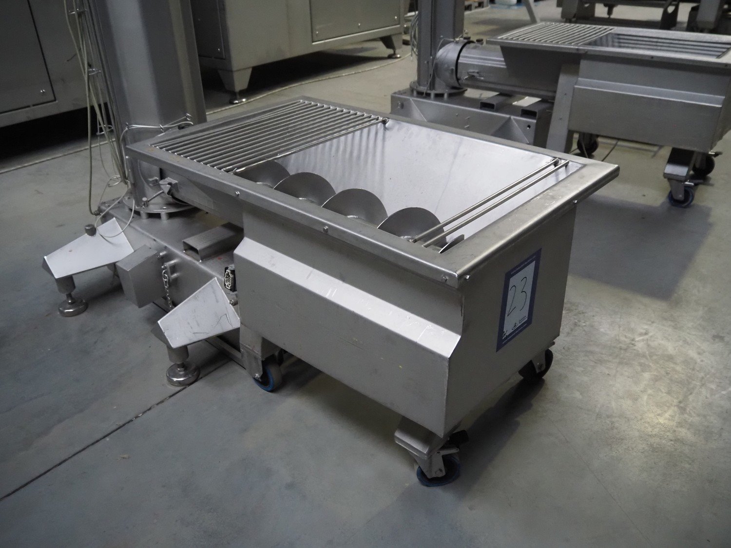 Carnitech giraf, type: Giraf model B, serial number: 04-0250, year of construction: 2005, 400 V, 3 PH, 50 Hz, screw diameter: 230 mm, tier: 190 mm, elevating height: 2000 mm, total dimensions: 1000 mm x 1000 mm x 2400 mm. Including mobile s/s infeed bunker, dimensions: 1400 mm x 400 mm x 400 mm. Including trolley with screw, dimensions: 1300 mm x 500 mm x 970 mm. Kavel locatie: Lipsko 241, 22-400 Zamość, Polen