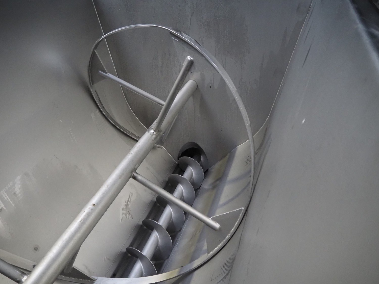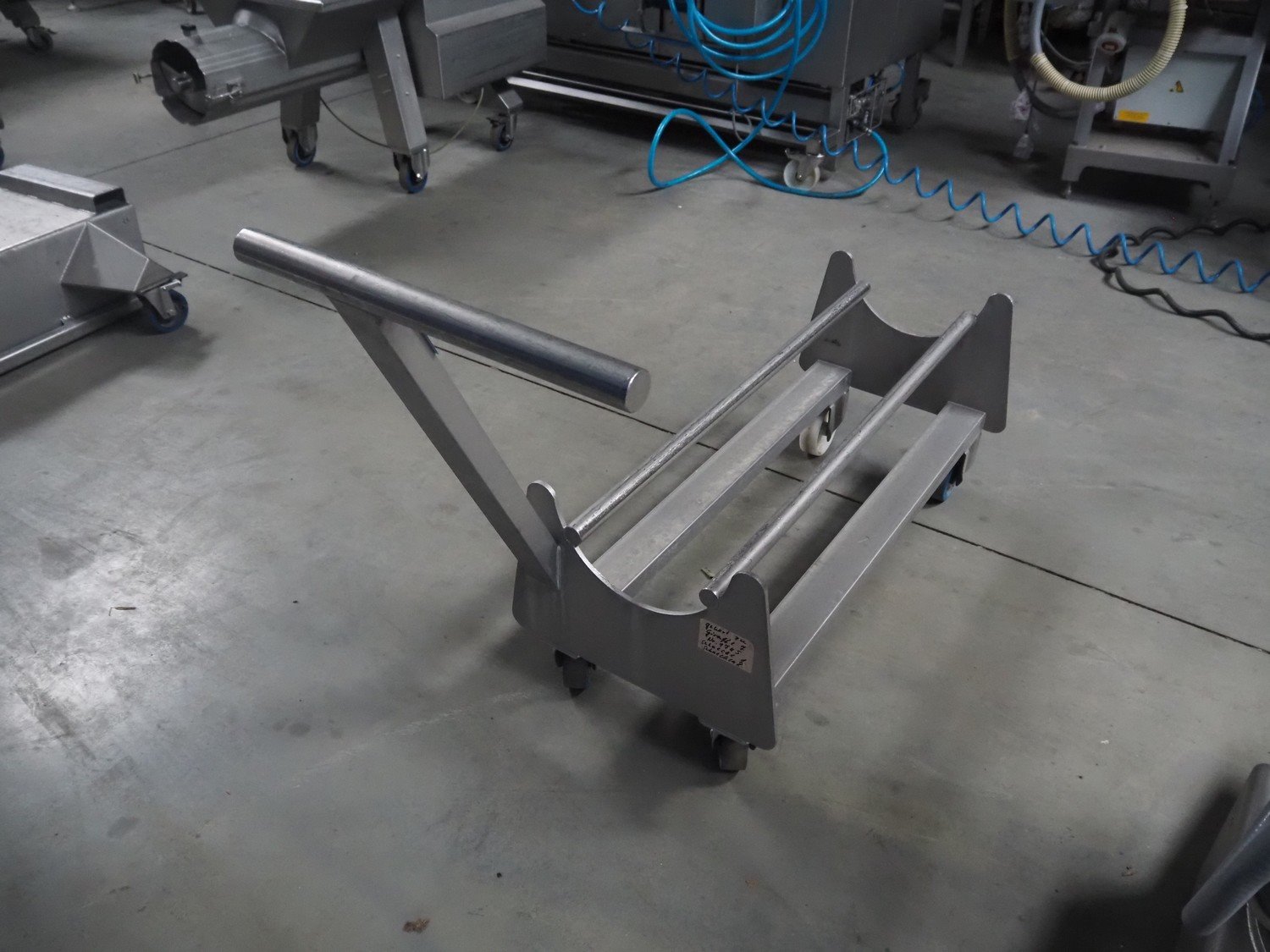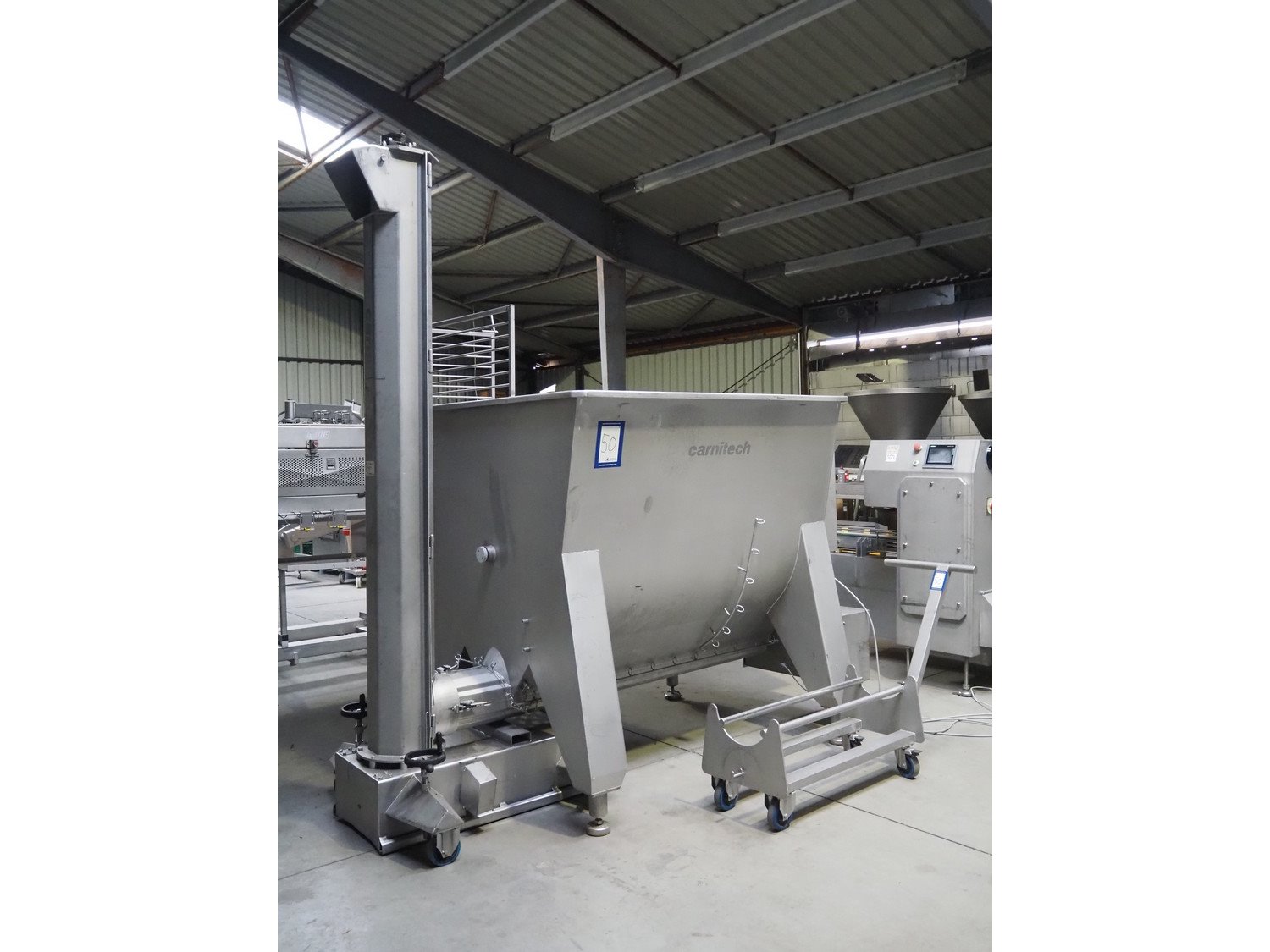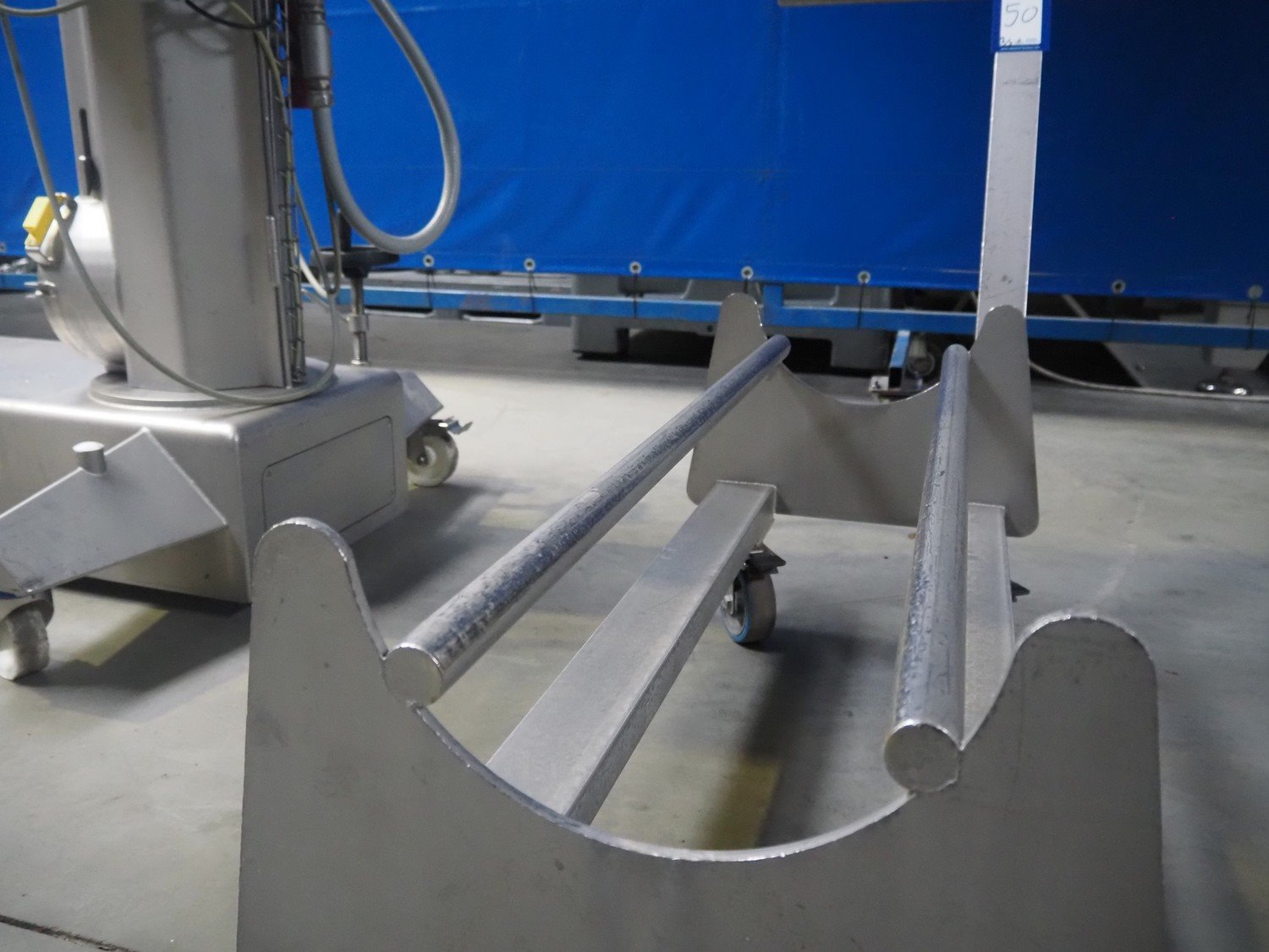 Marel Carnitech mobile s/s giraf, model: B250, serial number: M10189, year of construction: 2016, 400 V 3 Ph, 50 Hz, 7.9 A, screw dimensions: 240 mm, tier: 180 mm, elevating height: 2500 mm, total dimensions: 2000 mm x 1000 mm x 3000 mm, with s/s infeed bunker, dimensions: 2300 mm x 1500 mm x 1200 mm. Including s/s trolley, dimensions: 1350 mm x 450 mm x 970 mm. Kavel locatie: Lipsko 241, 22-400 Zamość, Polen