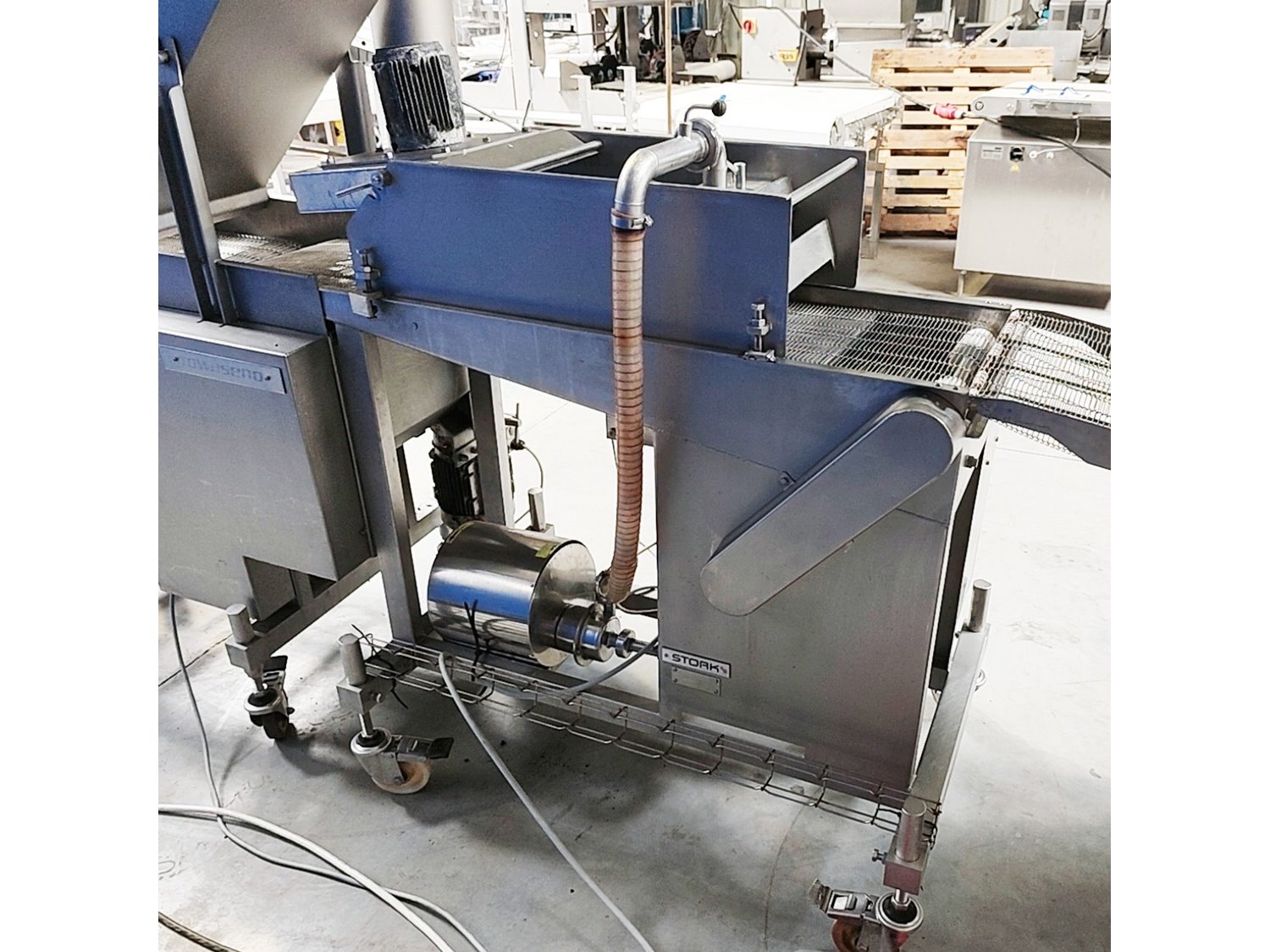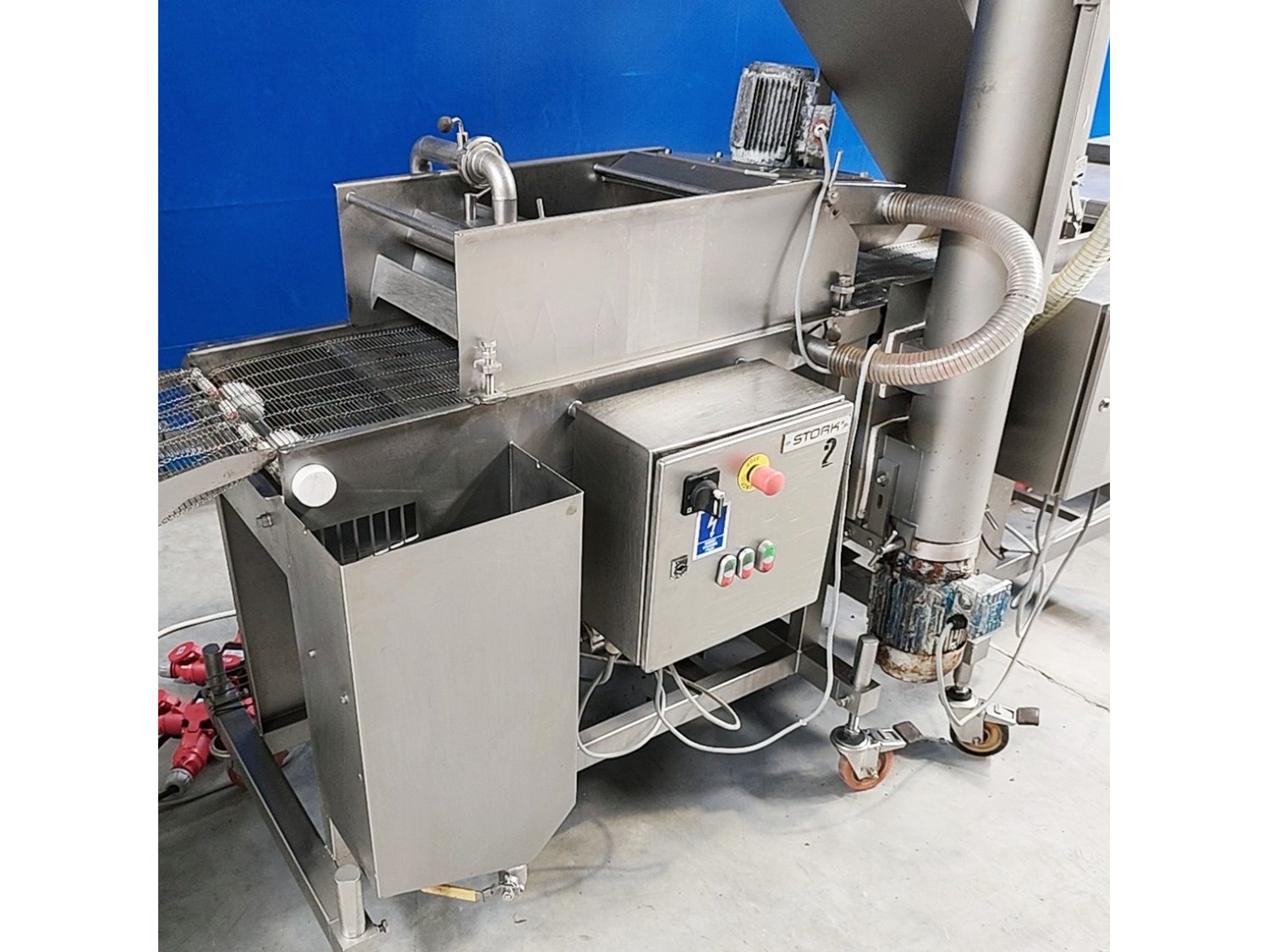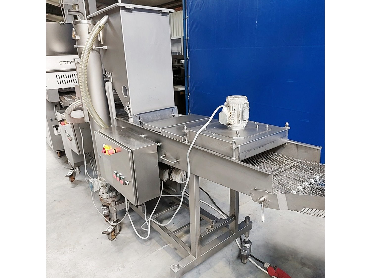 Stork forming- and breading line, consisting of: Stork Titan B.V. mobile forming machine, model: THV 400-E65 TA2107, type: 4779132, serial number: 10058201, year of construction: 2006, s/s mesh belt, belt width: 400 mm, diameter press: 95 mm, total dimensions: 2450 mm x 900 mm x 2040 mm. Stork Titan B.V. mobile battering machine. Marel Townsend Further Processing B.V. mobile breading machine, model: TPM 400 TD2104, type: 4279225, serial number: 10153206, year of construction: 2016, s/s mesh belt, belt width: 400 mm, clearance: 420 mm x 70 mm, total dimensions: 2400 mm x 830 mm x 1950 mm. Without lifter. Kavel locatie: Lipsko 241, 22-400 Zamość, Polen