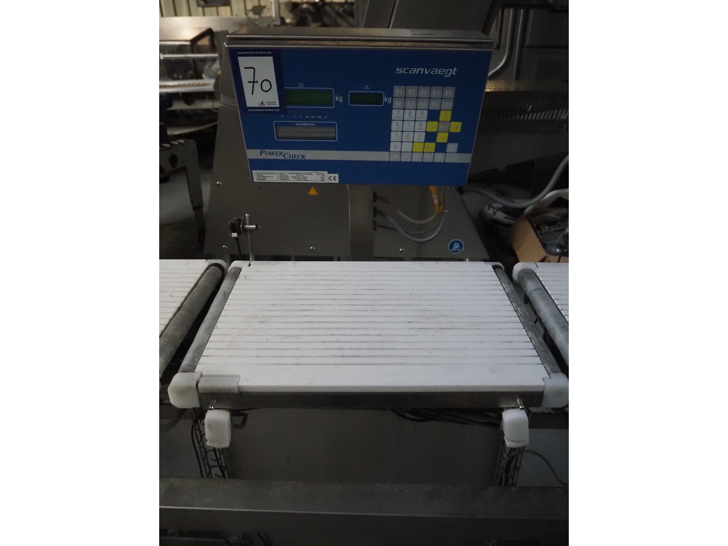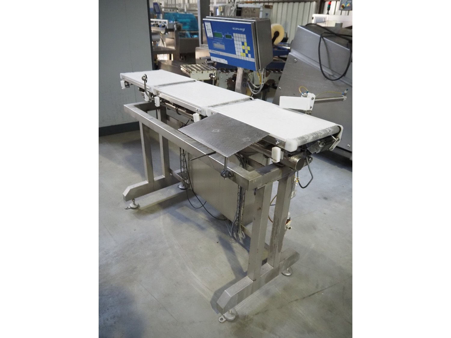 Scanvaegt checkweigher with rejector, type: Powercheck, serial number: 56496, belt width: 315 mm, total dimensions: 1500 mm x 780 mm x 1400 mm. Missing belt. Kavel locatie: Lipsko 241, 22-400 Zamość, Polen