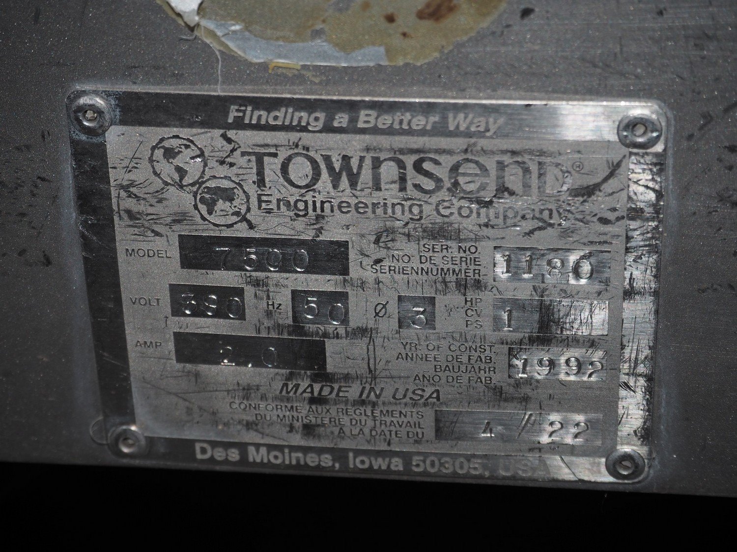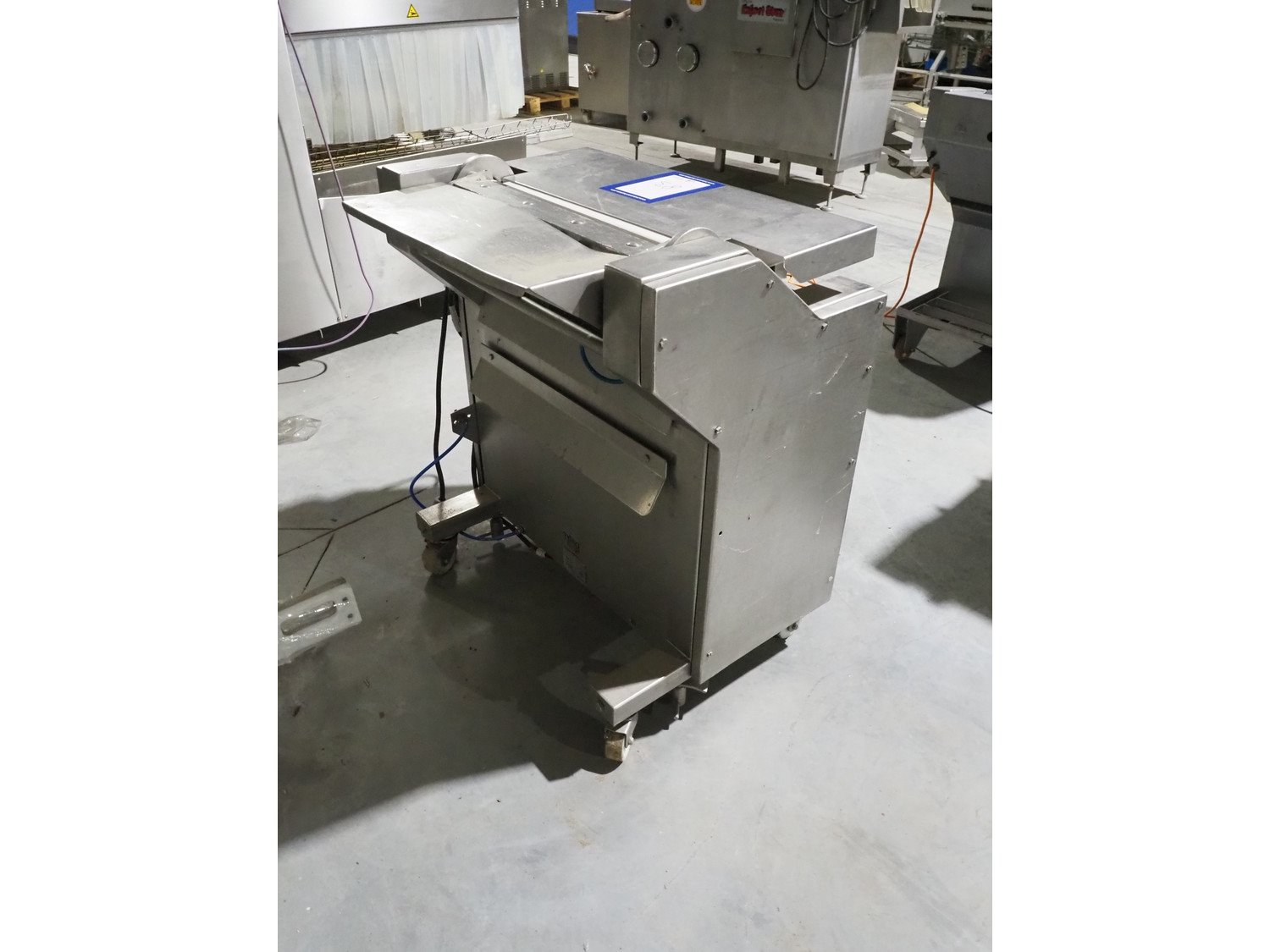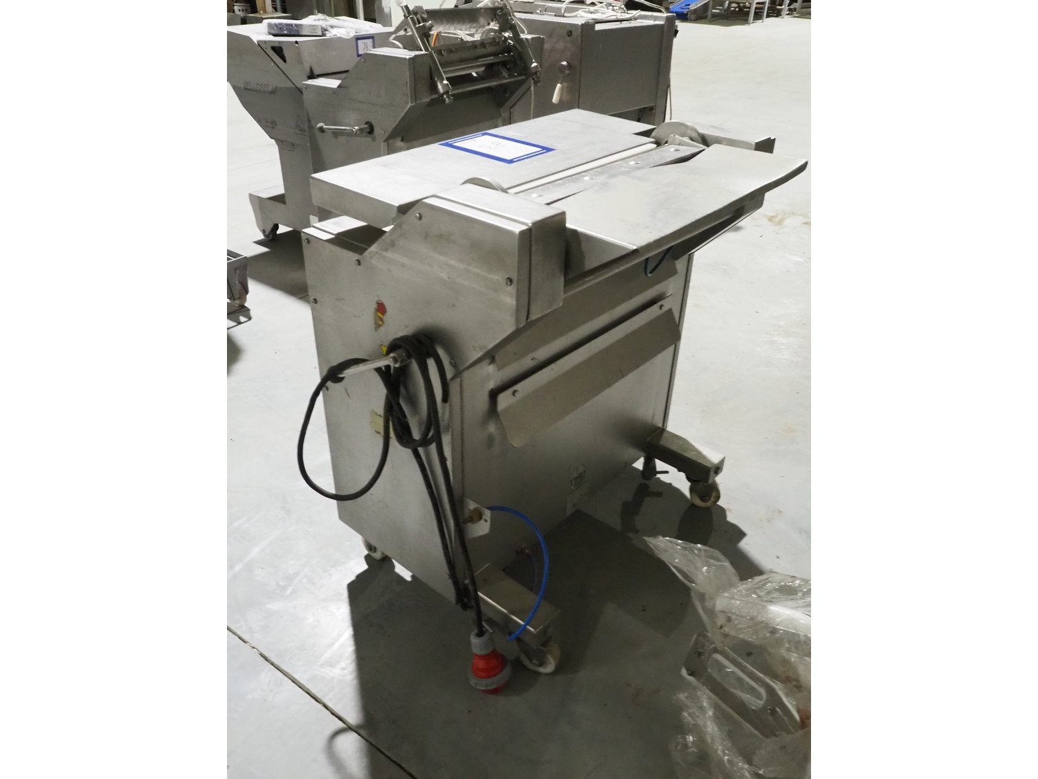 Townsend mobile skinning machine, model: 7500, serial number: 1180, year of construction: 1992, 380 V, 3 Ph, 50 Hz, 2.0 A, working width: 500 mm, foot control, total dimensions: 900 mm x 550 mm x 1100 mm. Kavel locatie: Lipsko 241, 22-400 Zamość, Polen
