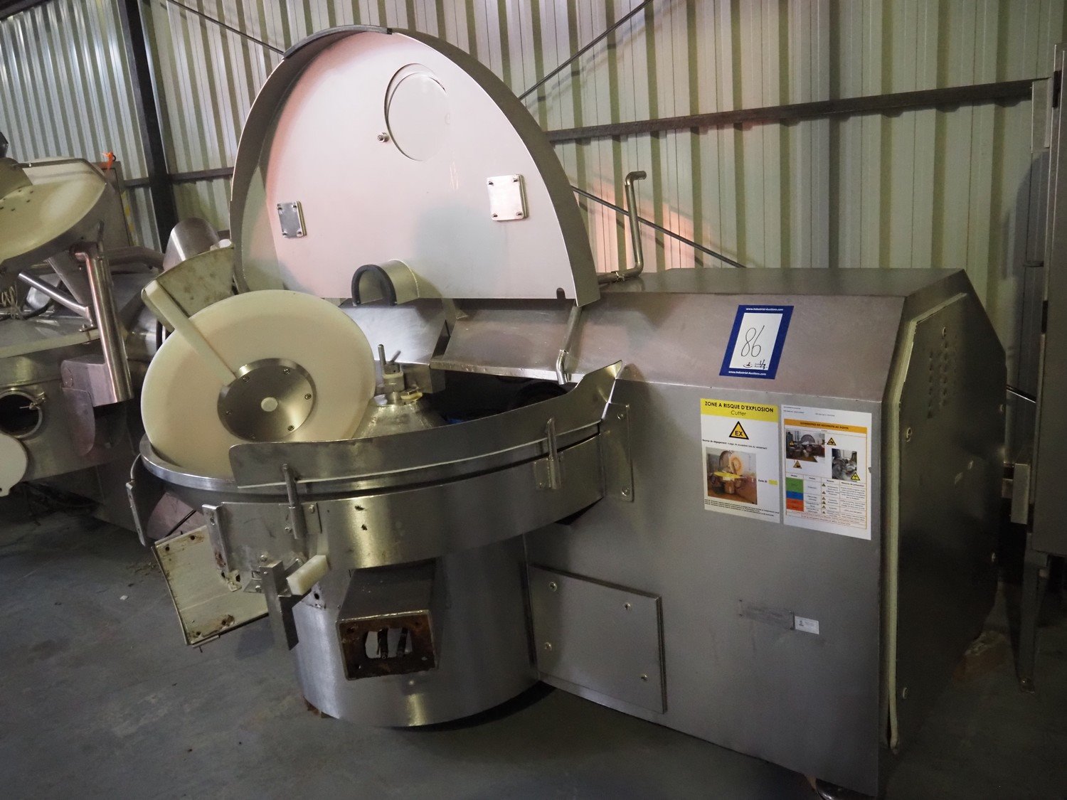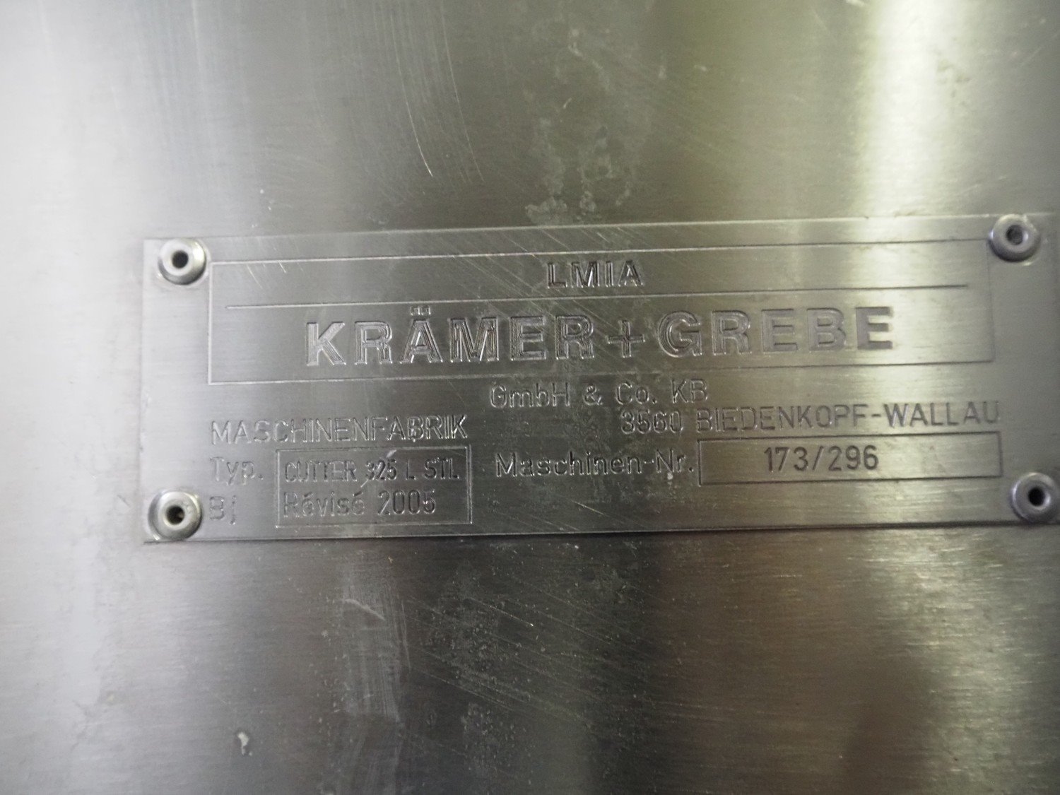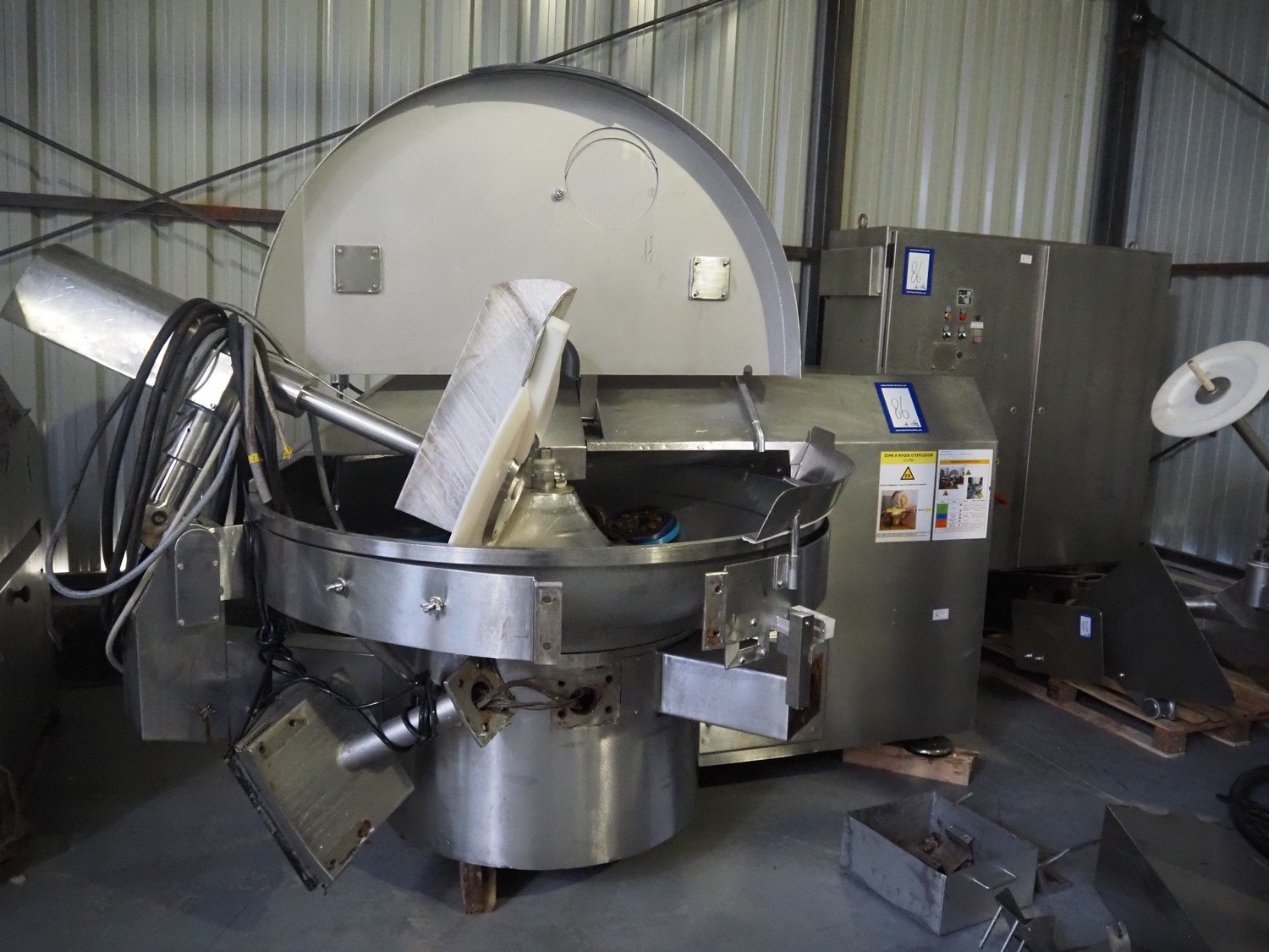 Krämer + Grebe bowl cutter with lifter for 200 liter meat bins and ejector, type: Cutter 325 L STL, serial number: 173/296, revised in 2005, s/s bowl and knives, volume: 325 liter, dimensions: 3000 mm x 2200 mm x 1900 mm. Including switch cabinet, dimensions: 1700 mm x 600 mm x 2000 mm and lifter, dimensions: 1800 mm x 1200 mm x 800 mm. Kavel locatie: Lipsko 241, 22-400 Zamość, Polen