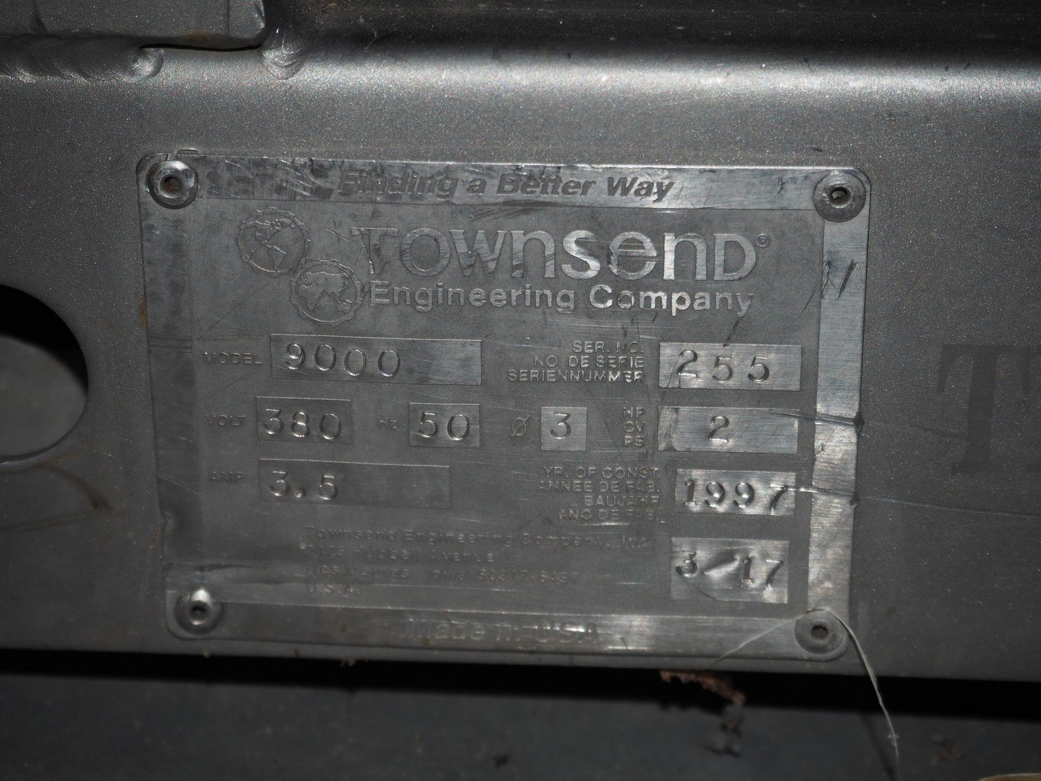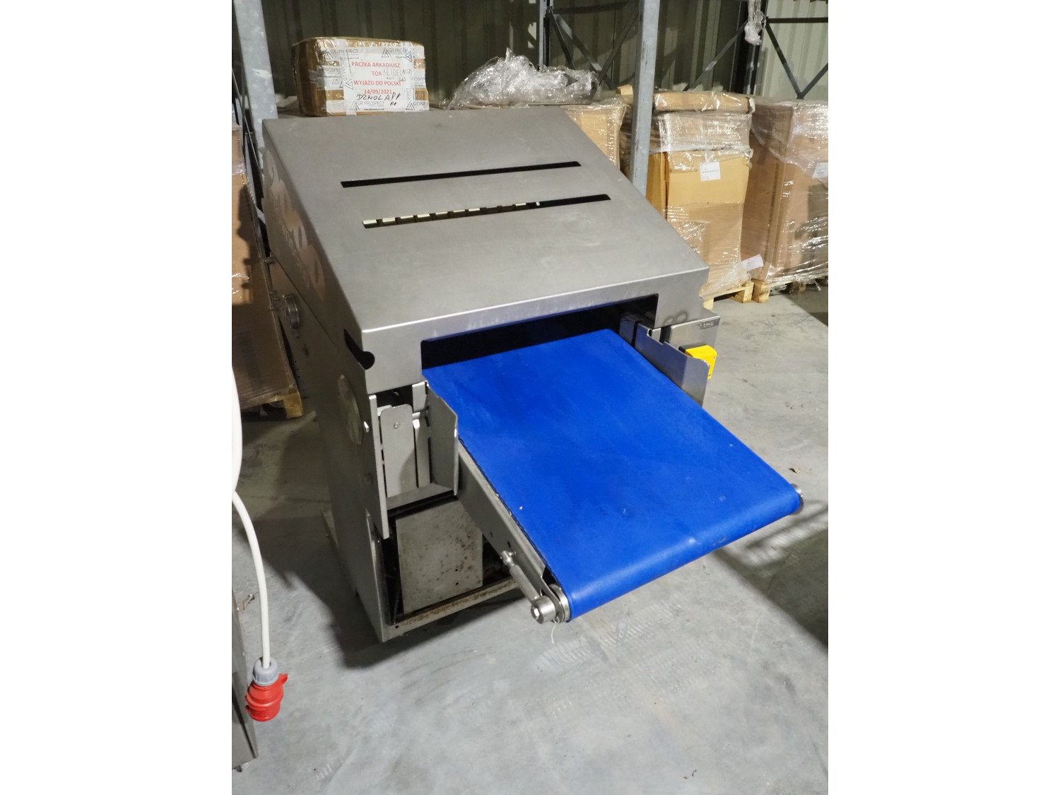 Townsend mobile skinning and derinding machine, model: 9000, serial number: 255, year of construction: 1997, 380 V, 3 Ph, 50 Hz, 3.5 A, working width: 500 mm, plastic belt, belt width: 510 mm, total dimensions: 2100 mm x 900 mm x 1350 mm. Missing cover. Kavel locatie: Lipsko 241, 22-400 Zamość, Polen