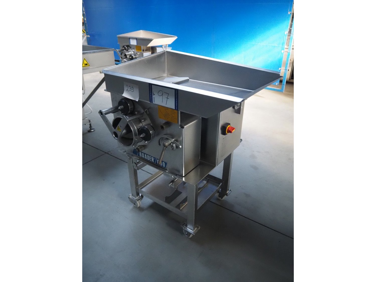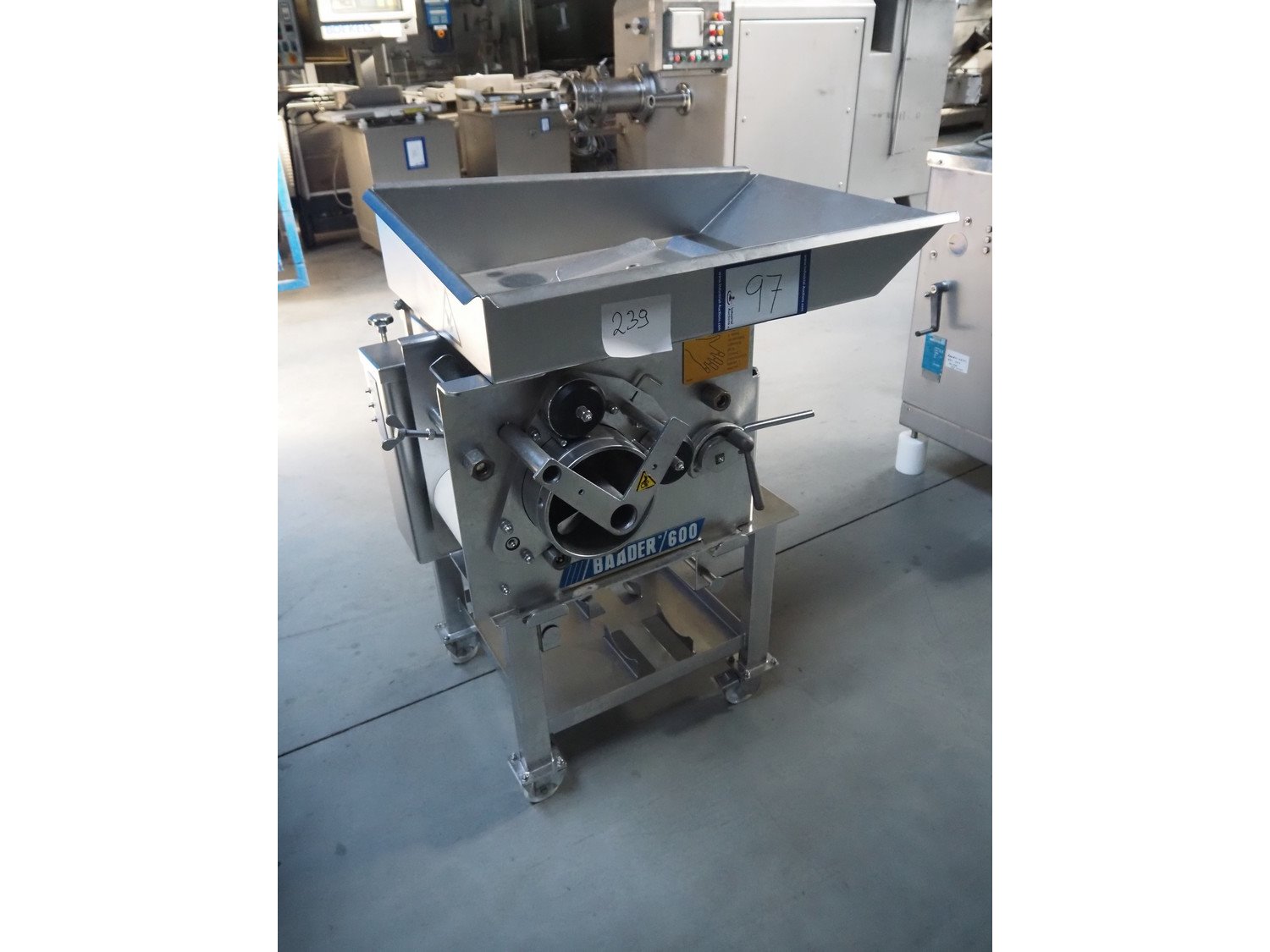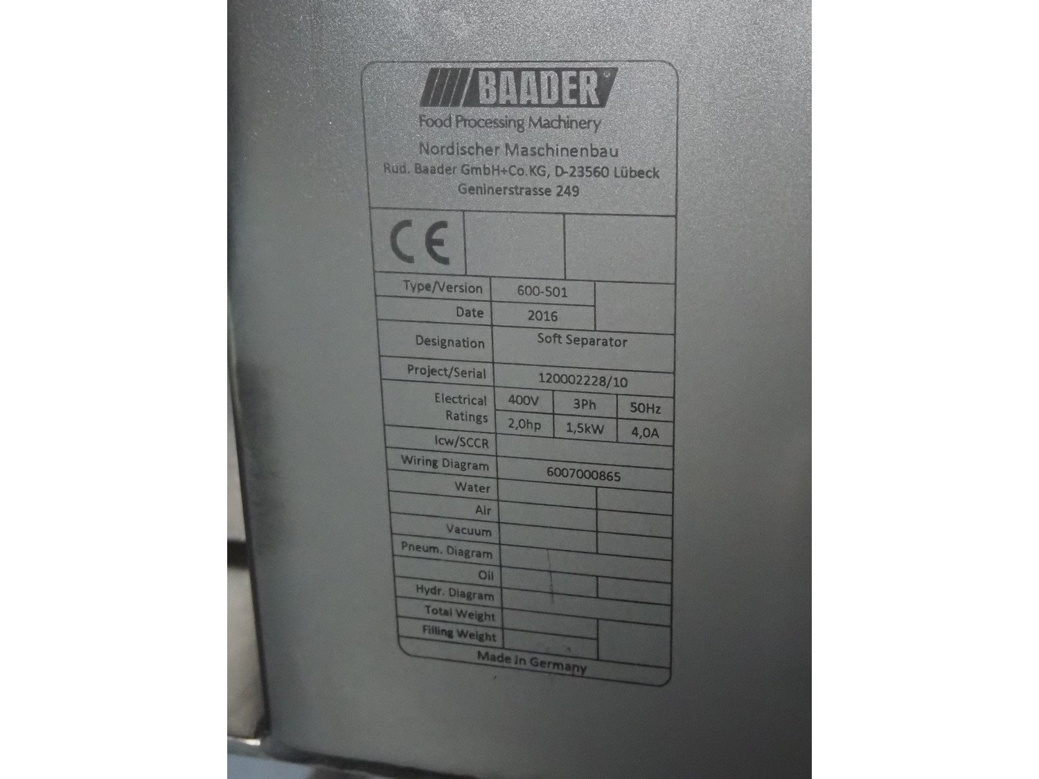 Baader separator, type: 600/501, serial number: 120002228/10, year of construction: 2016, 400 V, 3 Ph, 50 Hz, 4.0 A, 1.5 kW, plastic belt, belt width: 180 mm, diameter output: 190 mm, diameter perforations: 5 mm, total dimensions: 1050 mm x 850 mm x 1170 mm. Kavel locatie: Lipsko 241, 22-400 Zamość, Polen
