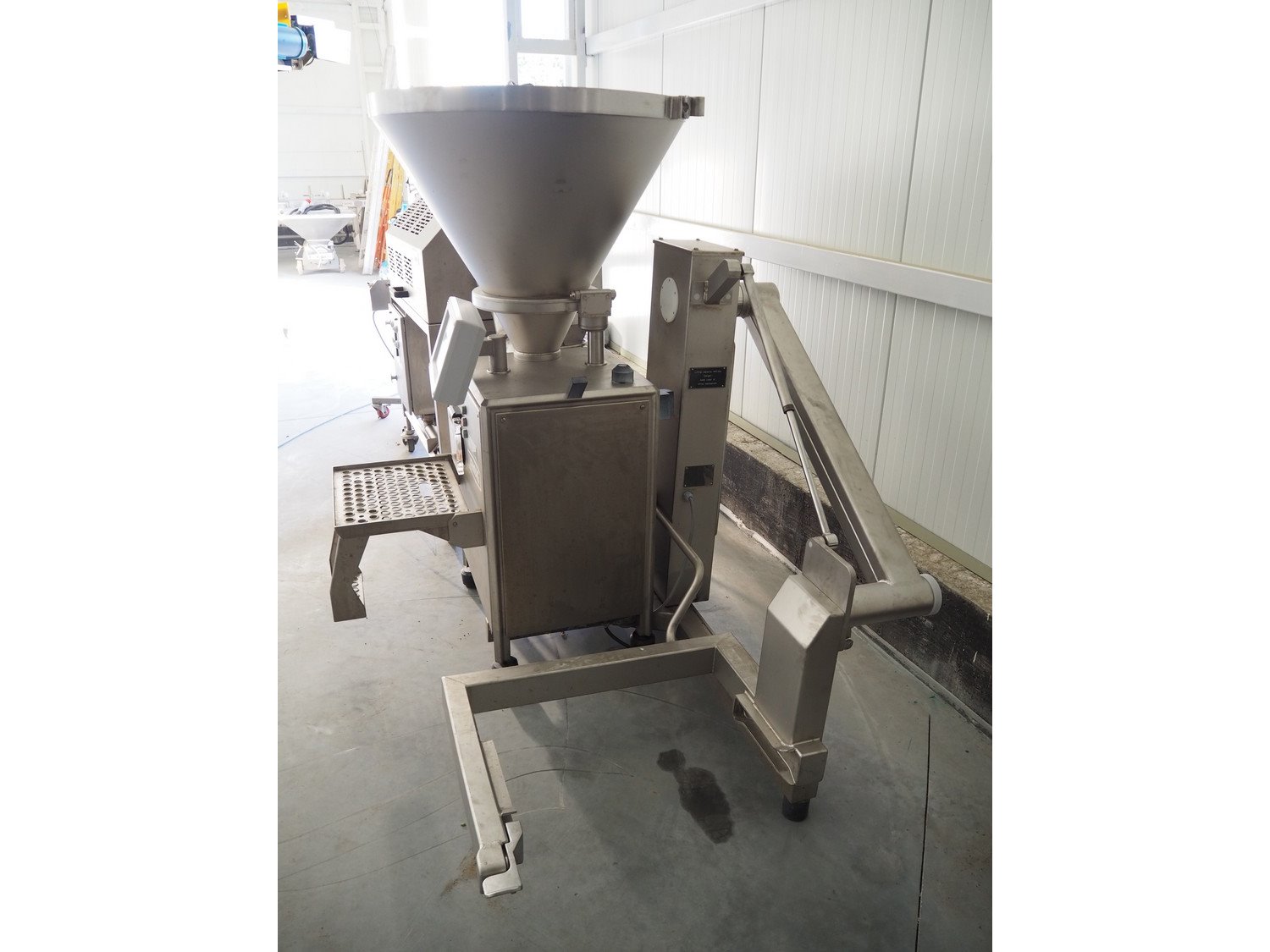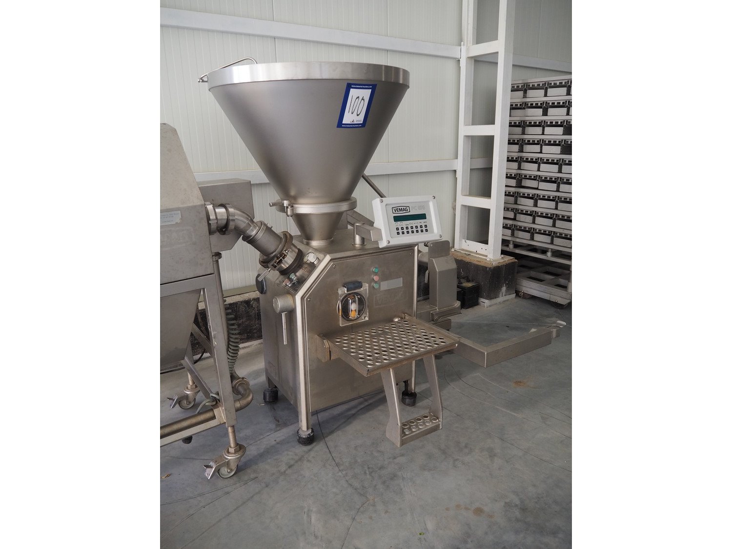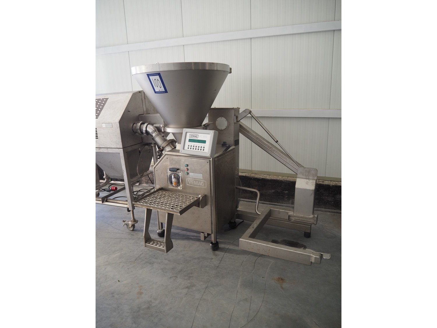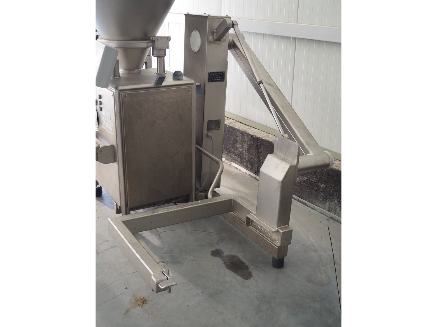 Vemag Maschinenbau GmbH vacuum filling machine with lifter for 200 liter meat bins, model: Robot 500, number: 128 4466, year of construction: 2013, 400-460 V, 3 Ph, 50/60 Hz, 13 A, 4.9 kW, dimensions: 1800 mm x 1300 mm x 1810 mm. Including s/s tool trolley, dimensions: 1100 mm x 650 mm x 1050 mm. Kavel locatie: Lipsko 241, 22-400 Zamość, Polen