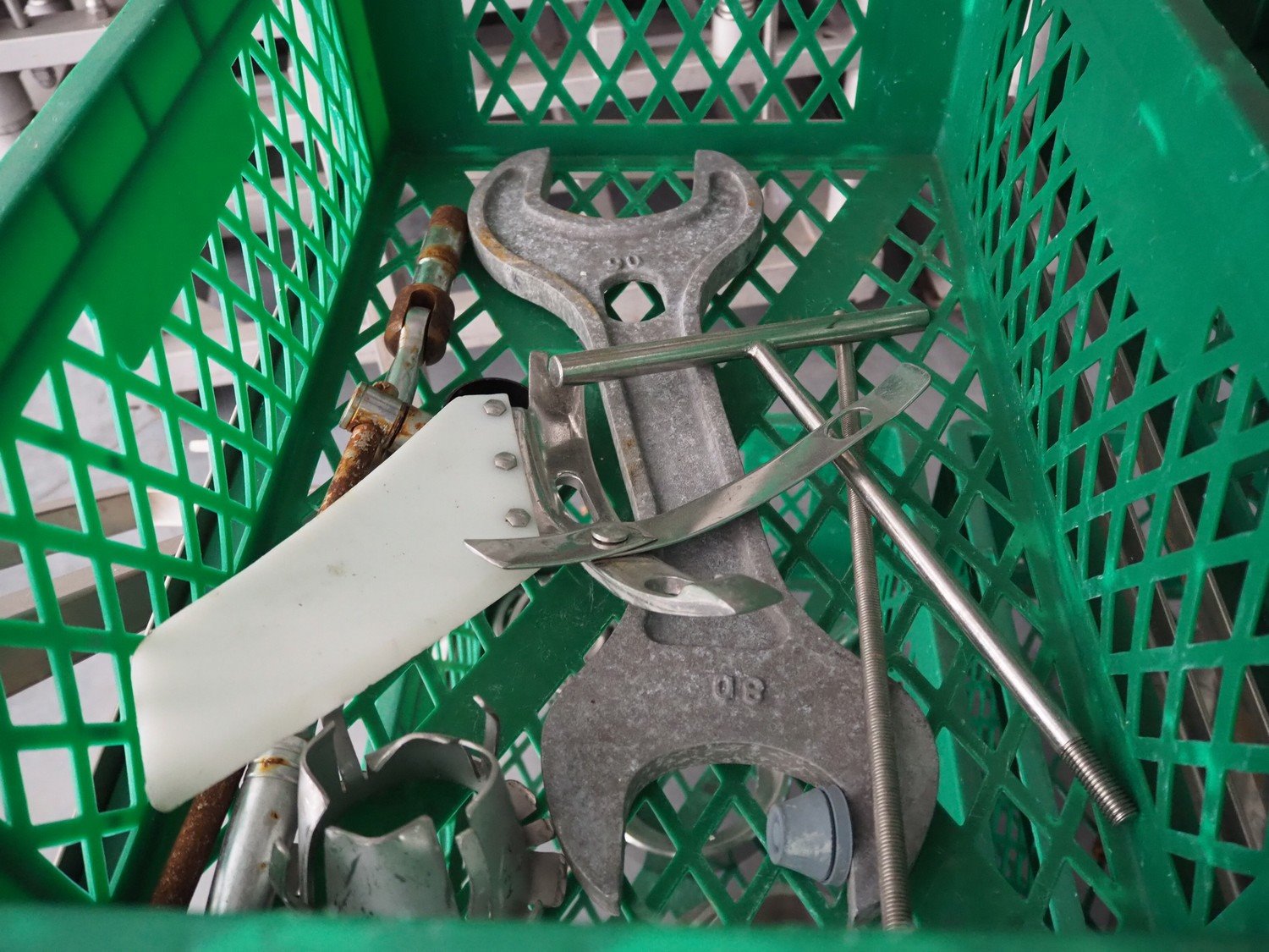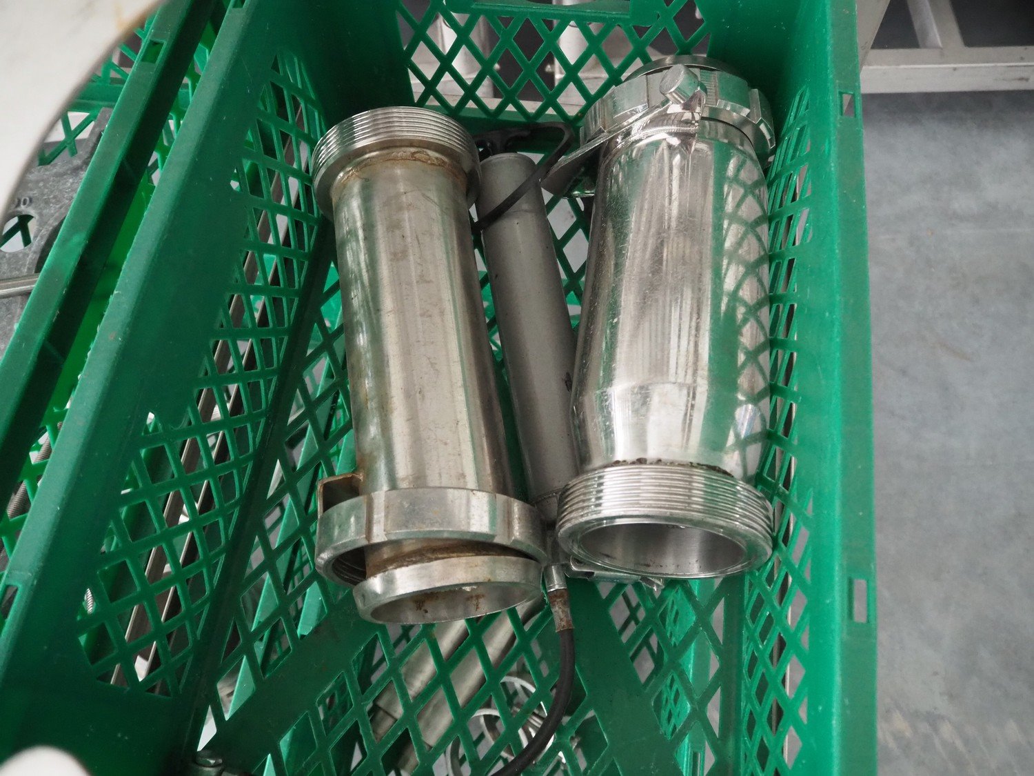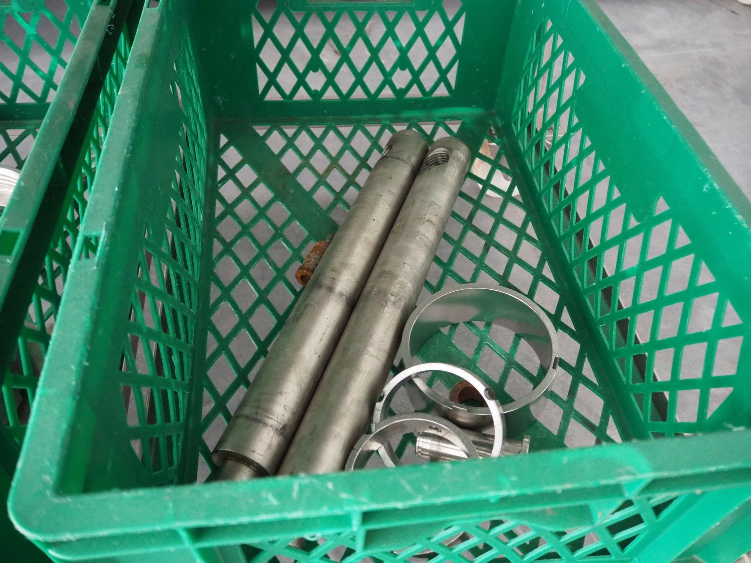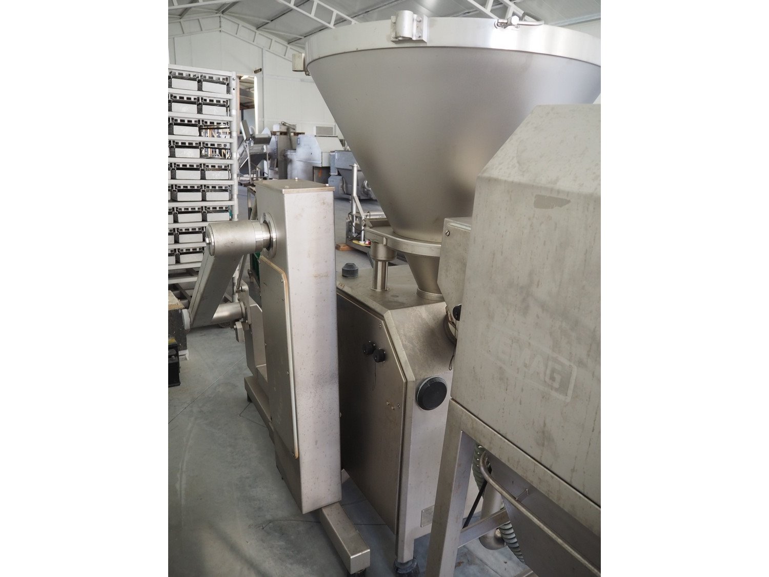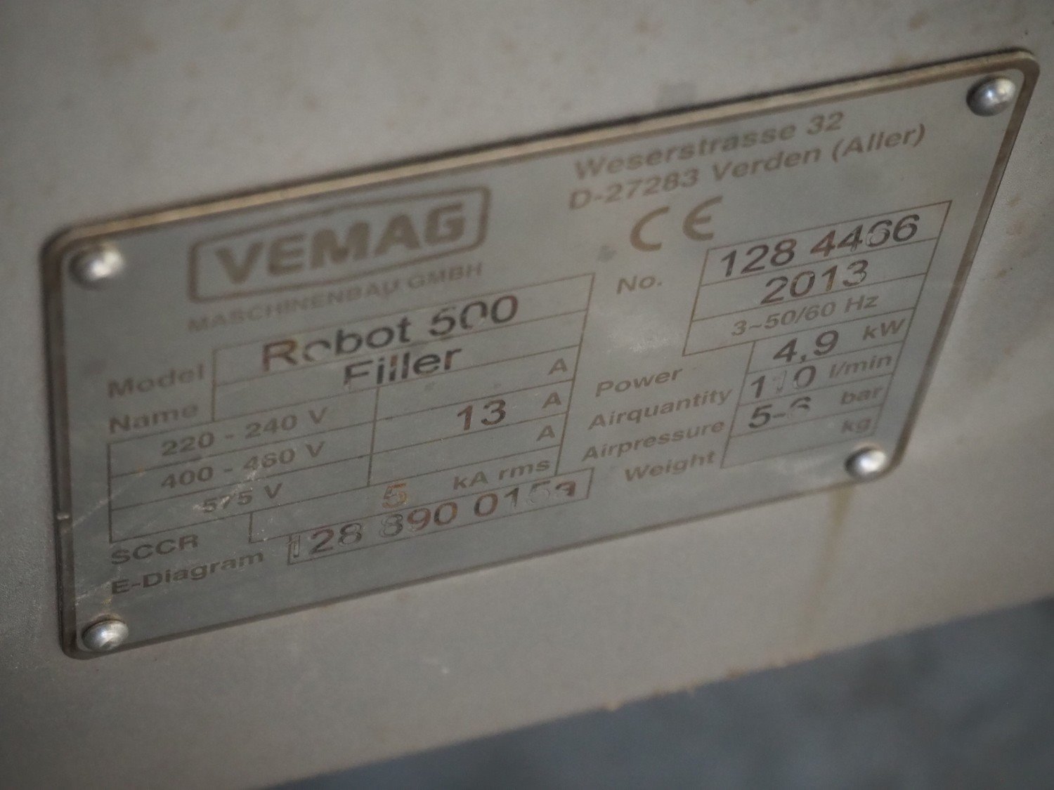 Vemag Maschinenbau GmbH vacuum filling machine with lifter for 200 liter meat bins, model: Robot 500, number: 128 4466, year of construction: 2013, 400-460 V, 3 Ph, 50/60 Hz, 13 A, 4.9 kW, dimensions: 1800 mm x 1300 mm x 1810 mm. Including s/s tool trolley, dimensions: 1100 mm x 650 mm x 1050 mm. Kavel locatie: Lipsko 241, 22-400 Zamość, Polen