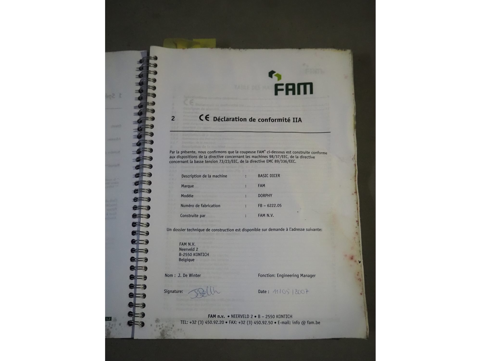 FAM dicer, type: CHD-3D, serial number: 4362, year of construction: 1999, 380 V, 3 Ph, 50 Hz, 7.5 kW, weight: 475 kg, working width: 220 mm, total dimensions: 1500 mm x 1300 mm x 2050 mm. Kavel locatie: Lipsko 241, 22-400 Zamość, Polen