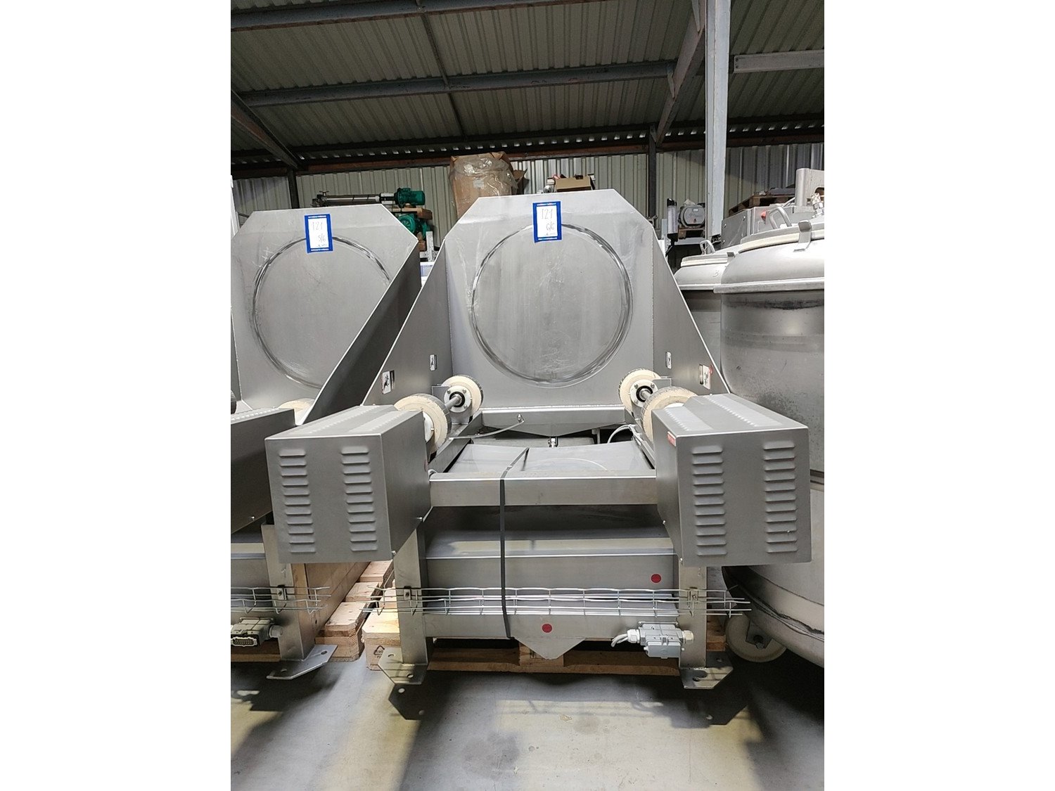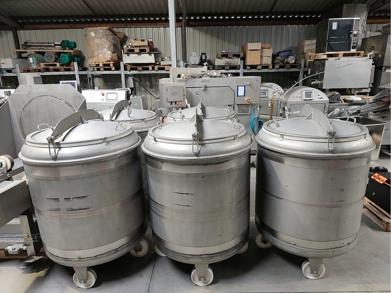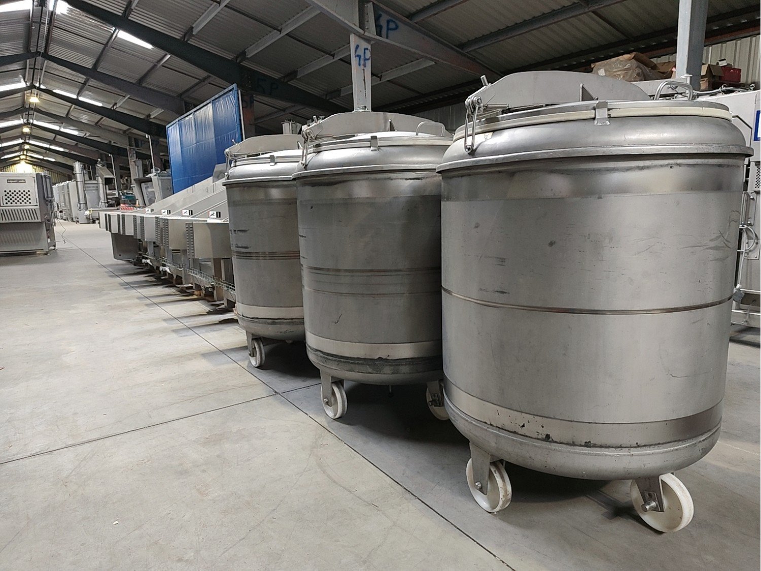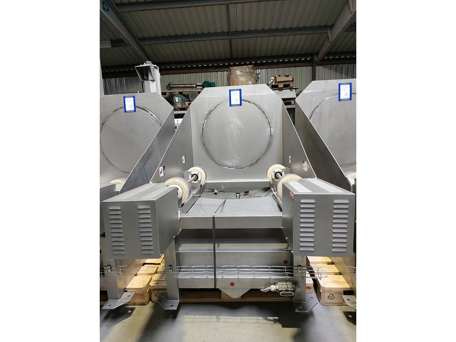 Inject Star vacuum tumblers, model: HS 5, capacity: 500 liter, weight of raw material: 250-350 kg, voltage: 400 V, 3 Ph, 50 Hz, turnover regulation: Mechanical, vacuum tumbler weight: 700 kg. Five removable barrels in the set. Kavel locatie: Lipsko 241, 22-400 Zamość, Polen