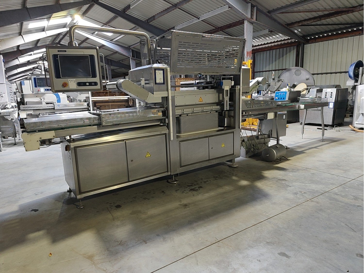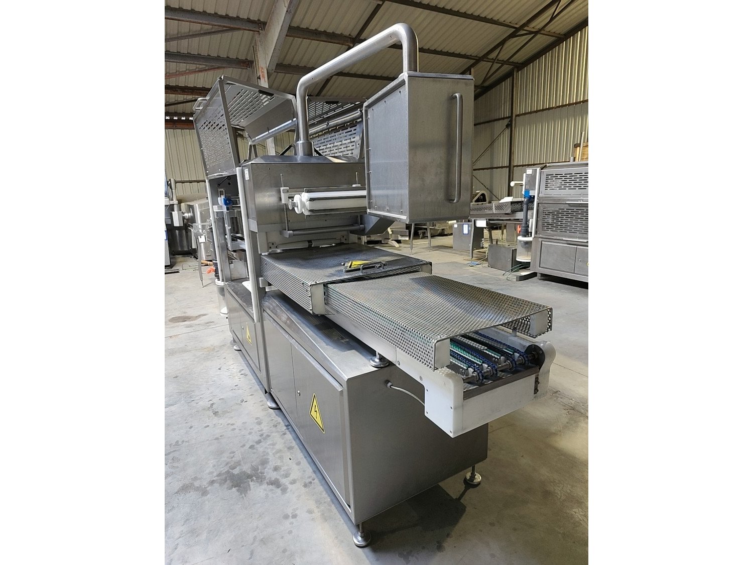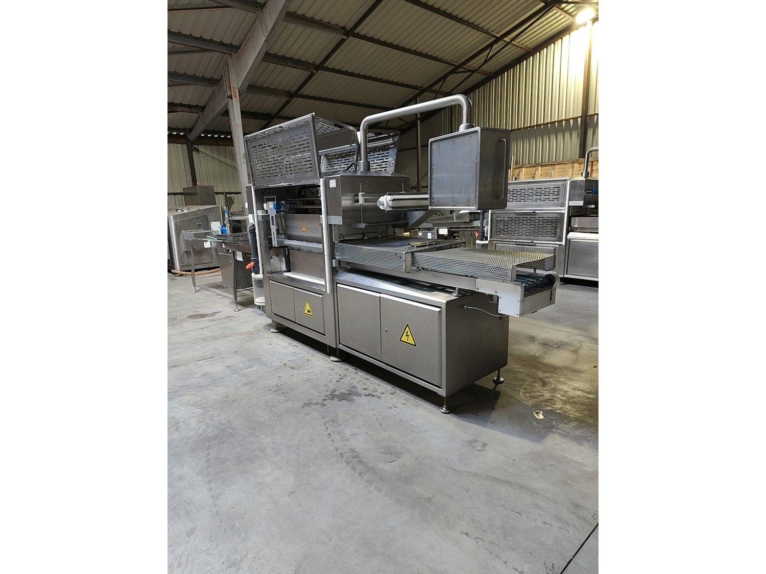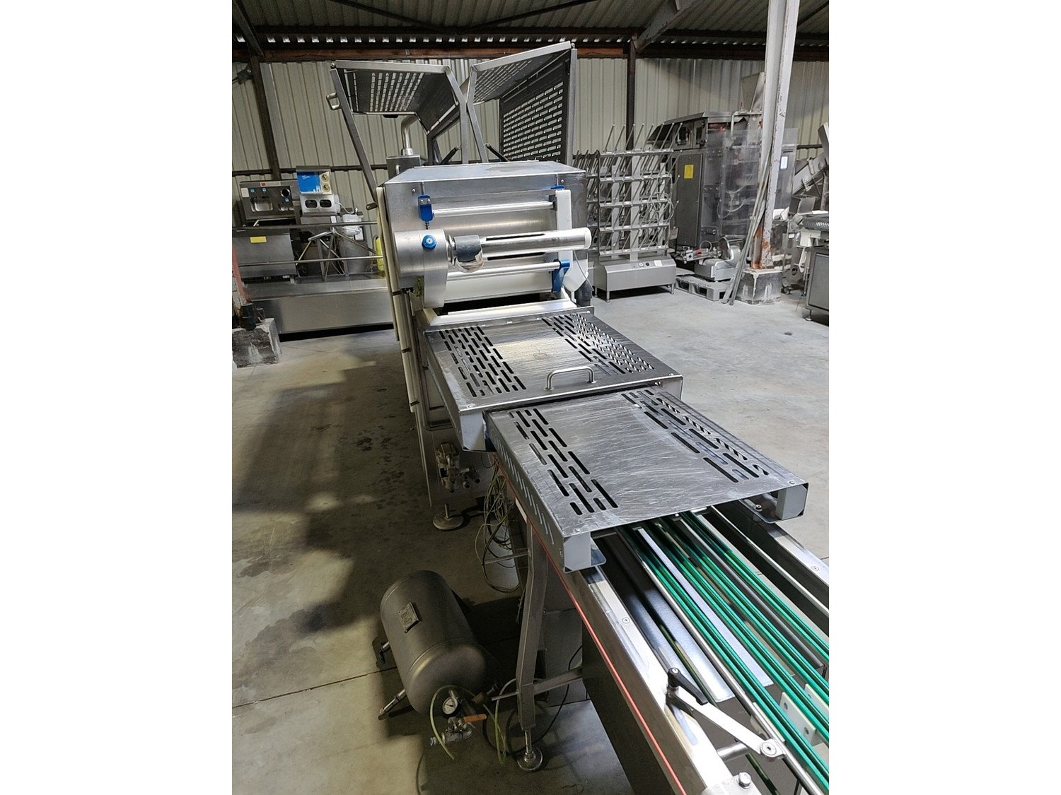 Sealpac traysealer, model: 800+, serial number: TVG 01 1124 01, year of construction: 2004, 400 / 230 V, 3 Ph, 50 Hz, 10 kW, weight: 2000 kg, dye dimensions: (6x) 170 mm x 130 mm, total dimensions: 6600 mm x 900 mm x 2200 mm. Including trolley for dyes, dimensions 1600 mm x 1000 mm x 1400 mm. Kavel locatie: Lipsko 241, 22-400 Zamość, Polen