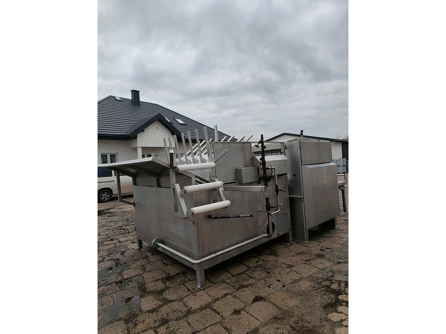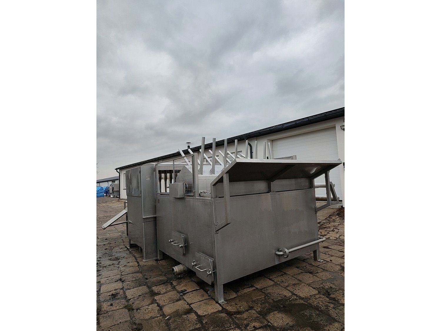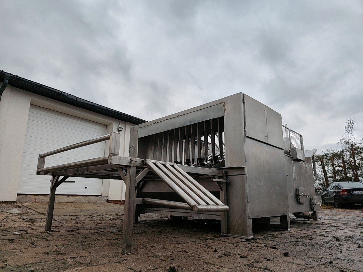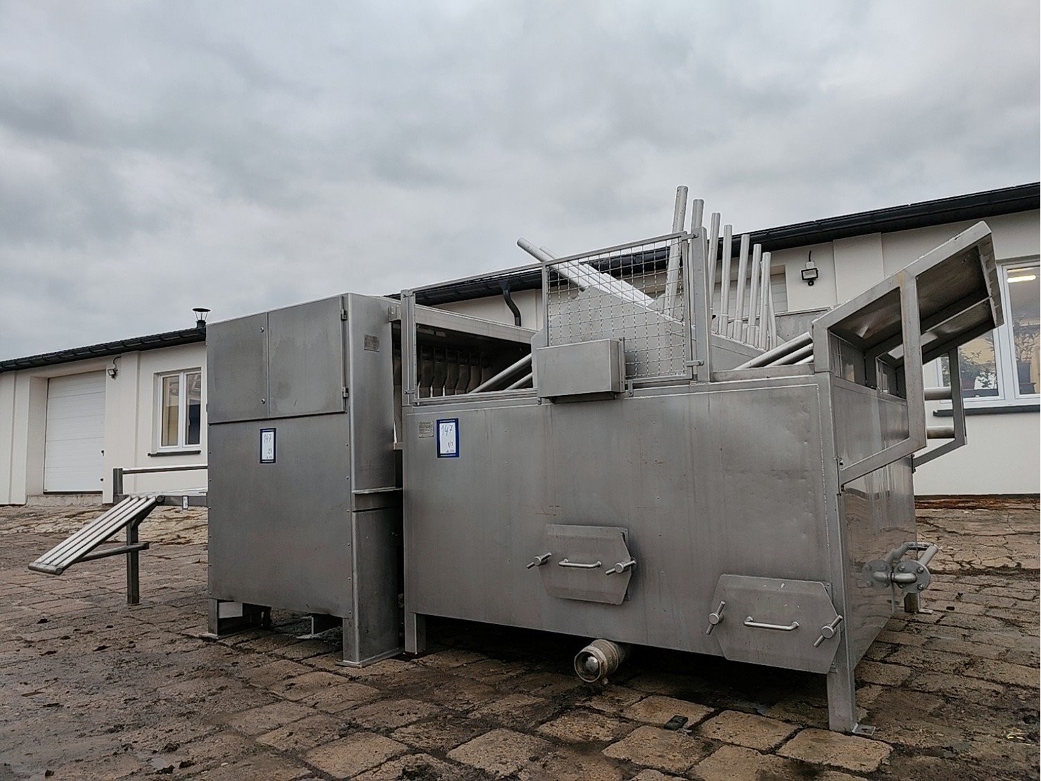 Pekmont immersion scalder and dehairer line, consisting of: Pekmont immersion scalder, type OP-3p, number: 28, year of construction: 2010, 400 V, 2.2kW, weight: 1450 kg, dimensions: 3300 mm x 2800 mm x 2300 mm. Pekmont dehairer, type: SP-1, number: 24, year of construction: 2010, 400 V, 11 kW, weight: 2100 kg, dimensions: 2800 mm x 1500 mm x 2100 mm. S/s table, dimensions: 2200 mm x 1750 mm x 1050 mm. Kavel locatie: Lipsko 241, 22-400 Zamość, Polen