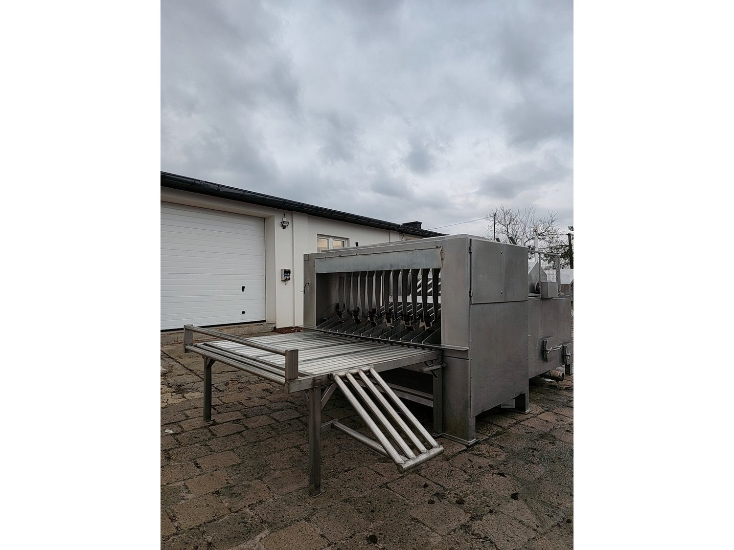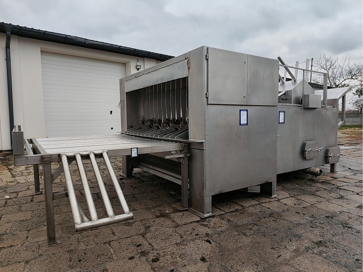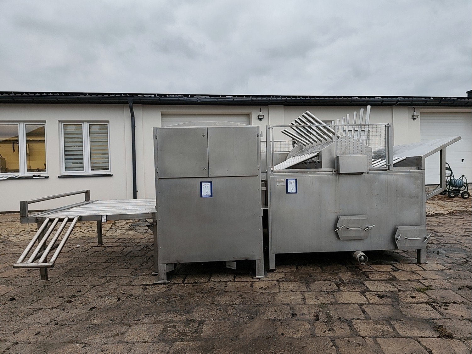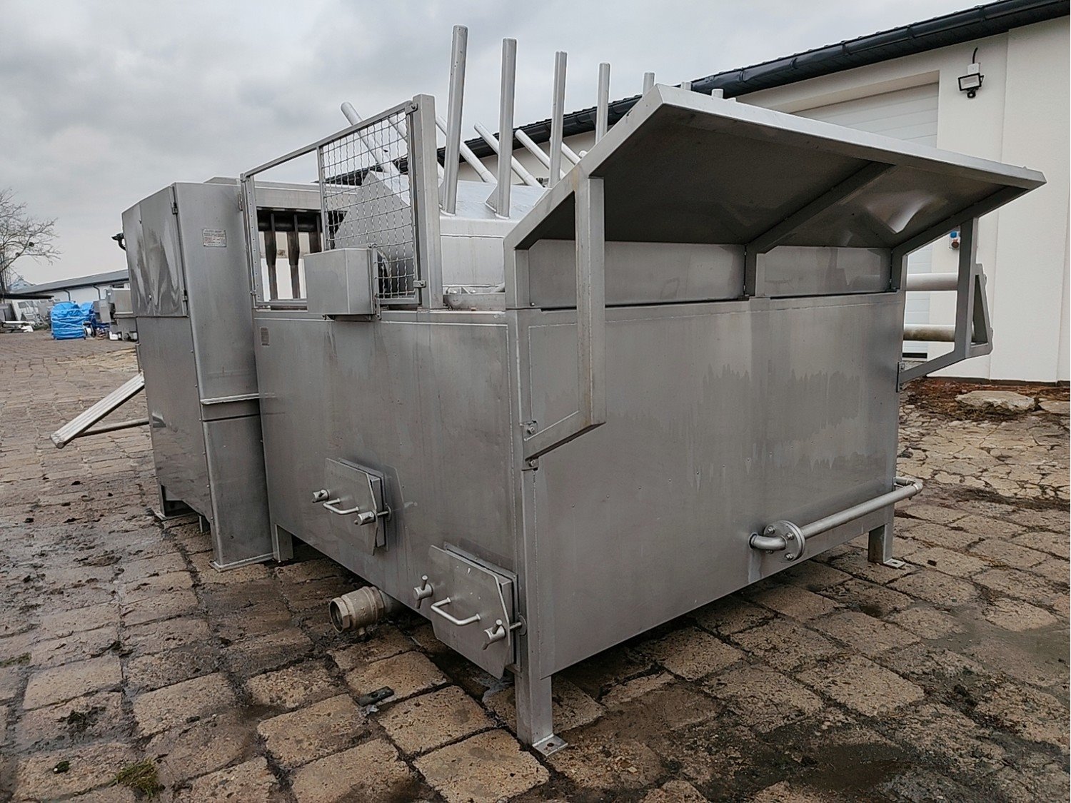 Pekmont immersion scalder and dehairer line, consisting of: Pekmont immersion scalder, type OP-3p, number: 28, year of construction: 2010, 400 V, 2.2kW, weight: 1450 kg, dimensions: 3300 mm x 2800 mm x 2300 mm. Pekmont dehairer, type: SP-1, number: 24, year of construction: 2010, 400 V, 11 kW, weight: 2100 kg, dimensions: 2800 mm x 1500 mm x 2100 mm. S/s table, dimensions: 2200 mm x 1750 mm x 1050 mm. Kavel locatie: Lipsko 241, 22-400 Zamość, Polen