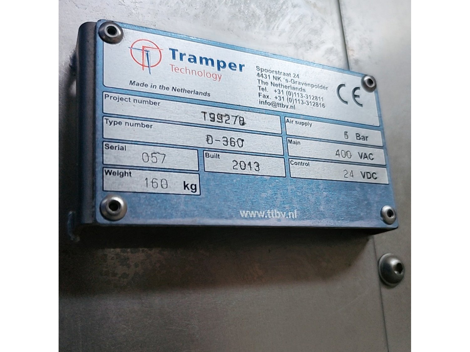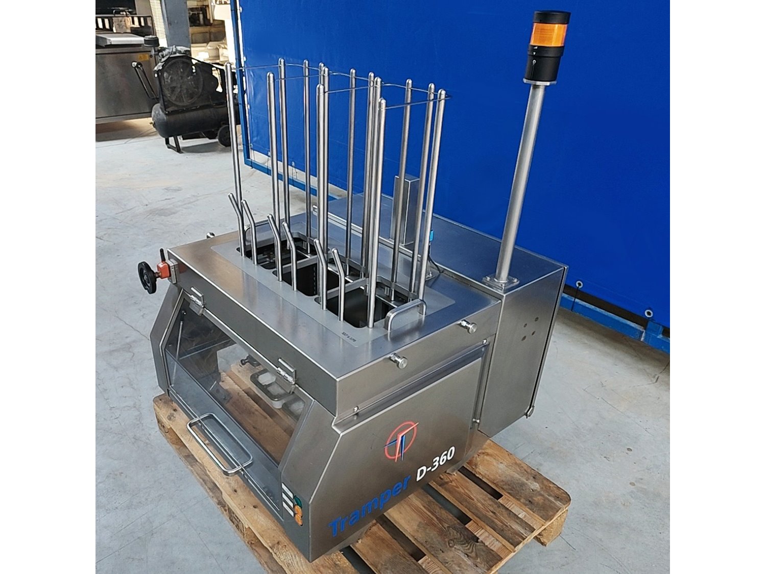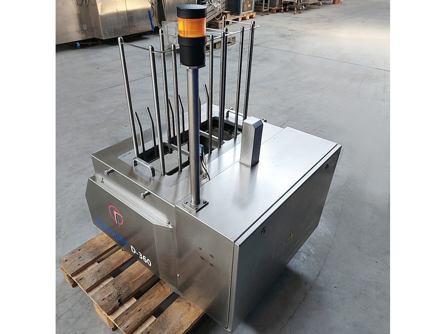 Tramper denester, type: D-360, serial number: 057, year of construction: 2013, 400 Vac, 6 bar, 160 kg, dimensions tray: (3x) 200 mm x 145 mm, total dimensions: 950 mm x 920 mm x 1400 mm. Kavel locatie: Lipsko 241, 22-400 Zamość, Polen