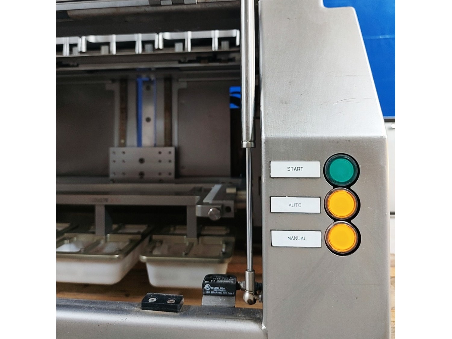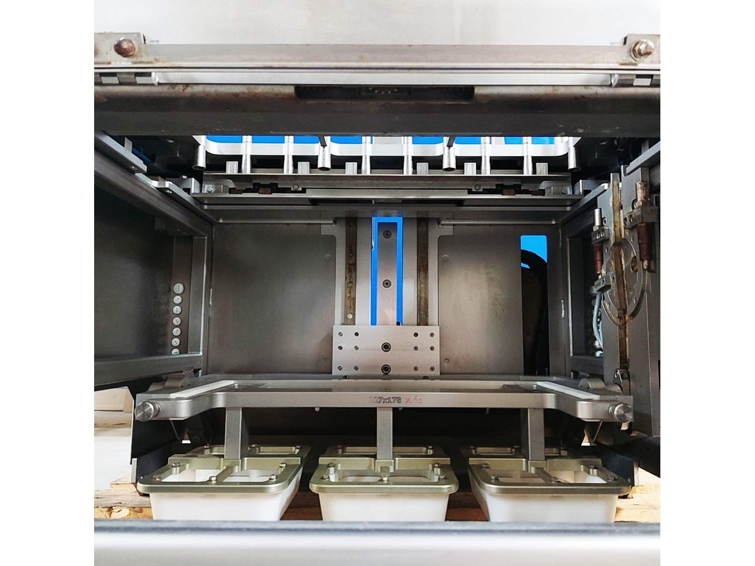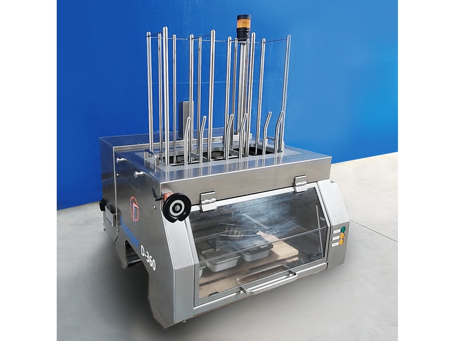 Tramper denester, type: D-360, serial number: 057, year of construction: 2013, 400 Vac, 6 bar, 160 kg, dimensions tray: (3x) 200 mm x 145 mm, total dimensions: 950 mm x 920 mm x 1400 mm. Kavel locatie: Lipsko 241, 22-400 Zamość, Polen