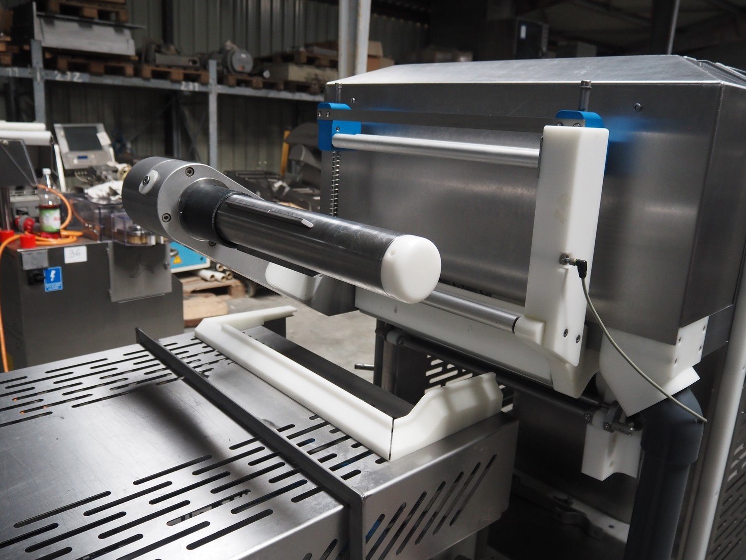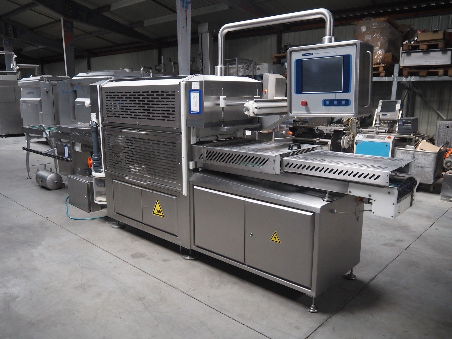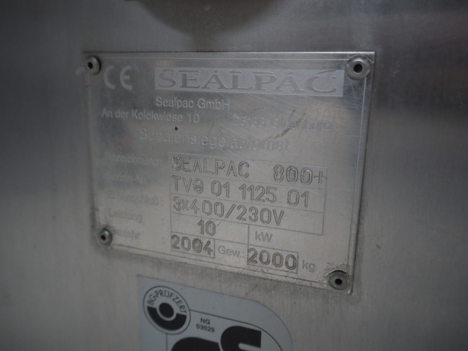 Sealpac GmbH traysealer, type: SEALPAC 800+, serial number: TVG 01 1125 01, year of construction: 2004, 230/400 V, 3 Ph, 10 kW, 2000 kg, chain belt, belt width: 40 mm, clearance: 340 mm x 110 mm, total dimensions: 3600 mm x 1000 mm x 2100 mm. Including outfeed belt, dimensions: 4000 mm x 1000 mm x 1150 mm. Kavel locatie: Lipsko 241, 22-400 Zamość, Polen