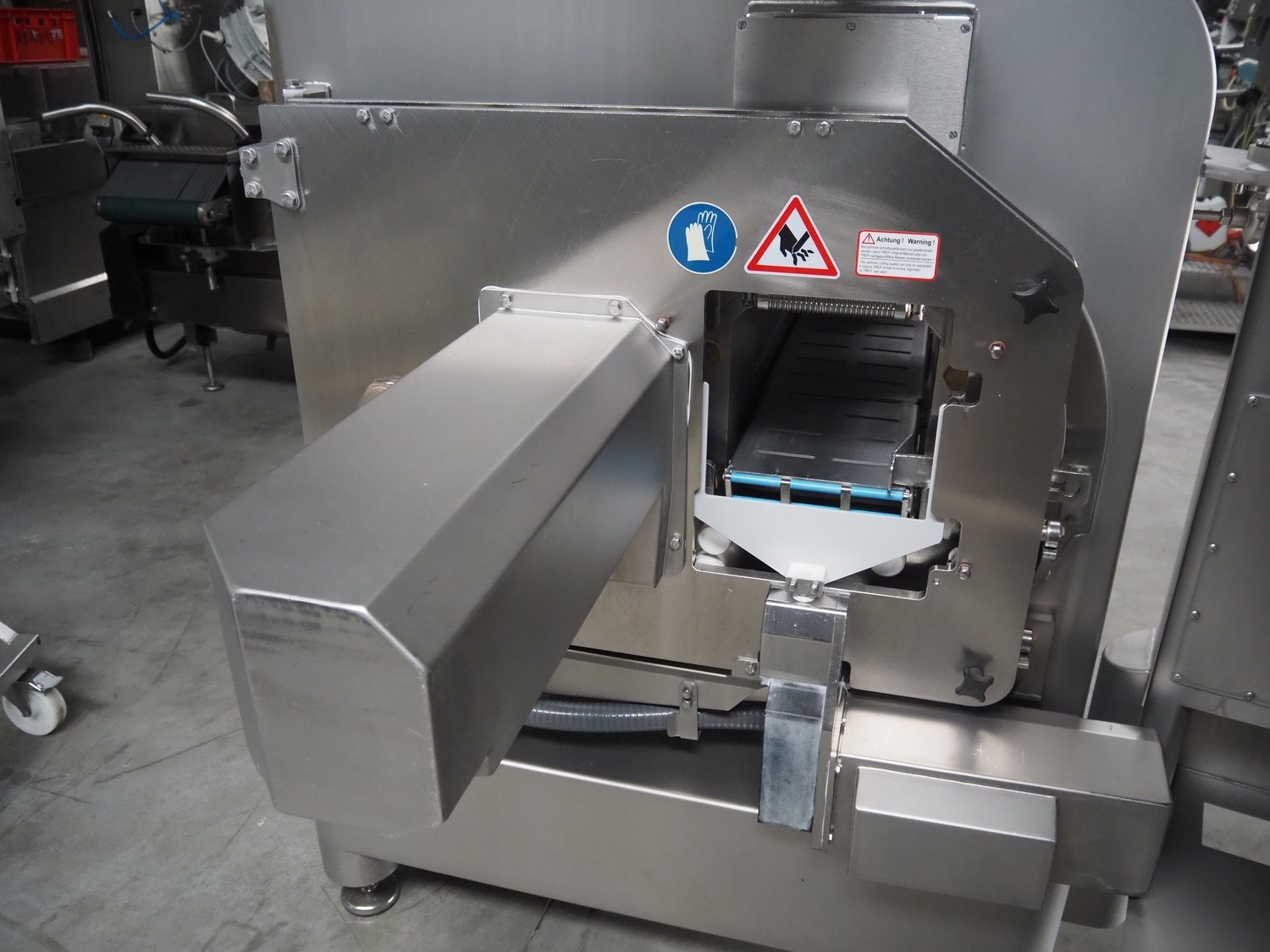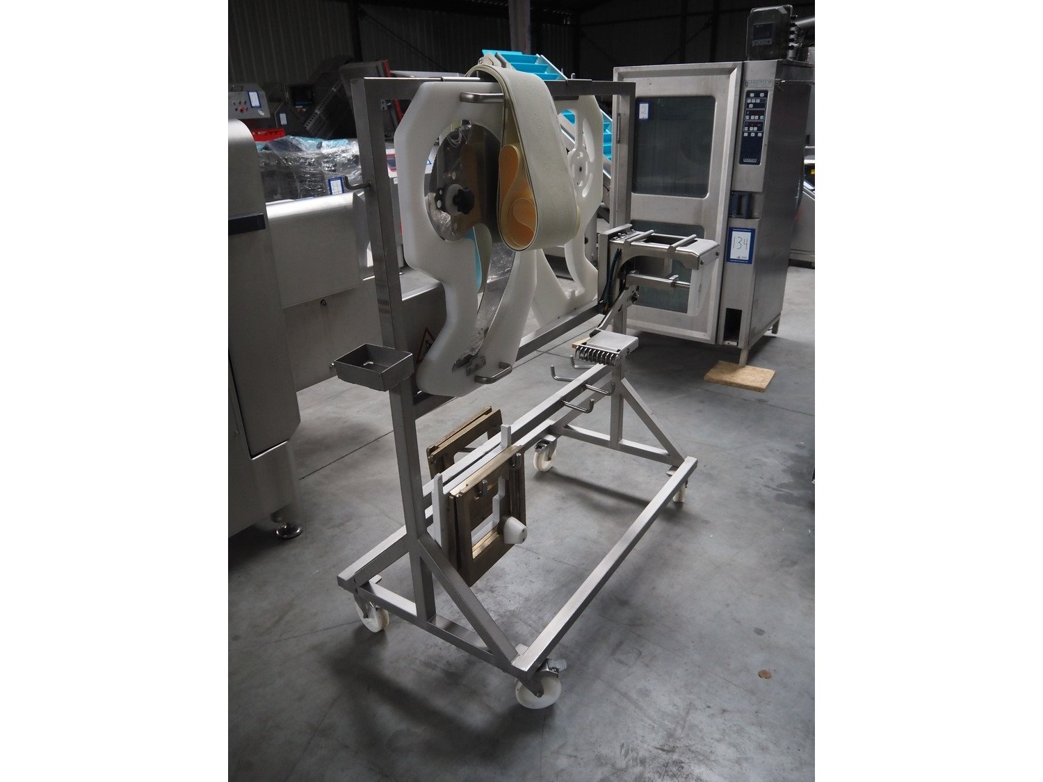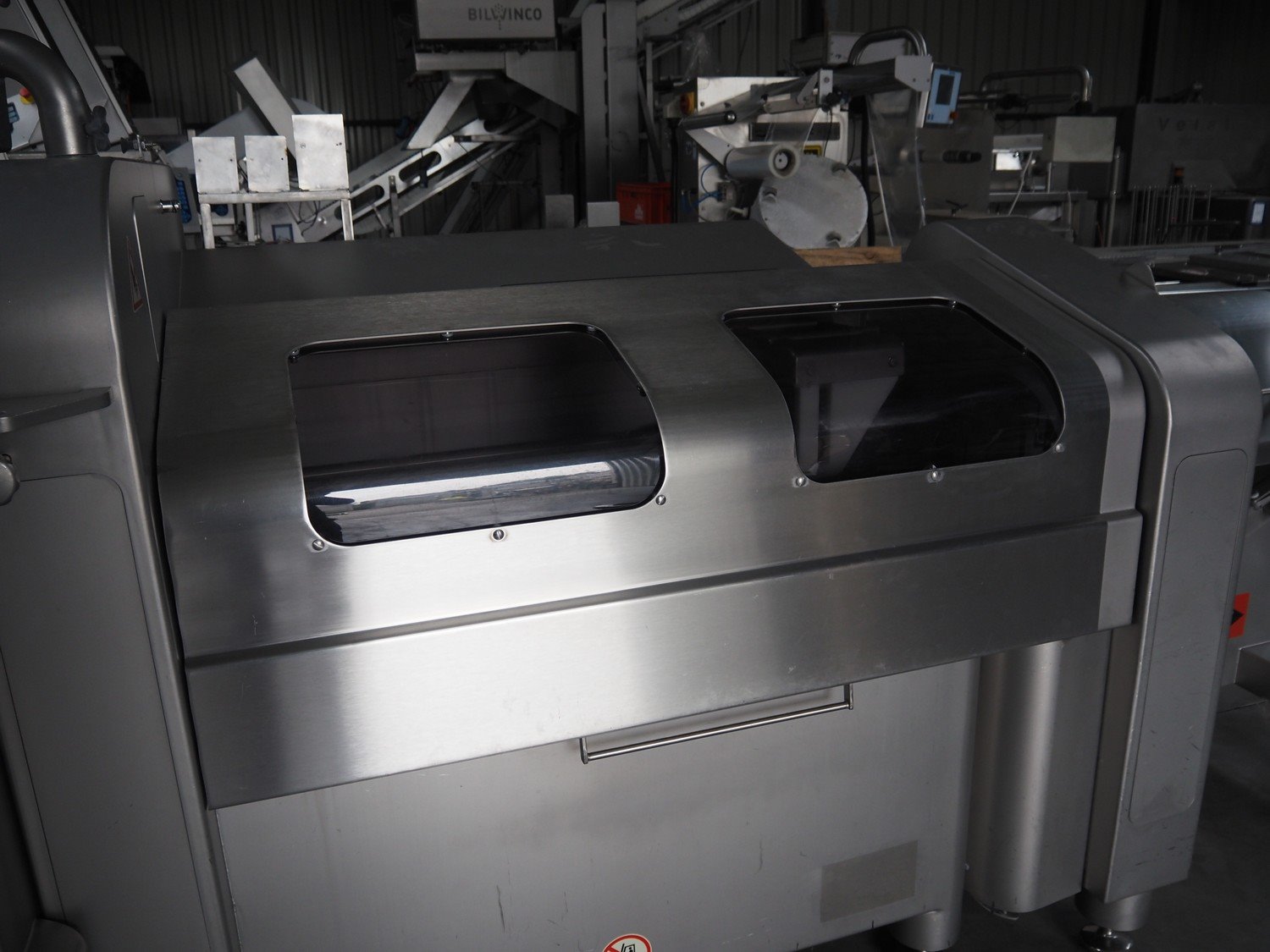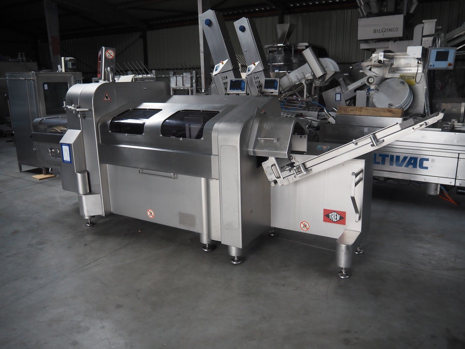 Treif Maschinenbau GmbH slicer and portion cutter, type: FALCON conti, machine number: 461005.154538.109916, year of construction: 2010, 24/380/480 V, 3 Ph, 50/60 Hz, 18/22/32 A, 8.6/11.7 kW, clearance: 260 mm x 220 mm, dimensions: 4300 mm x 1400 mm x 1900 mm. Without belt. Including s/s tool trolley with knife holders, dimensions trolley: 1400 mm x 750 mm x 1600 mm. Kavel locatie: Lipsko 241, 22-400 Zamość, Polen