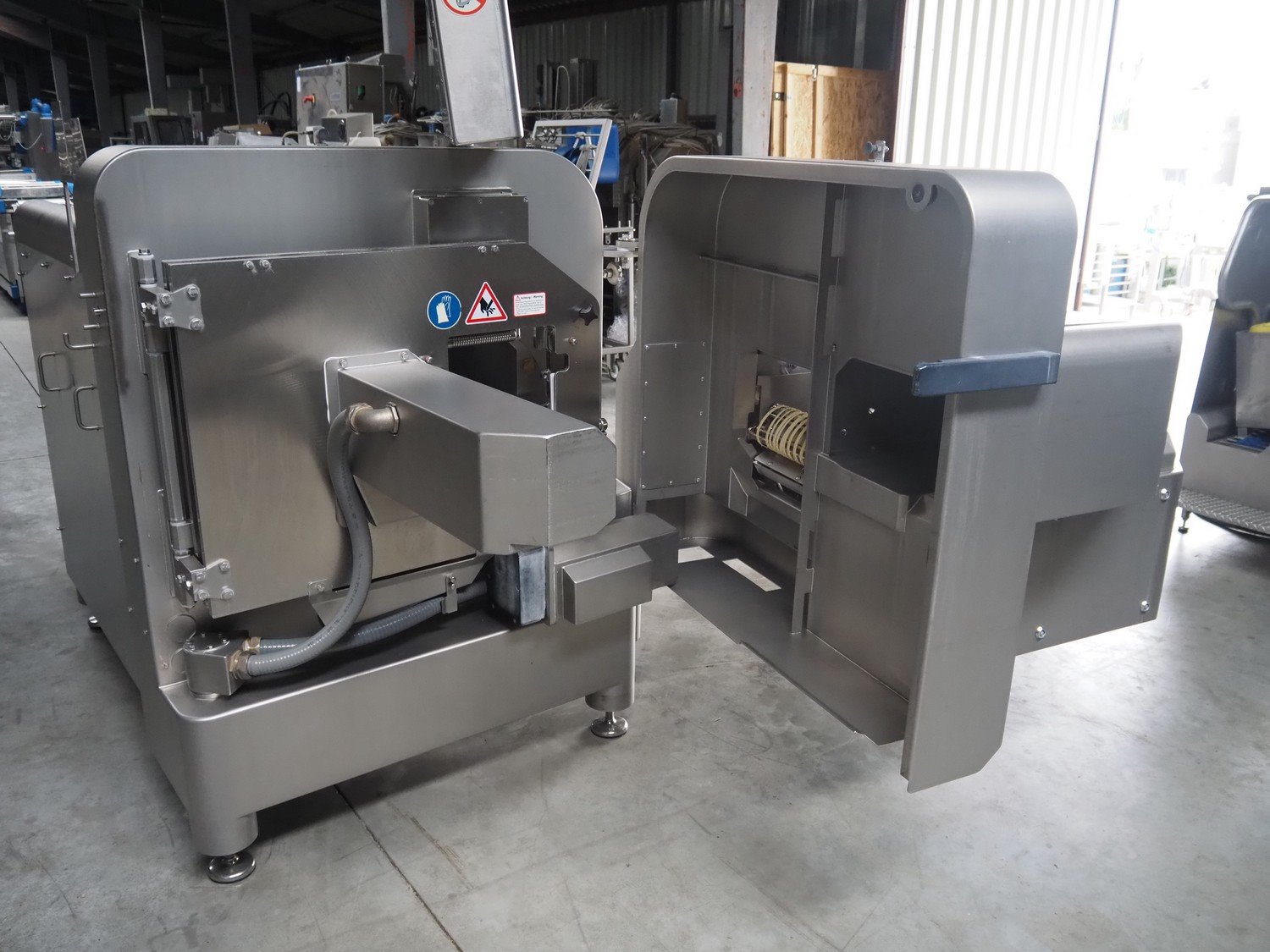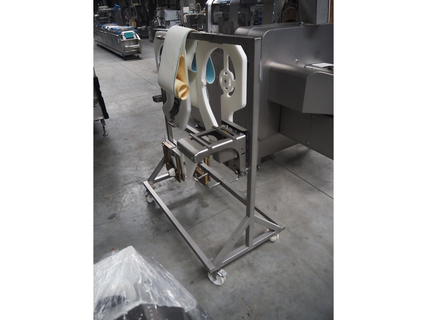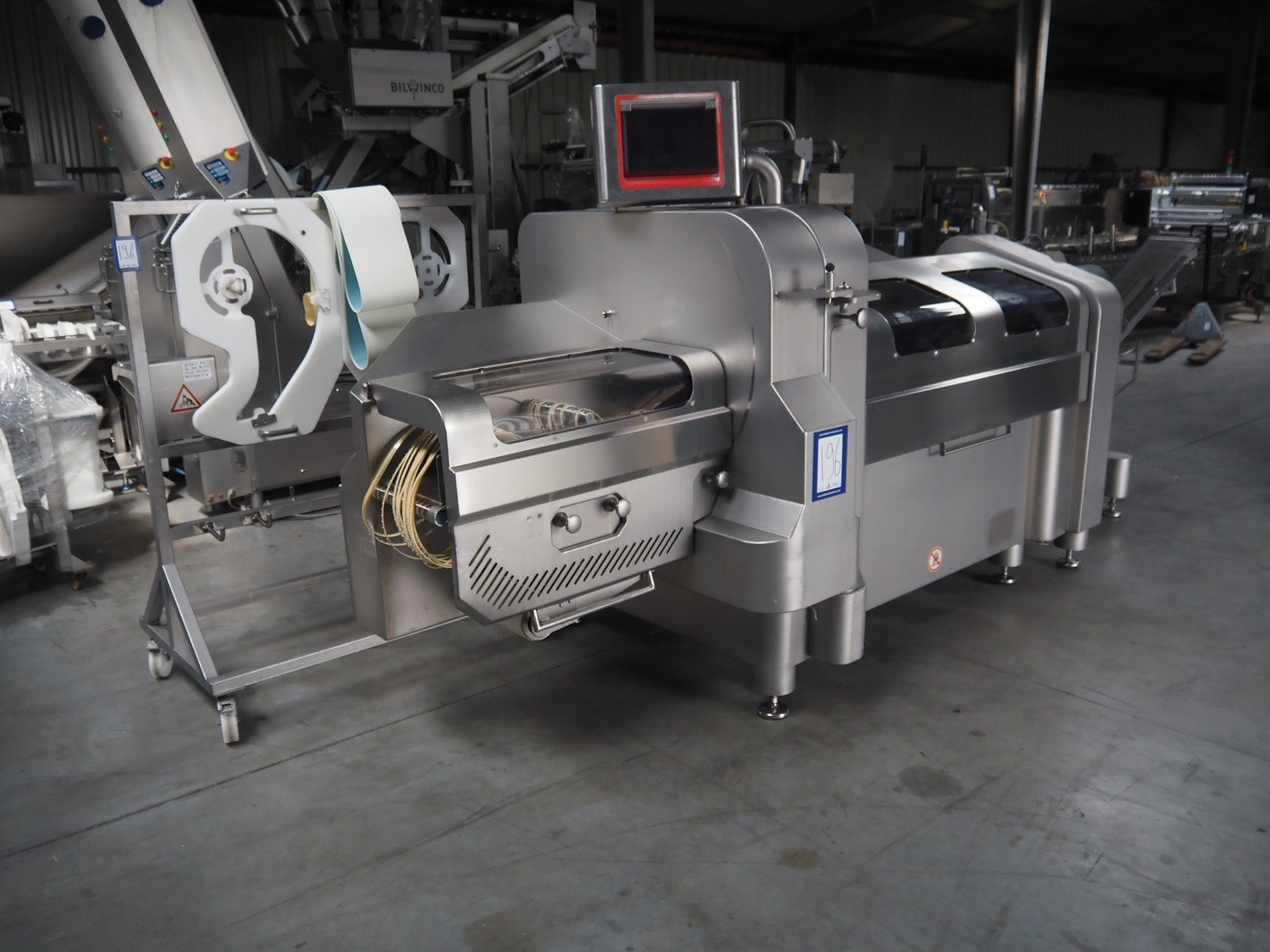 Treif Maschinenbau GmbH slicer and portion cutter, type: FALCON conti, machine number: 461005.154538.109916, year of construction: 2010, 24/380/480 V, 3 Ph, 50/60 Hz, 18/22/32 A, 8.6/11.7 kW, clearance: 260 mm x 220 mm, dimensions: 4300 mm x 1400 mm x 1900 mm. Without belt. Including s/s tool trolley with knife holders, dimensions trolley: 1400 mm x 750 mm x 1600 mm. Kavel locatie: Lipsko 241, 22-400 Zamość, Polen