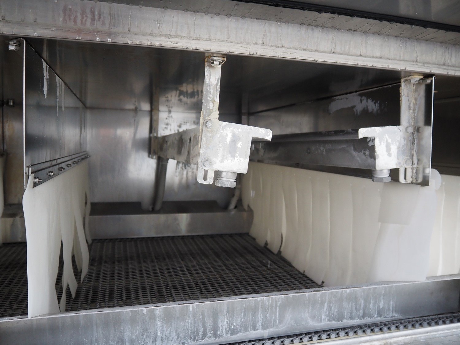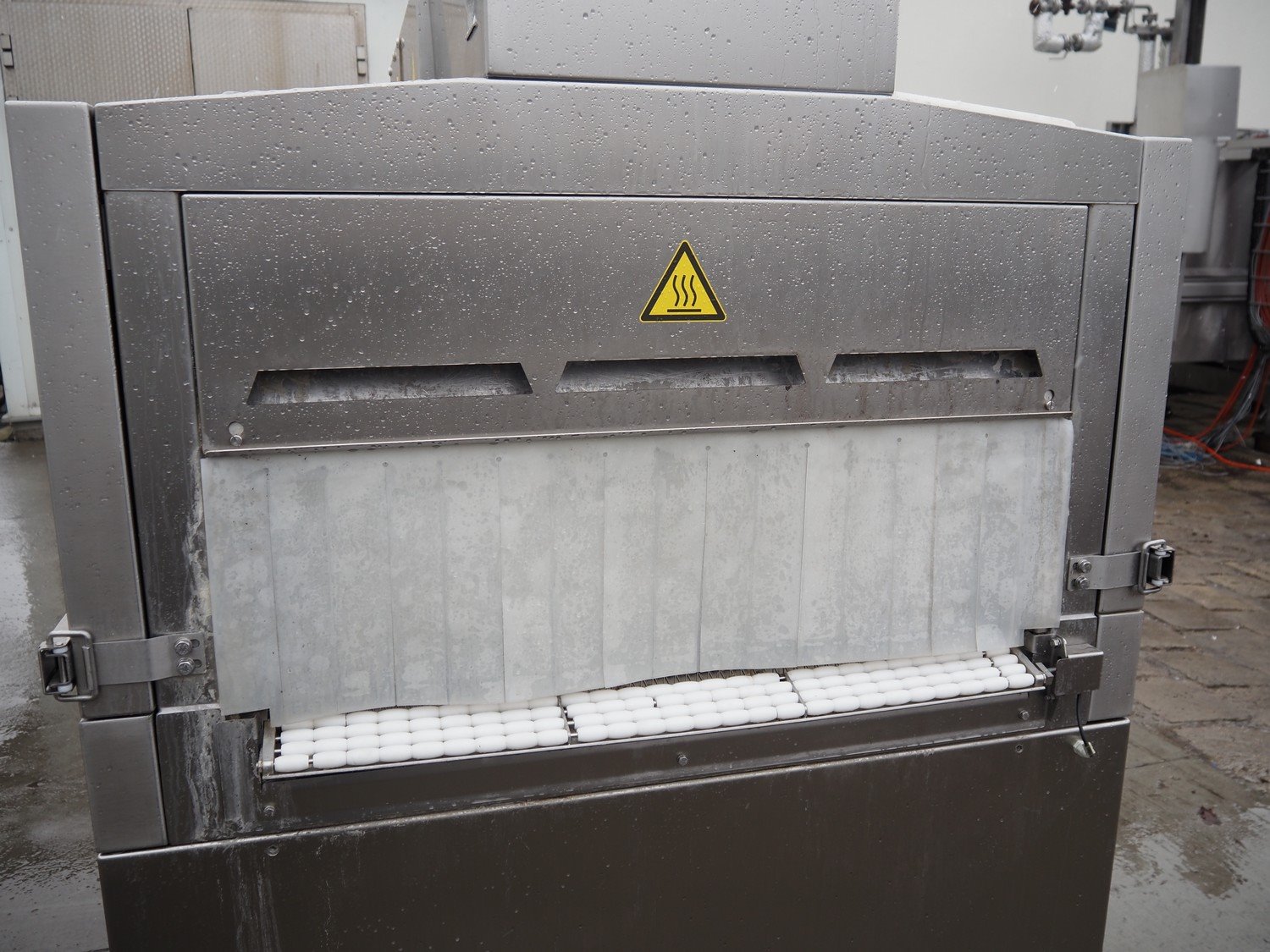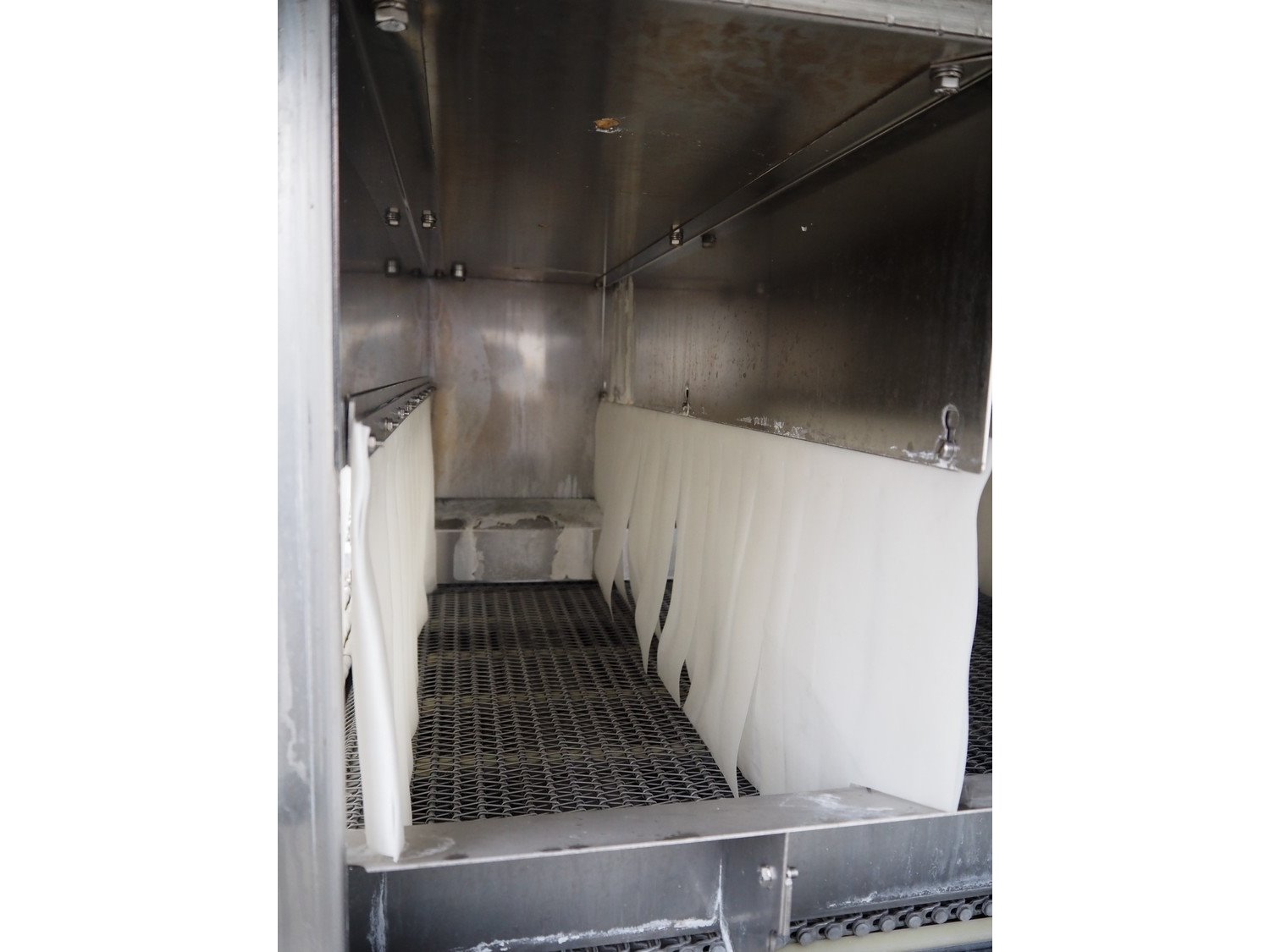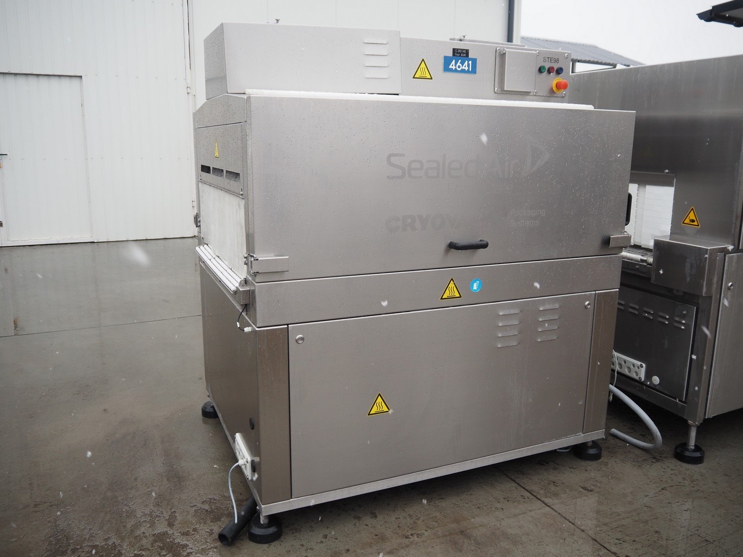 Cryovac shrink tunnel, type: STE98-800, serial number: SN00915, year of construction: 2016, 380-400 V, 3 Ph, 50 Hz, 78 A, 54 kW, 620 kg, s/s mesh belt, belt width: 850 mm, clearance: 825 mm x 275 mm, total dimensions: 1230 mm x 540 mm x 1760 mm. Kavel locatie: Lipsko 241, 22-400 Zamość, Polen