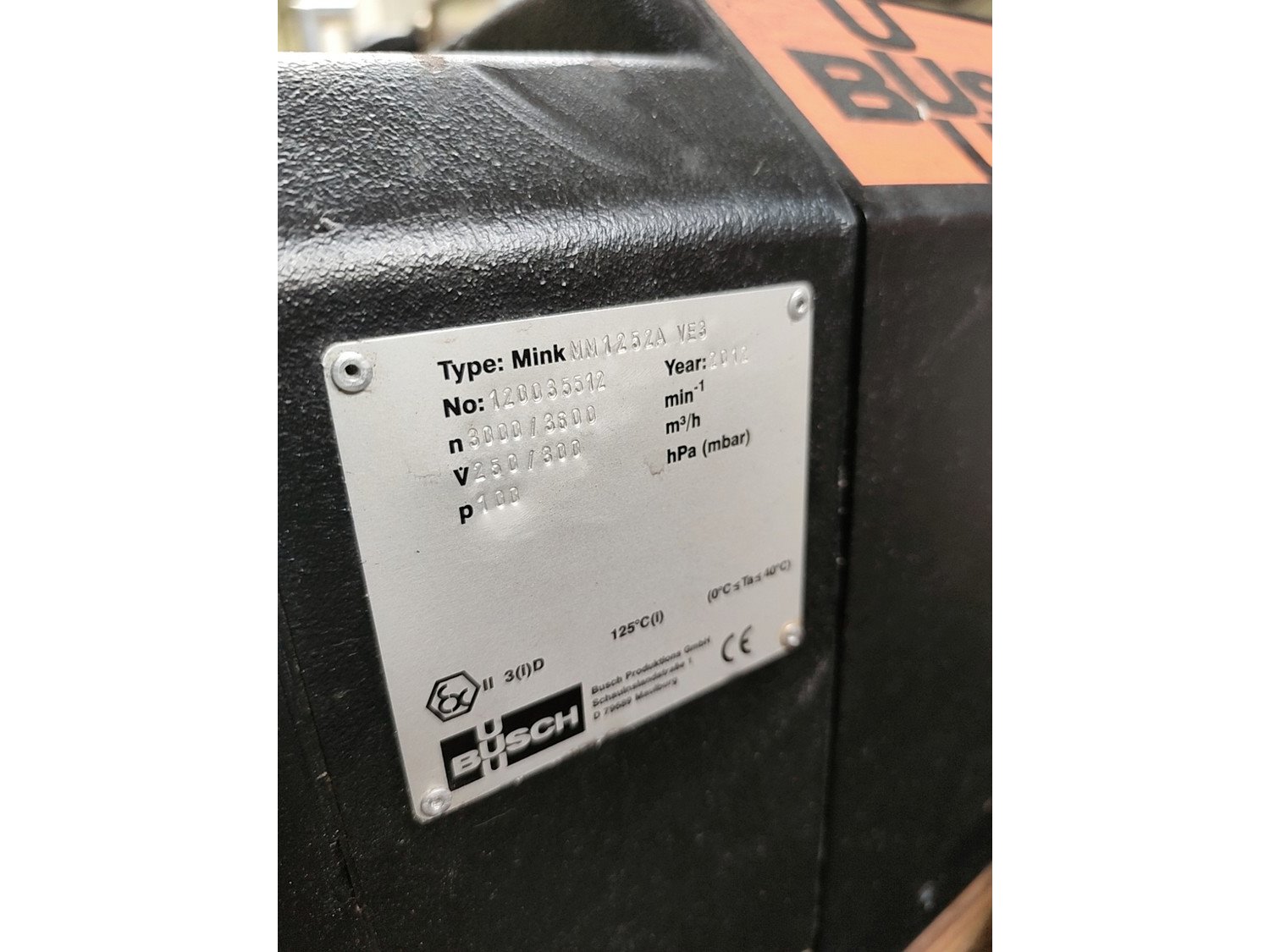 Busch vacuum Pump, type: Mink MM 1252A VE3, serial number: 120035512, year of construction: 2012, 3000/3600 min-1, capacity: 250/300 m3/h, 100hPa (mbar), dimensions: 1200 mm x 520 mm x 850 mm. Kavel locatie: Lipsko 241, 22-400 Zamość, Polen