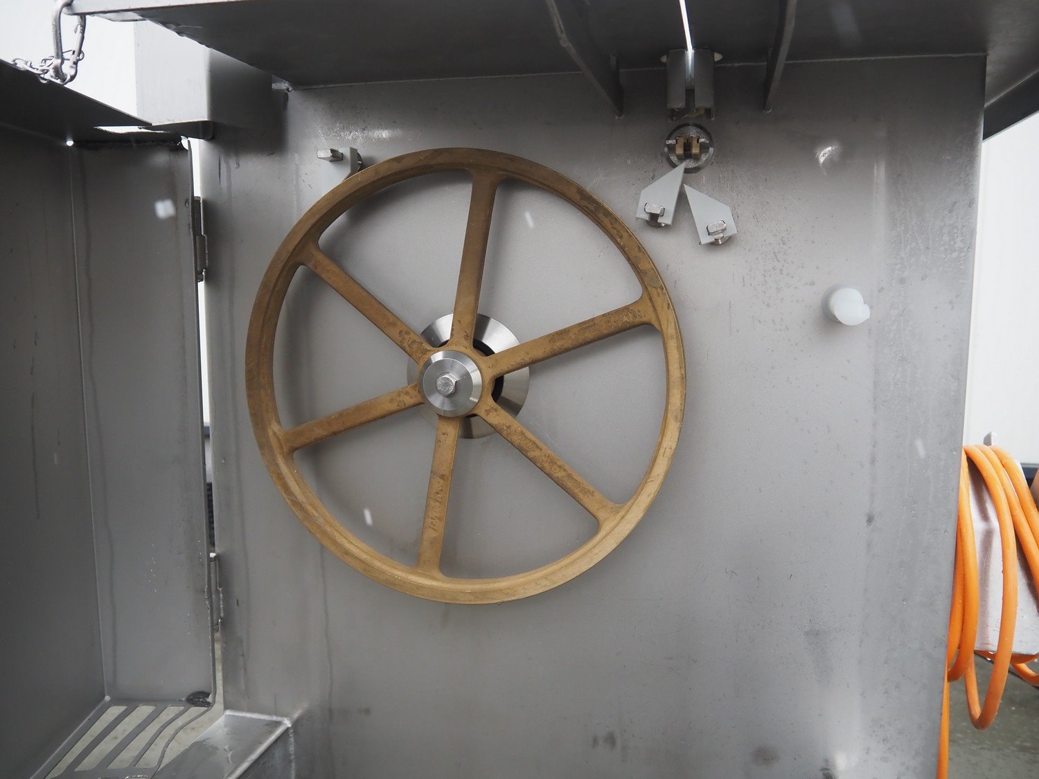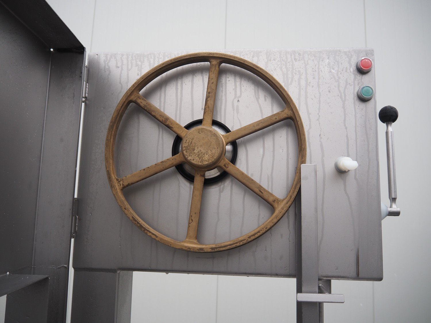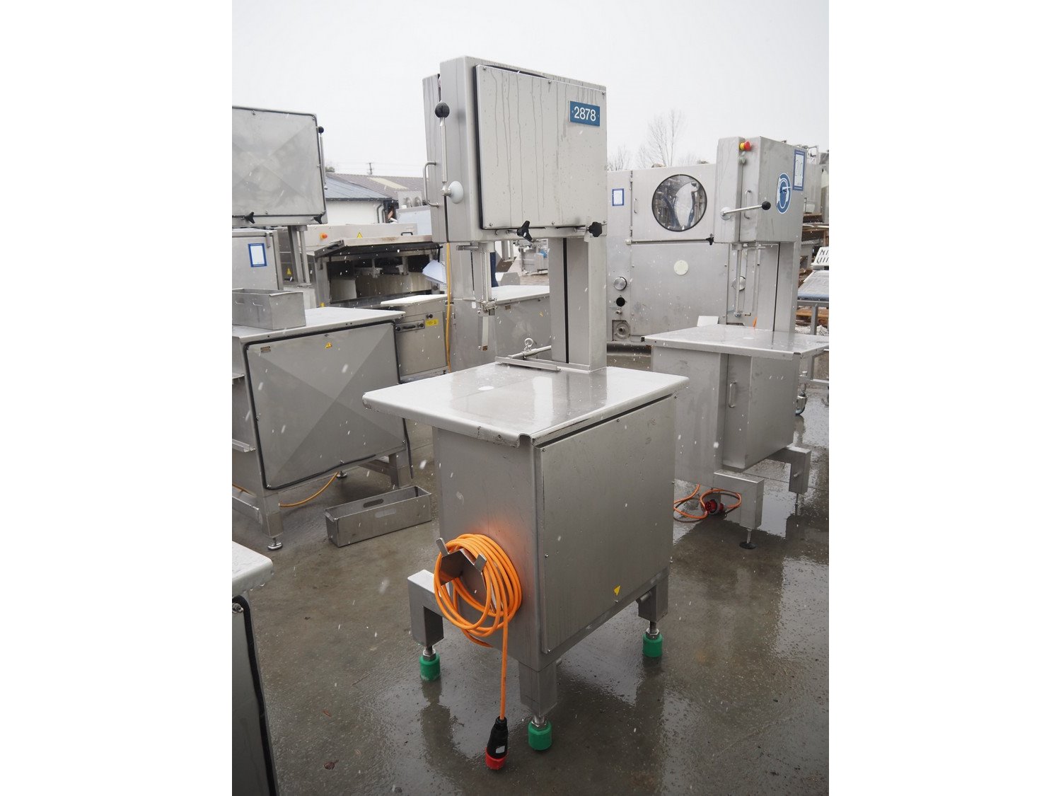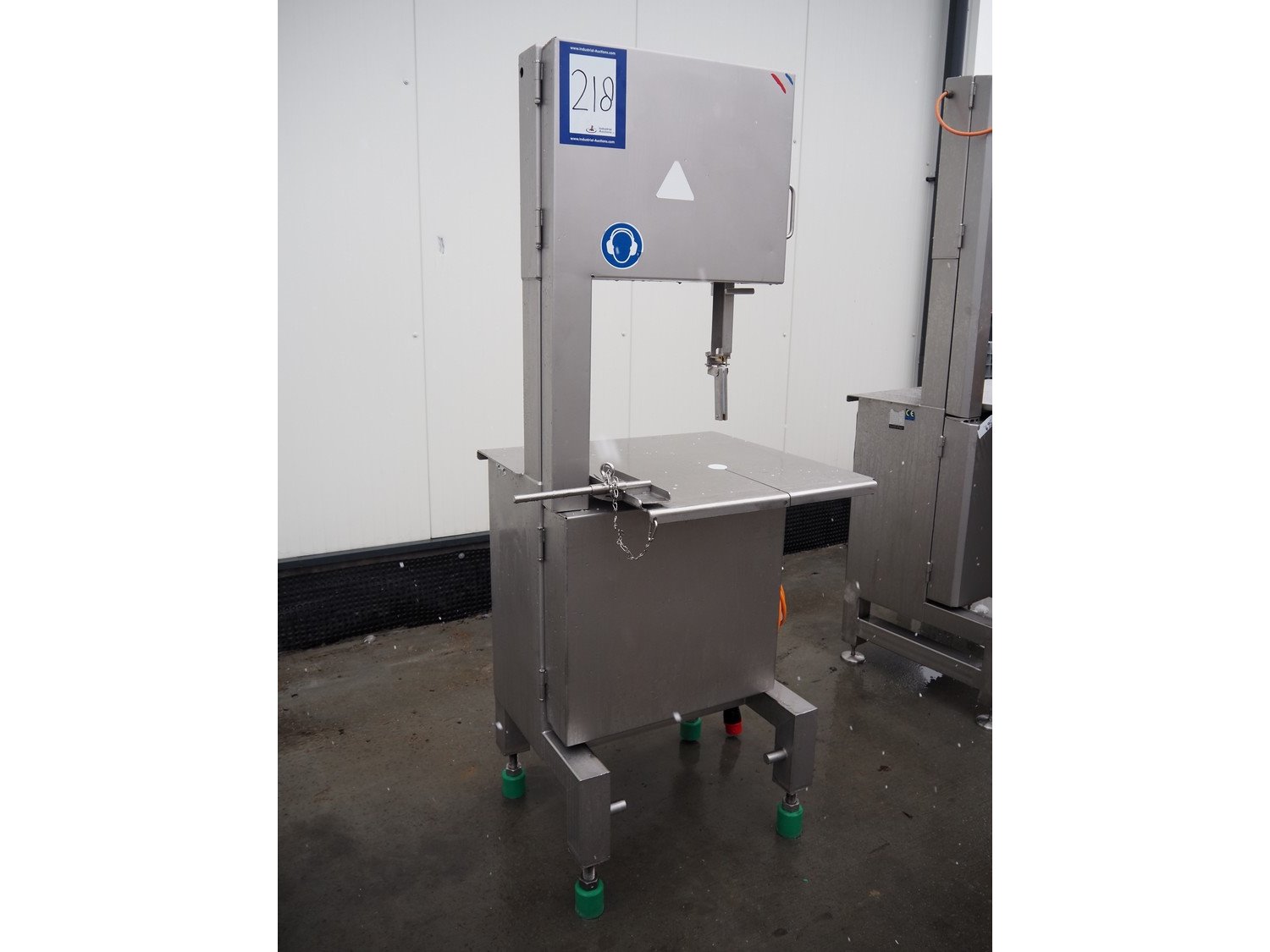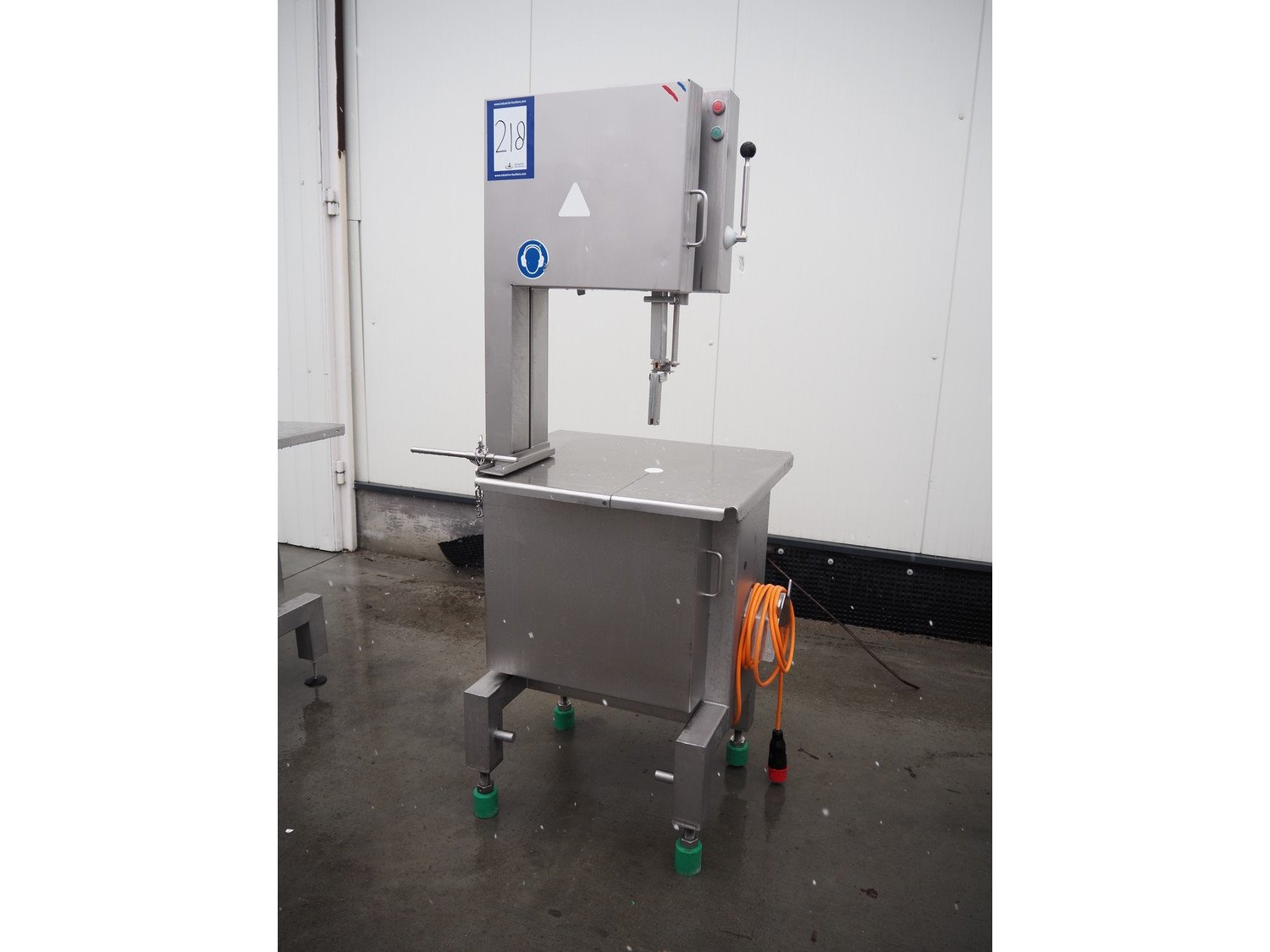 S/s bandsaw, table dimensions: 680 mm x 750 mm, total dimensions: 930 mm x 750 mm x 1980 mm. Missing saw. Kavel locatie: Lipsko 241, 22-400 Zamość, Polen