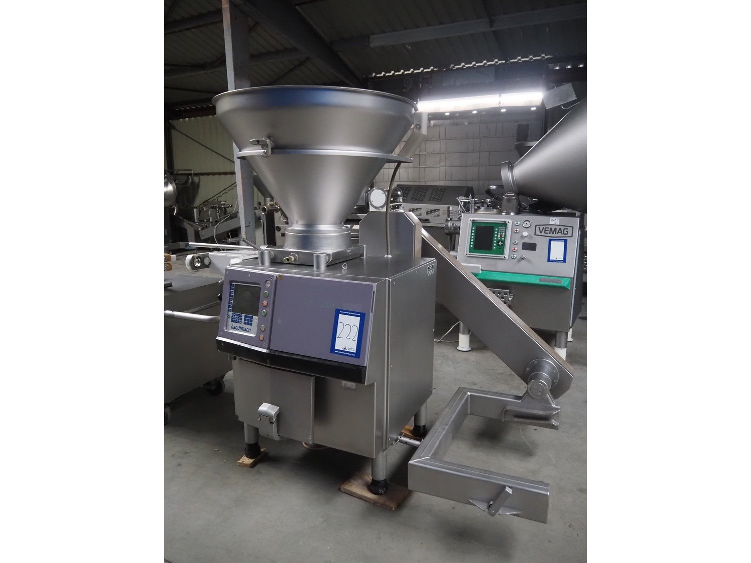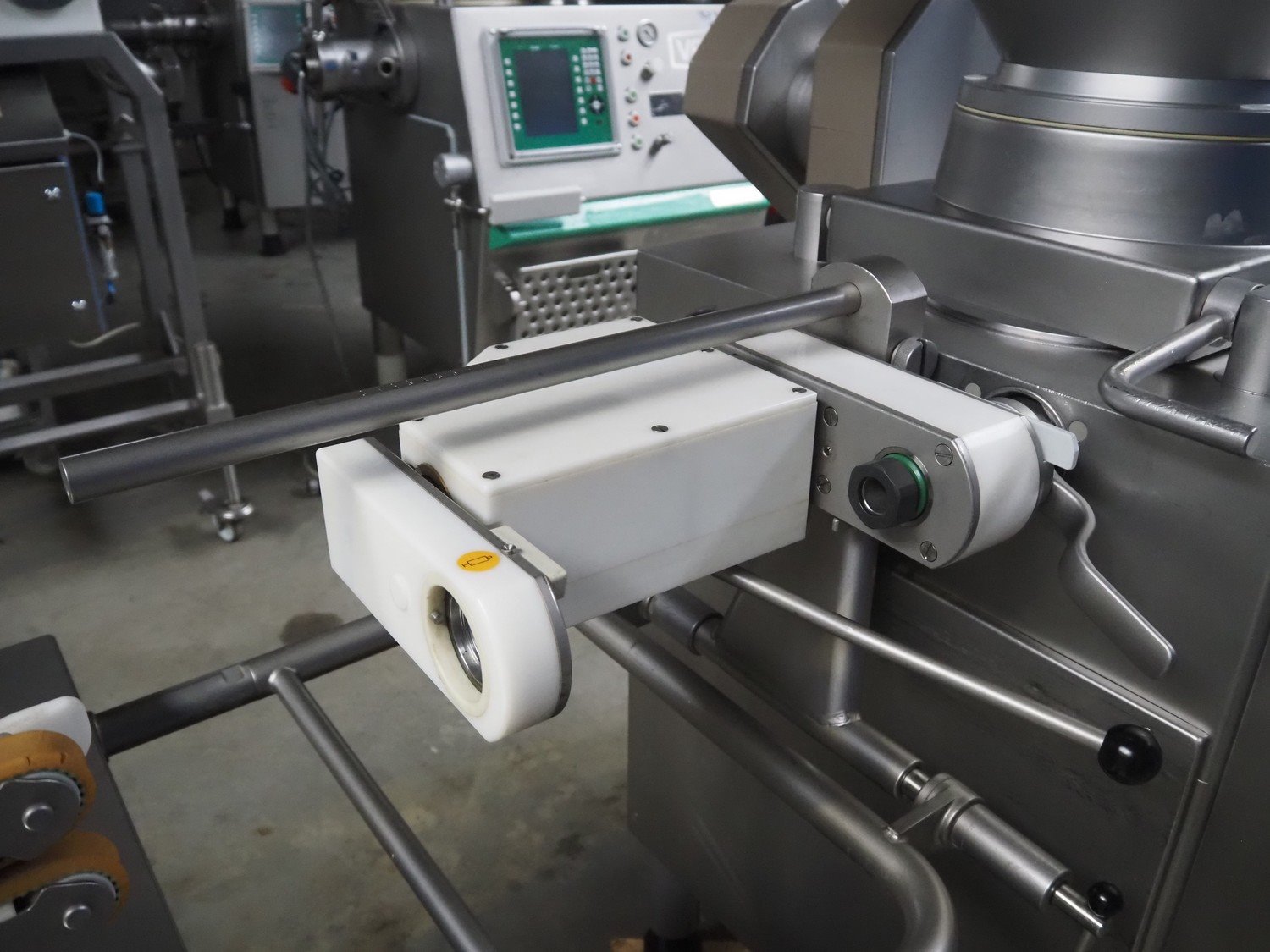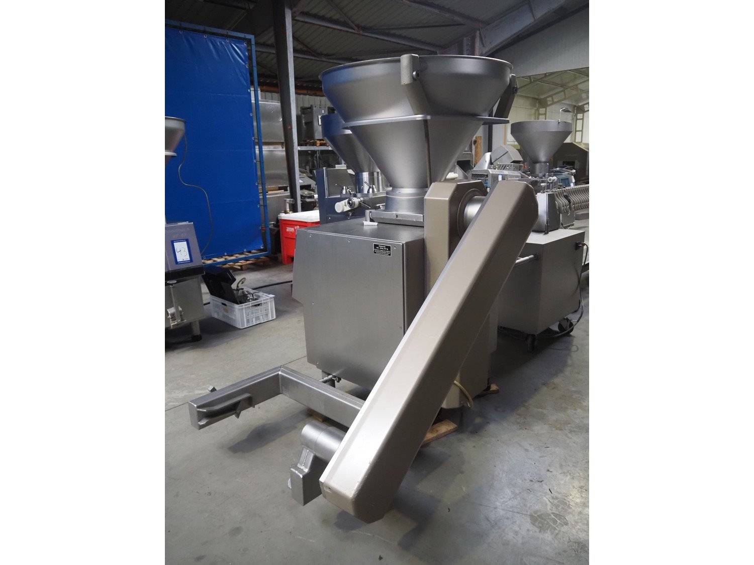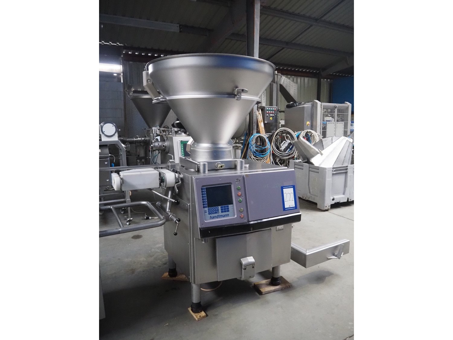 Handtmann vacuum filling machine with lifter for 200 liter meat bins, type: VF200B, number: 4333, year of construction: 1999, 400 V, 50 Hz, 17 A, 6.5 kW, dimensions: 2300 mm x 1450 mm x 1950 mm. Including linking attachment and case holding device. Kavel locatie: Lipsko 241, 22-400 Zamość, Polen