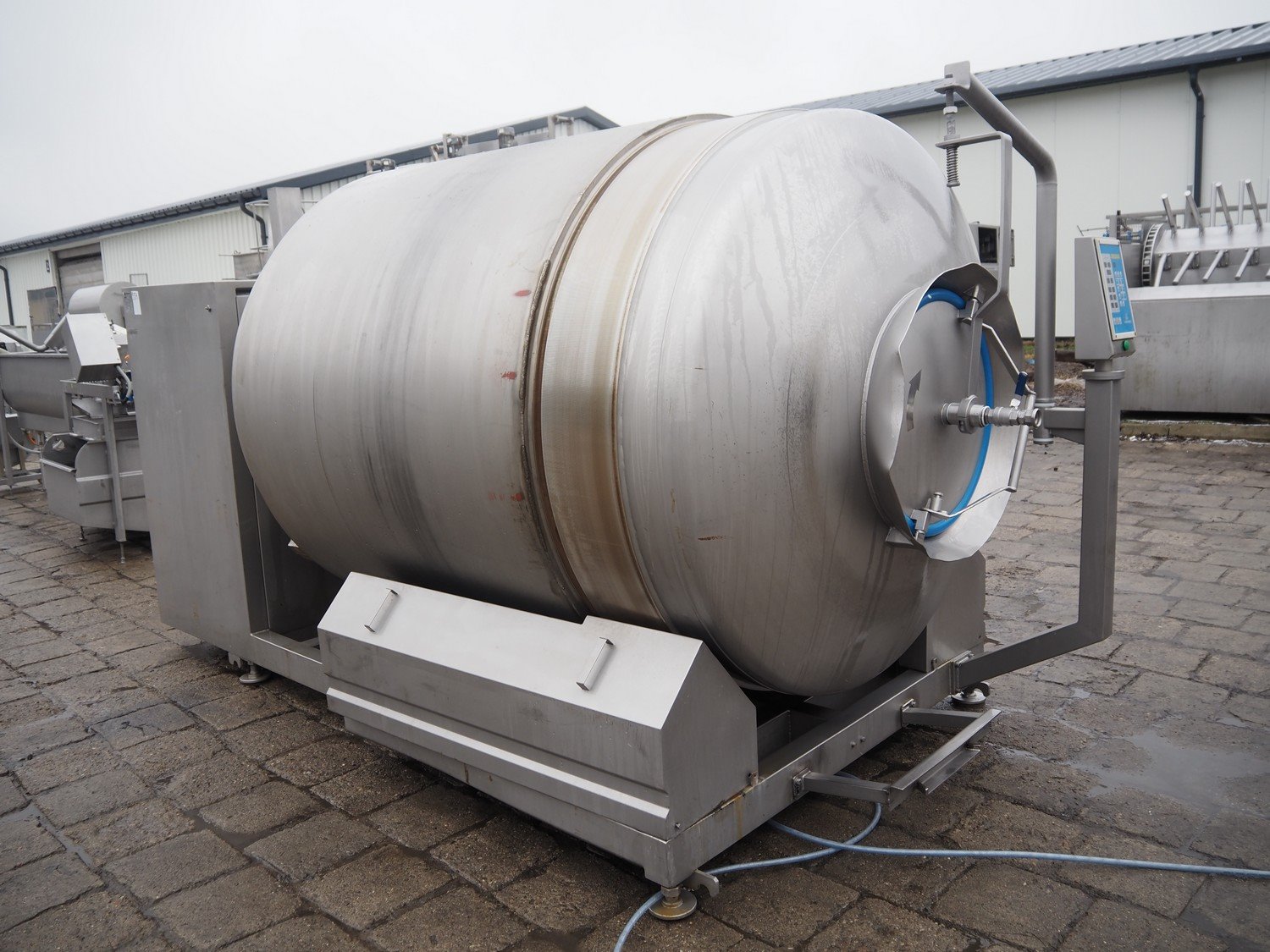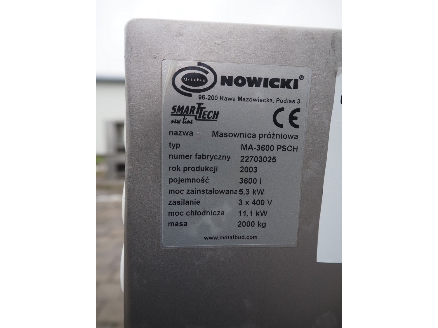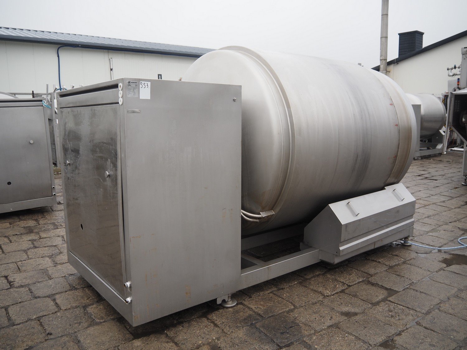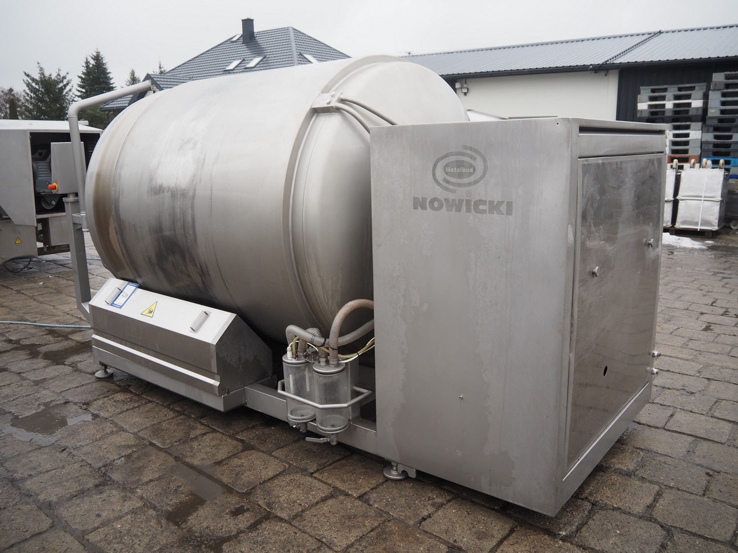 Nowicki s/s vacuum tumbler, type: MA-3600 PSCH, serial number: 22703025, year of construction 2003, 400 V, 3 Ph, 5.3 / 11.1 kW, capacity: 3600 liter, weight: 2000 kg, clearance: Ø 600 mm, with Busch vacuum pump, type: RC 0063 E 501, serial number: 03007773, 20 hPa, total dimensions: 3200 mm x 1750 mm x 2050 mm. Kavel locatie: Lipsko 241, 22-400 Zamość, Polen
