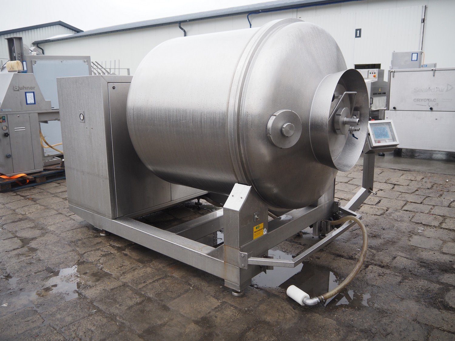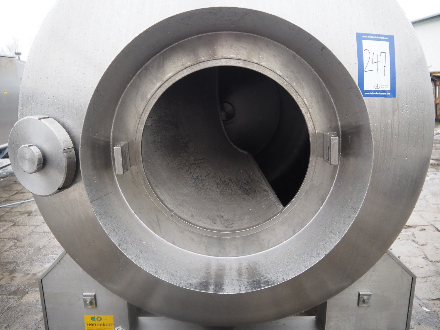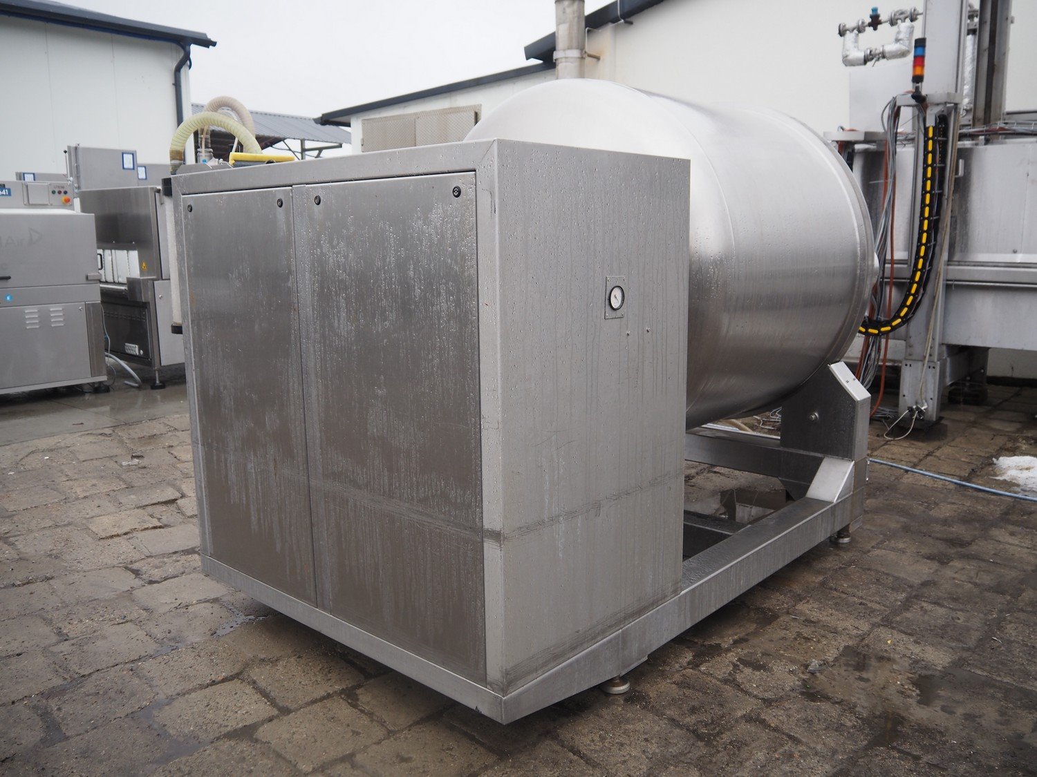 Henneken s/s vacuum tumbler, inside dimensions: Ø 1400 mm x 1700 mm, clearance: Ø 500 mm, with busch vacuum pump, type: RC 0063 E 501, serial number: 070002875, year of construction: 2007, 20 hPa, total dimensions: 3000 mm x 1900 mm x 2050 mm. Kavel locatie: Lipsko 241, 22-400 Zamość, Polen