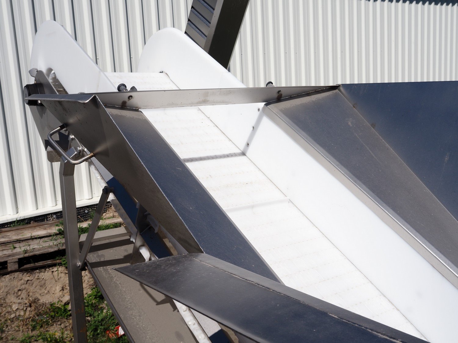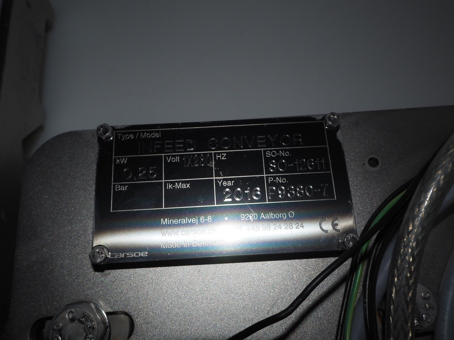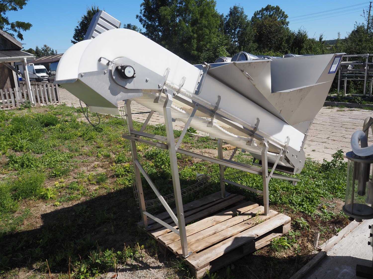 Carsoe elevating belt with dividers, type: INFEED CONVEYOR, serial number: SO-12611, year of construction: 2016, 230 V, 1 Ph, 0.25 kW, plastic belt, belt width: 505 mm, divider height: 25 mm, distance between dividers: 600 mm, elevating height: 1700 mm, total dimensions: 2700 mm x 1100 mm x 2000 mm. Kavel locatie: Lipsko 241, 22-400 Zamość, Polen
