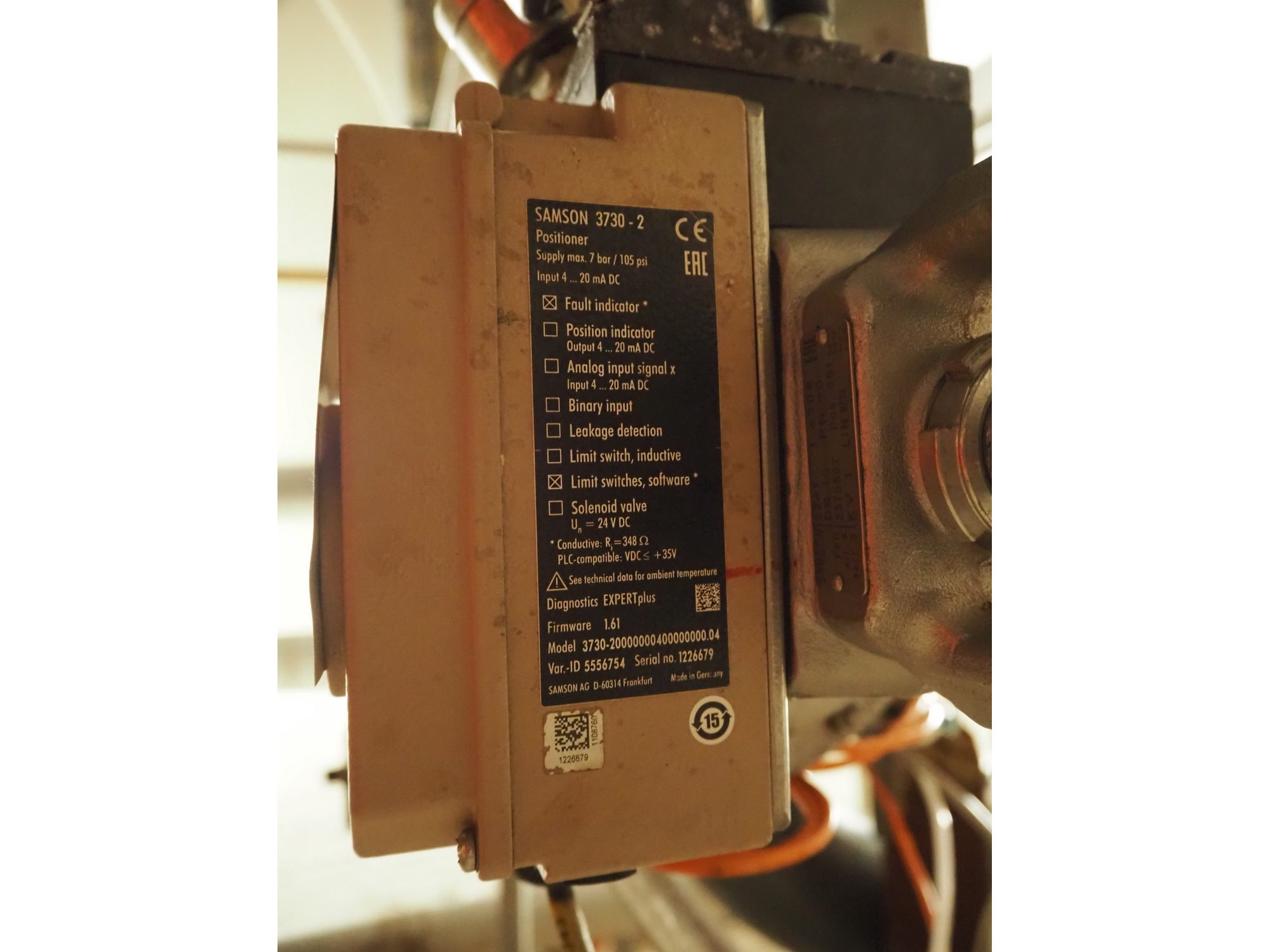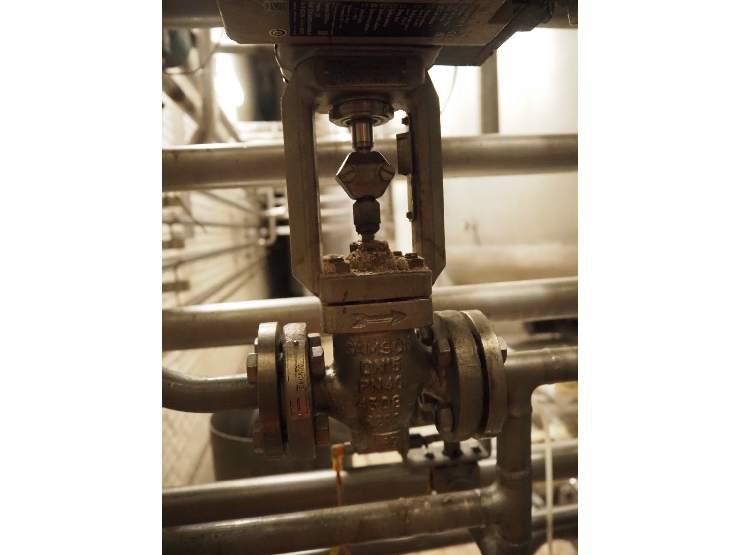 Samson valve with pneumatic diaphragm actuator and electropneumatic positioner, type valve: 3277, type positioner: 3730-2, DN:15, PN: 40, dimensions actuator: 300 mm x 200 mm x 450 mm. Kavel locatie: P. Stuyvesantweg 1, 8937 AC Leeuwarden, Nederland