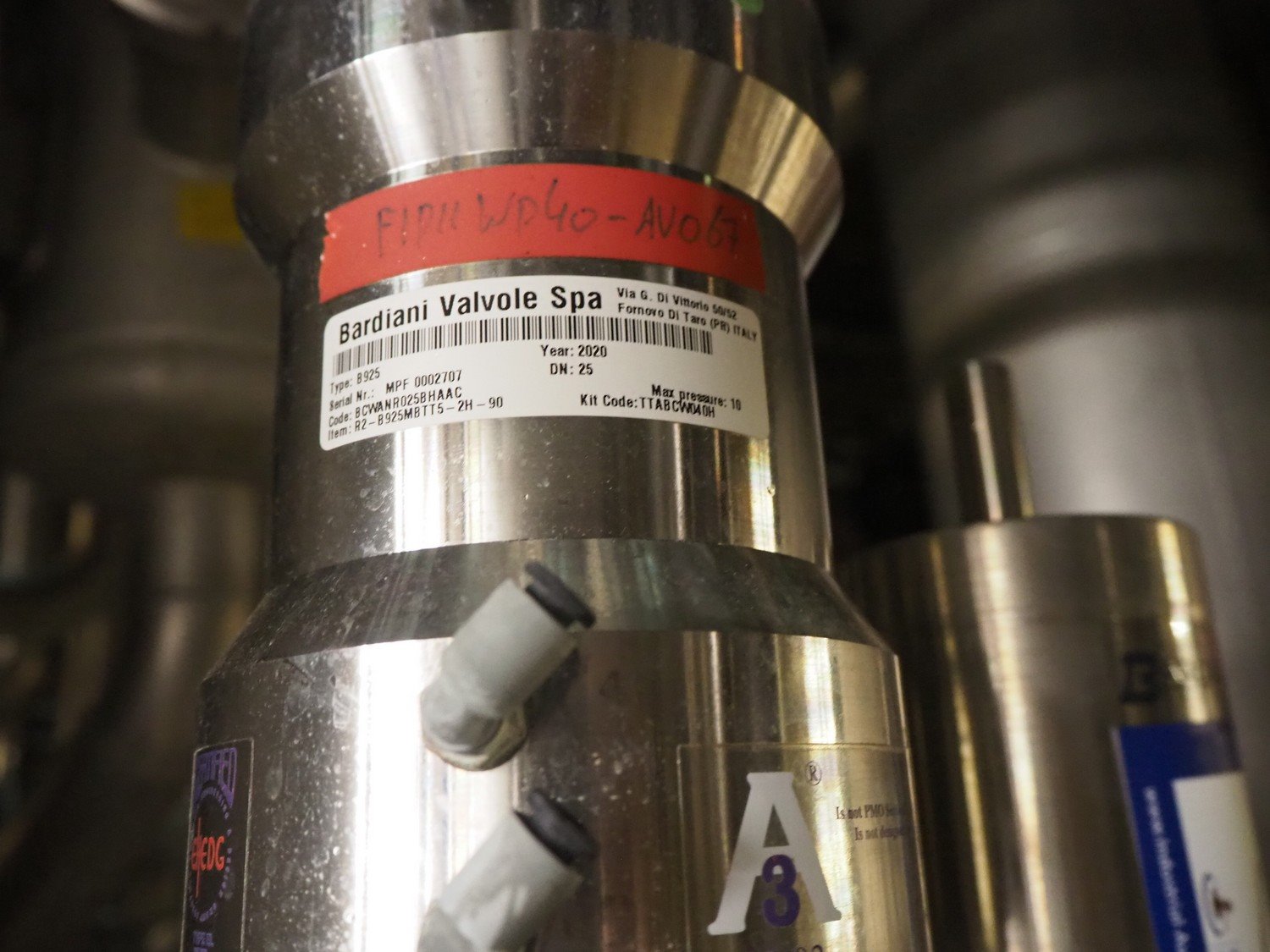 2 Bardiani Valvole Spa valves, type: B 925, ZVF, year of construction: 2020, DN: 25, dimensions: ø 100 mm x 650 mm, ø 100 mm x 450 mm. Kavel locatie: P. Stuyvesantweg 1, 8937 AC Leeuwarden, Nederland