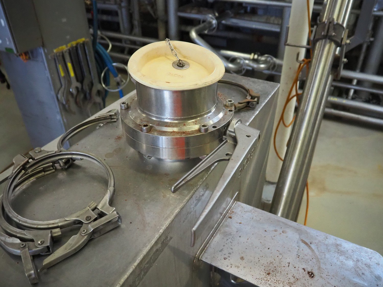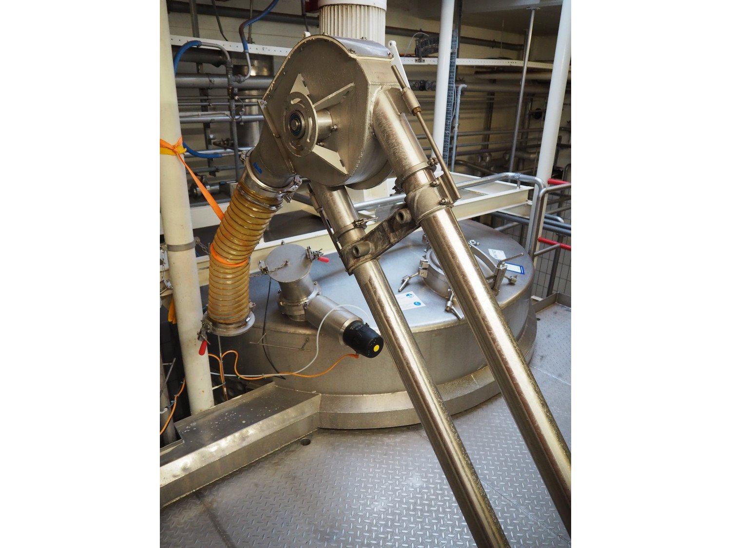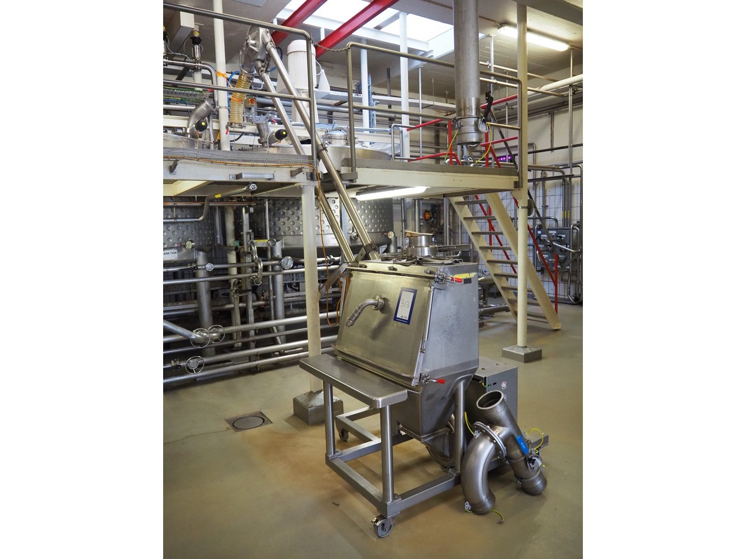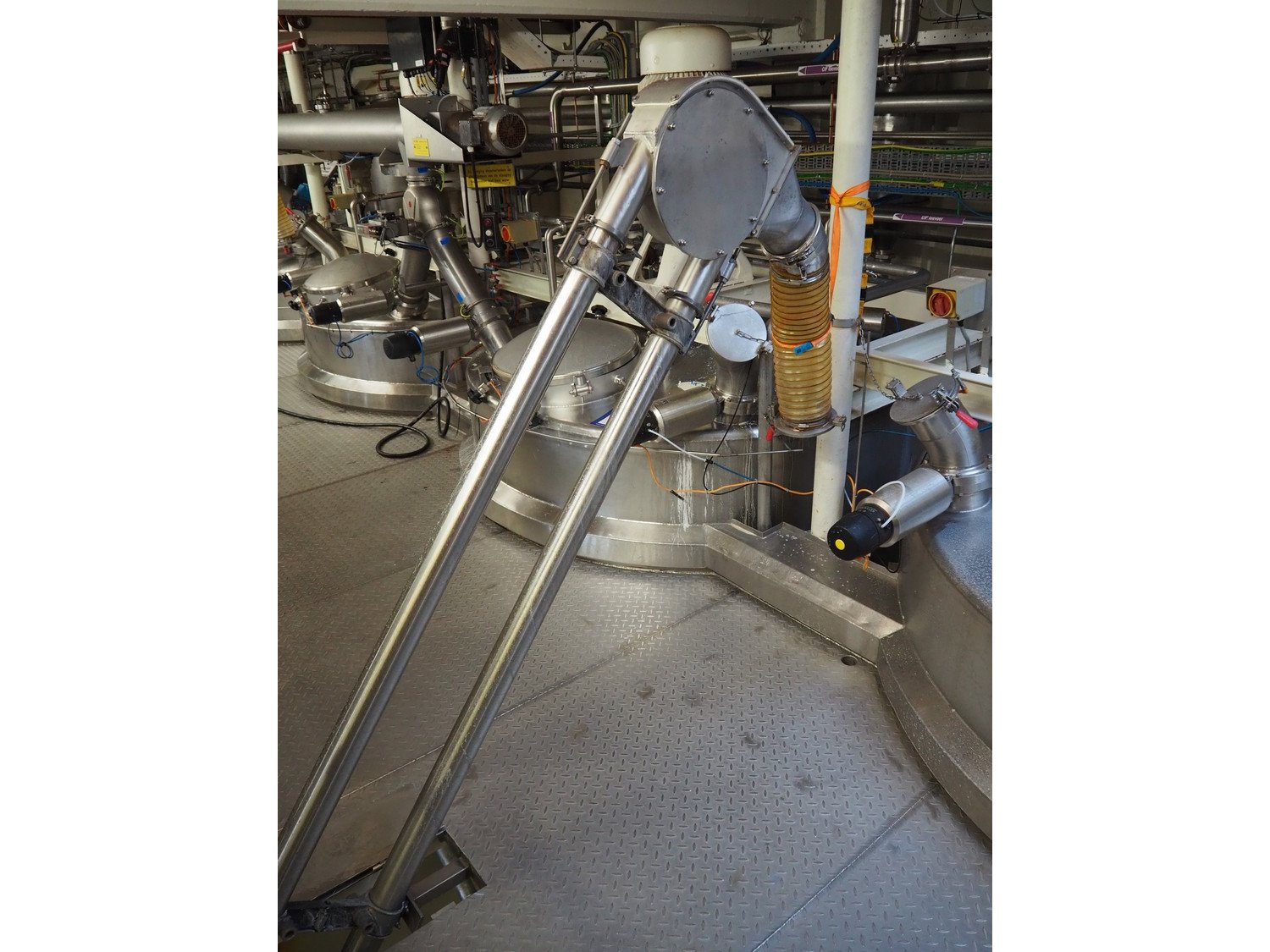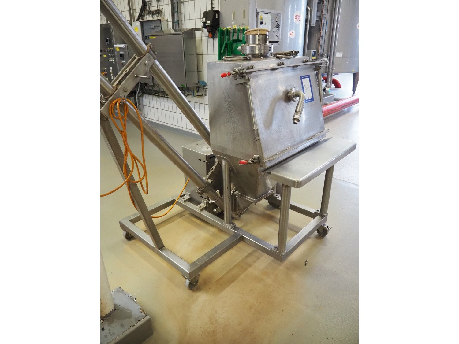 Mobile s/s infeed bunker with elevating cups for powder, inside dimensions: 400 mm x 700 mm x 600 mm, total dimensions: 4300 mm x 1400 mm x 4000 mm. Kavel locatie: P. Stuyvesantweg 1, 8937 AC Leeuwarden, Nederland