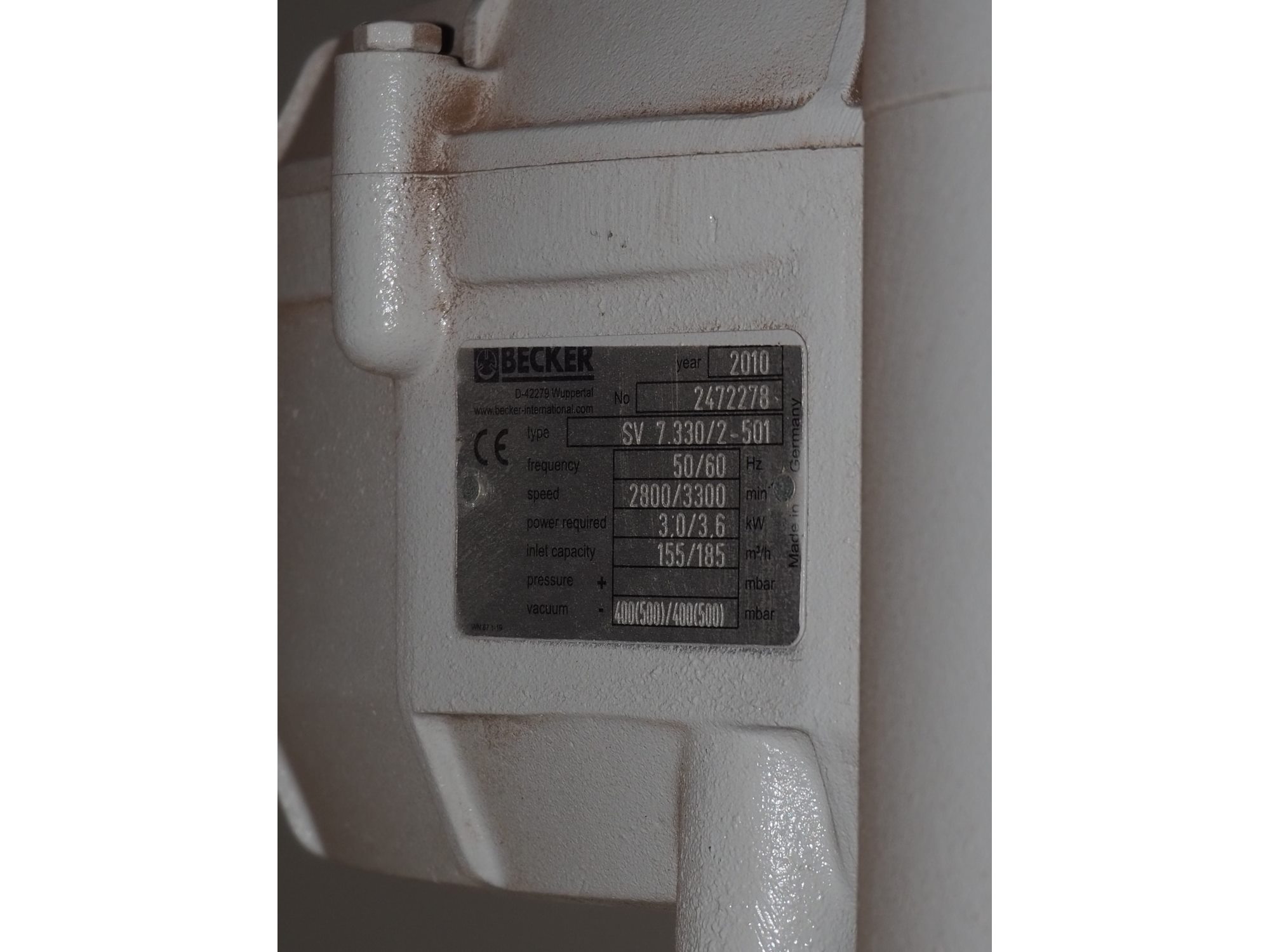 SMI Handling Systeme vacuum lifter, type: SML/ECO 120, fabrication number: 120833, year of construction: 11/10, capacity: 25 kg, dimensions lifter: 360 mm x 200 mm, including Becker vacuum pump, type: SV 7.330/2-501, number: 2472278, year of construction: 2010, capacity: 155/185 m³/h, dimensions: 900 mm x 600 mm x 500 mm. Kavel locatie: P. Stuyvesantweg 1, 8937 AC Leeuwarden, Nederland
