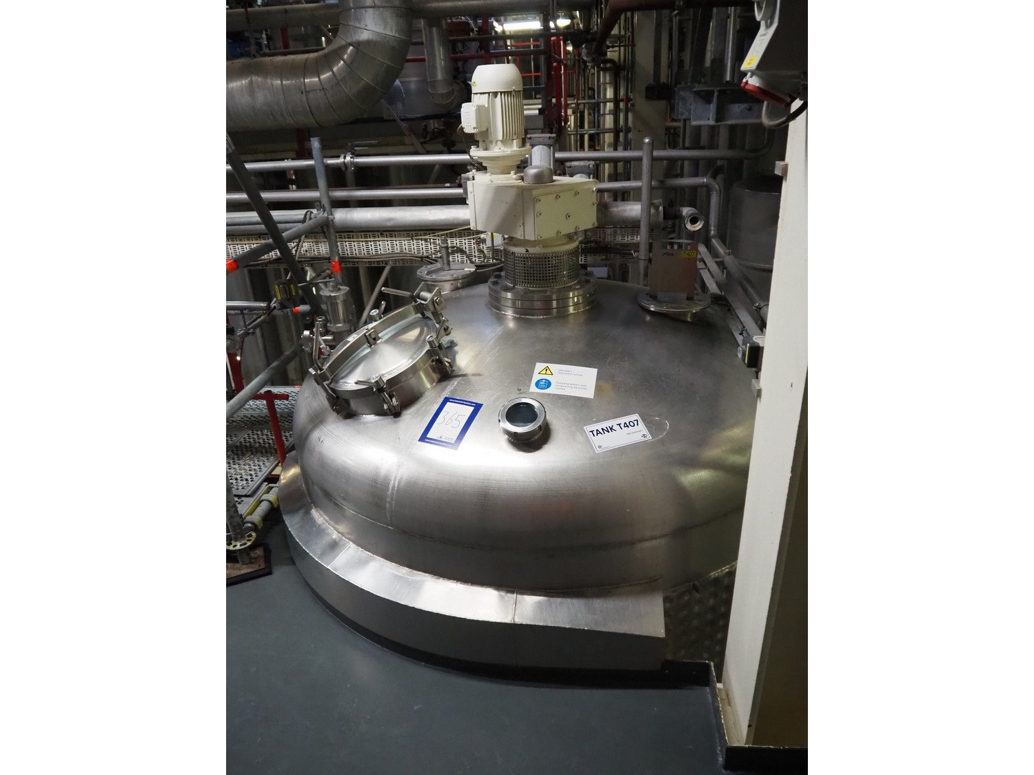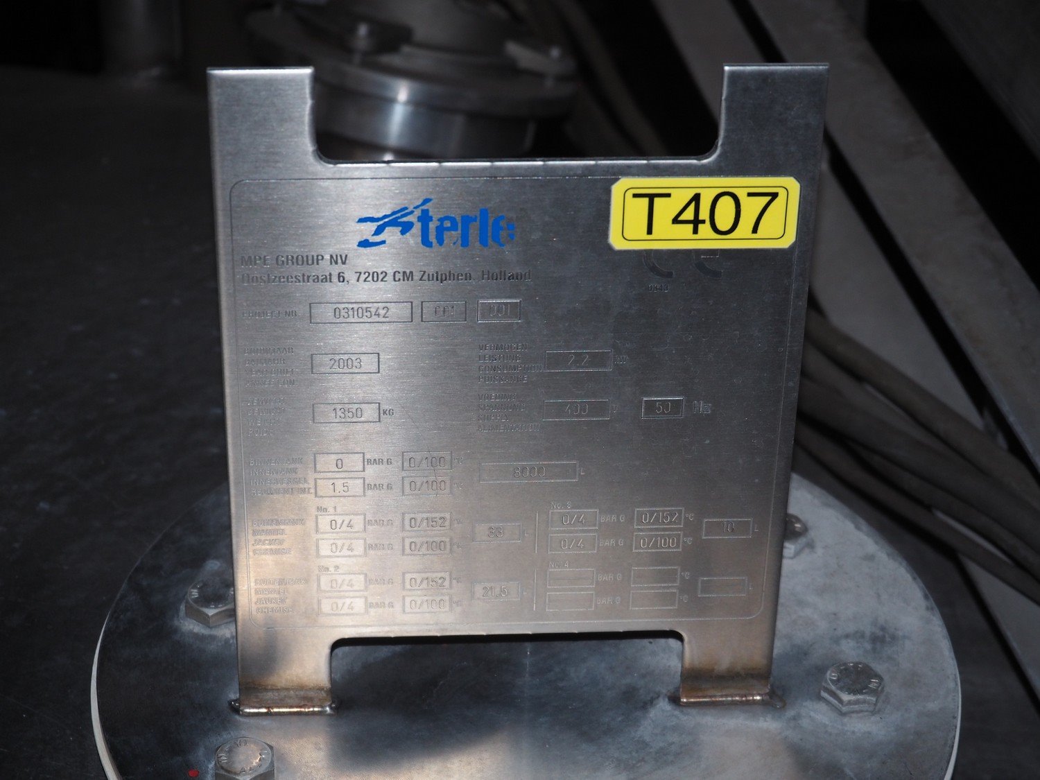 Terlet s/s double jacketed tank with agitator, year of construction: 2003, volume: 8000 litre, empty weight: 1350 kg, dimensions: Ø 2000 mm x 4900 mm. Kavel locatie: P. Stuyvesantweg 1, 8937 AC Leeuwarden, Nederland