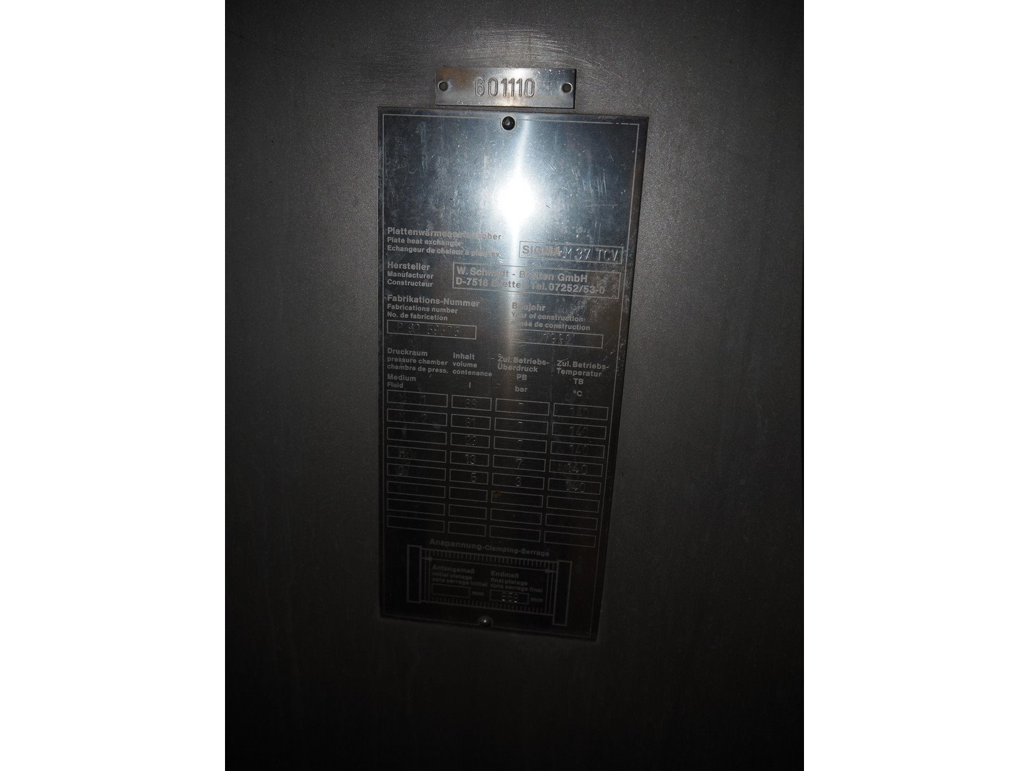W. Schmidt - Bretten GmbH plate heat exchanger, type: SIGMA M37 TCV, fabrication number: P 92 59575, year of construction: 1992, dimensions: 2450 mm x 1000 mm x 2520 mm. Kavel locatie: P. Stuyvesantweg 1, 8937 AC Leeuwarden, Nederland