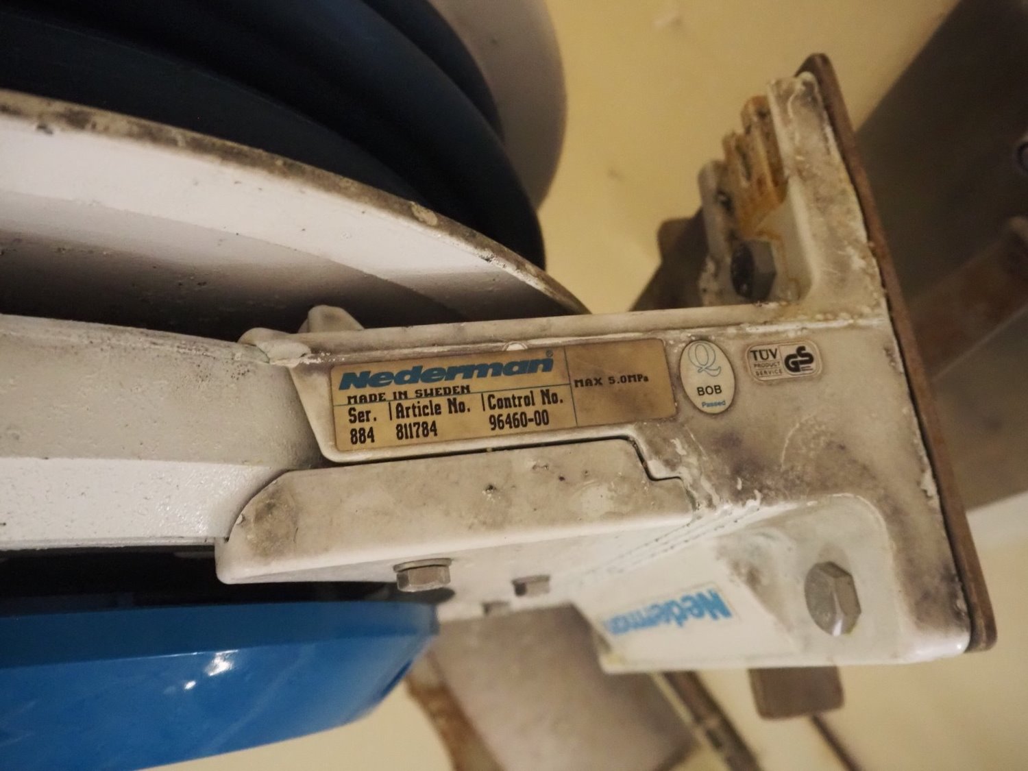 Nederman hose reel with hose and pistol, serial number: 884, dimensions: 700 mm x 300 mm x 550 mm. Kavel locatie: P. Stuyvesantweg 1, 8937 AC Leeuwarden, Nederland