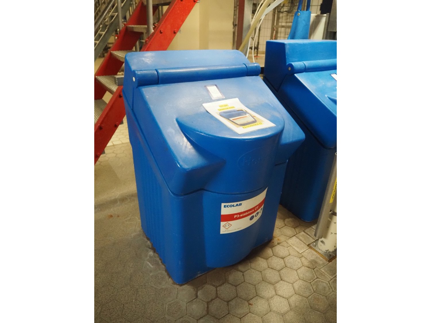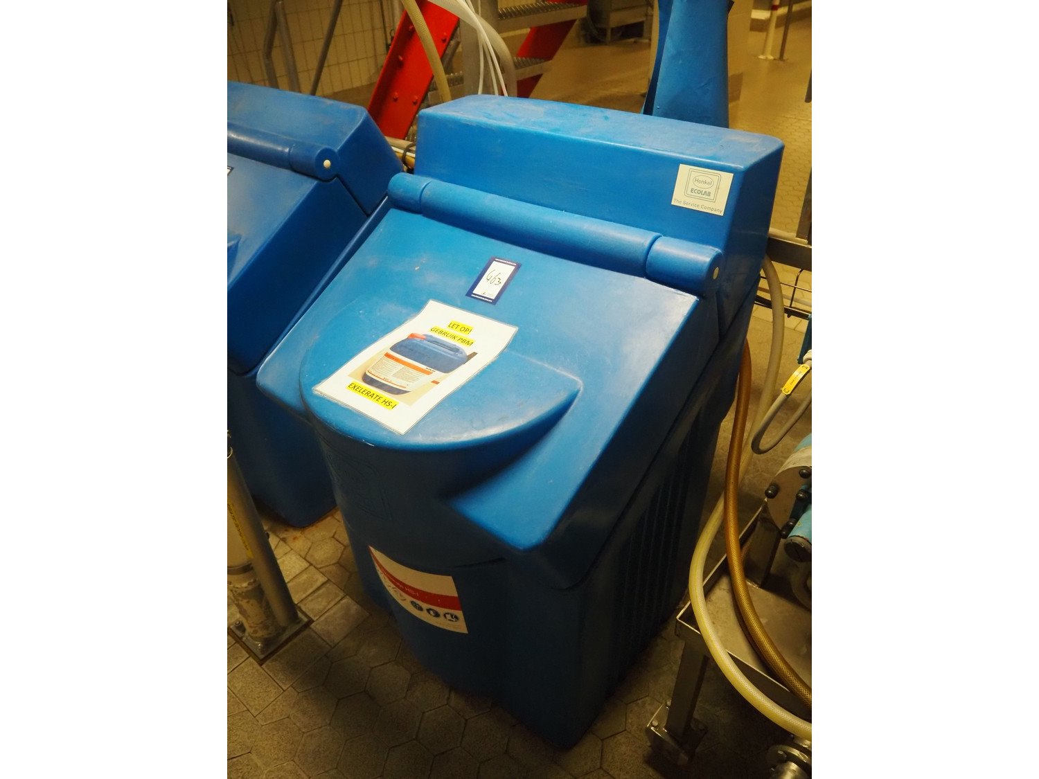 Chemical dosing installation consisting of 2 Henkel Ecolab plastic containers, 2 sera GmbH dosing pumps and 2 Bardiana Valvole Spa valves, total dimensions: 3100 mm x 1000 mm x 2000 mm. Kavel locatie: P. Stuyvesantweg 1, 8937 AC Leeuwarden, Nederland