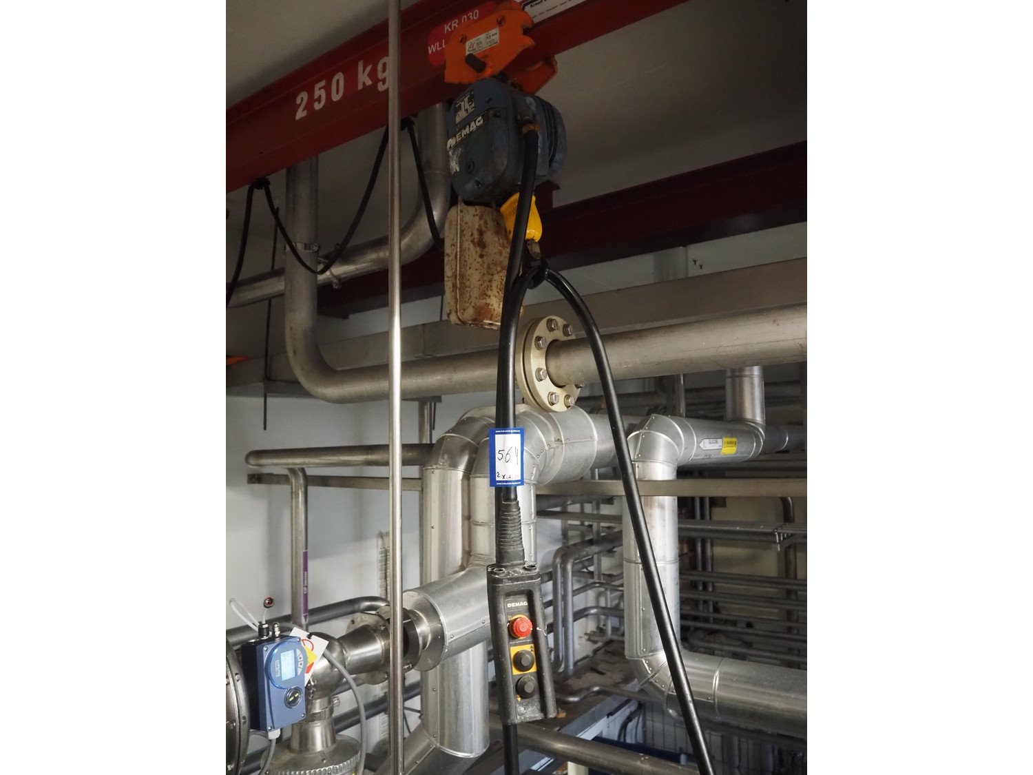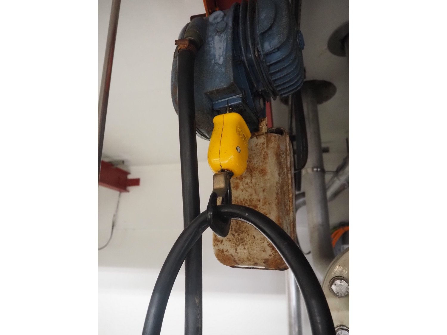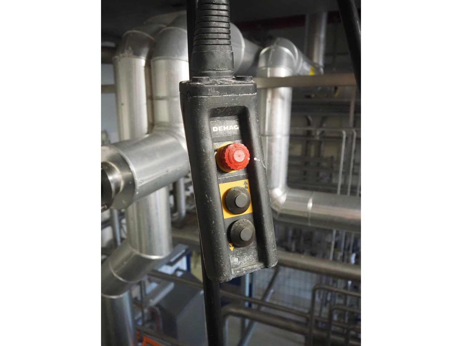 2 Demag electric chain hoists with steel transport beam, length beam: (2x) 2800 mm, dimensions hoist: (2x) 200 mm x 200 mm x 600 mm. Kavel locatie: P. Stuyvesantweg 1, 8937 AC Leeuwarden, Nederland