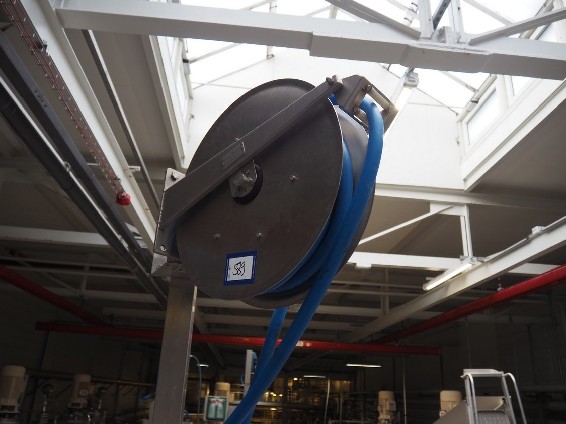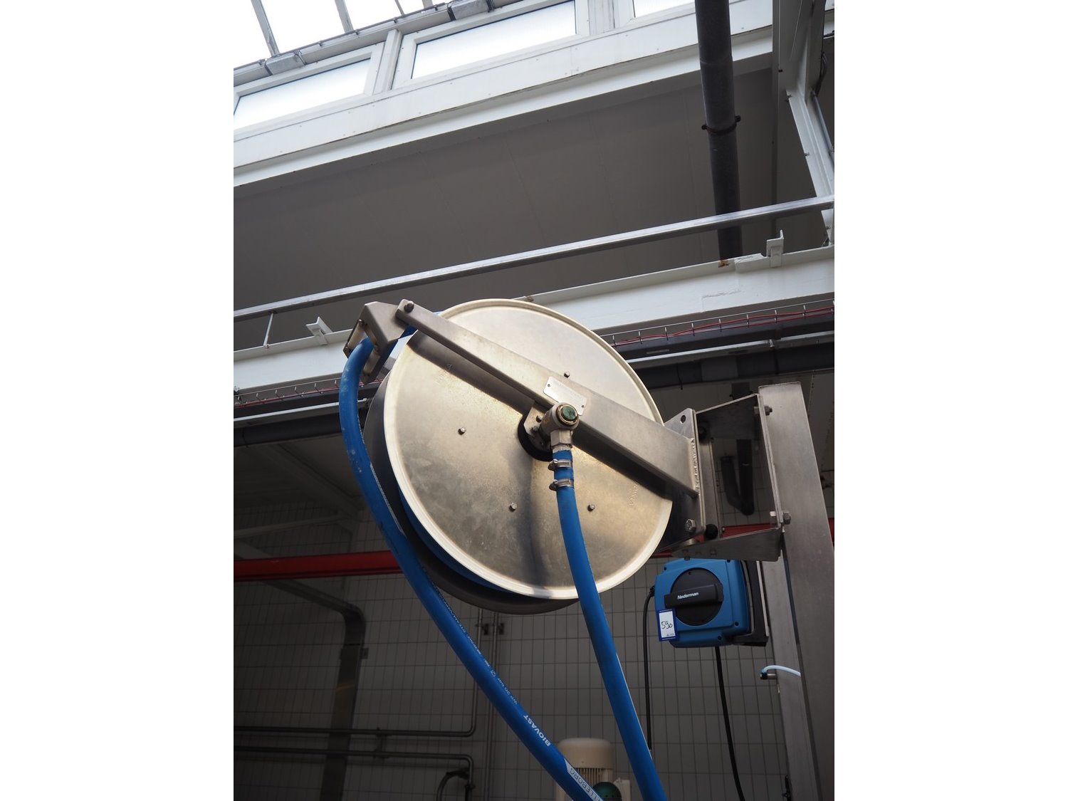 S/s hose reel with plastic hose, dimensions: 700 mm x 300 mm x 600 mm. Kavel locatie: P. Stuyvesantweg 1, 8937 AC Leeuwarden, Nederland