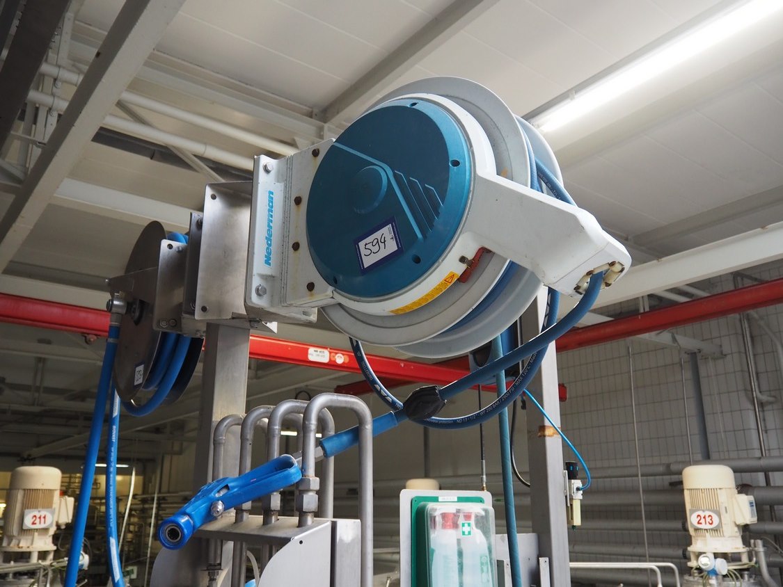 Nederman hose reel with hose and pistol, serial number: 884, dimensions: 700 mm x 300 mm x 550 mm. Kavel locatie: P. Stuyvesantweg 1, 8937 AC Leeuwarden, Nederland