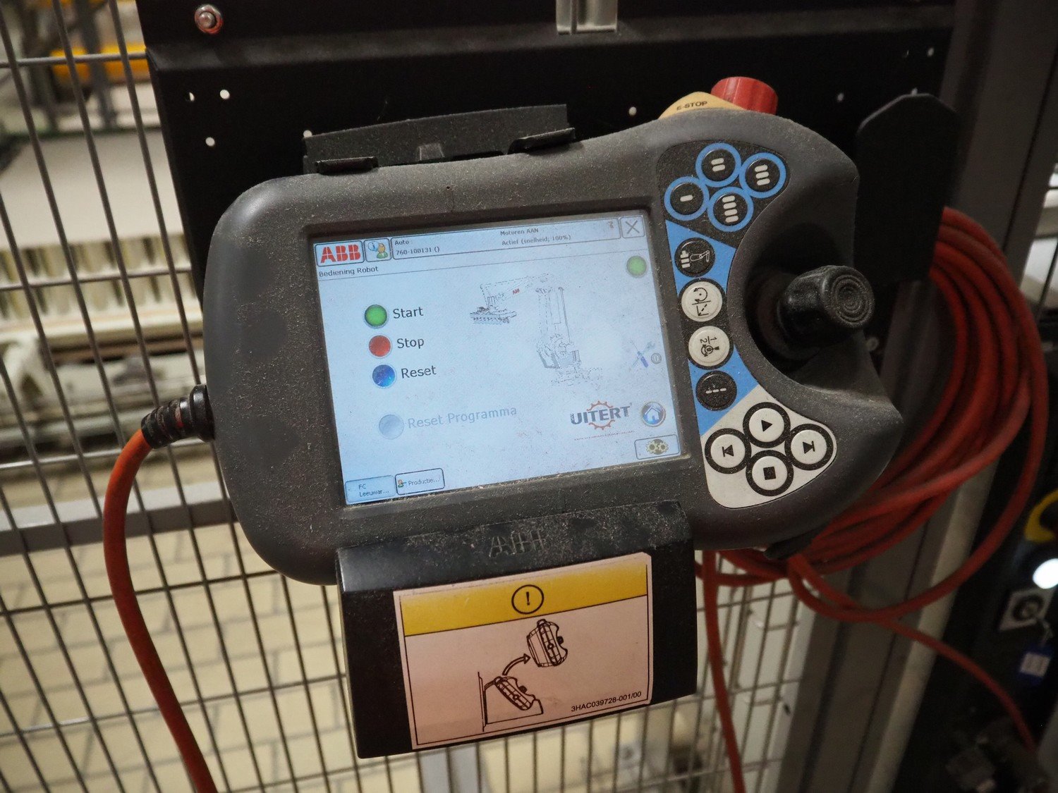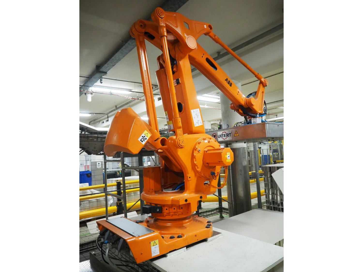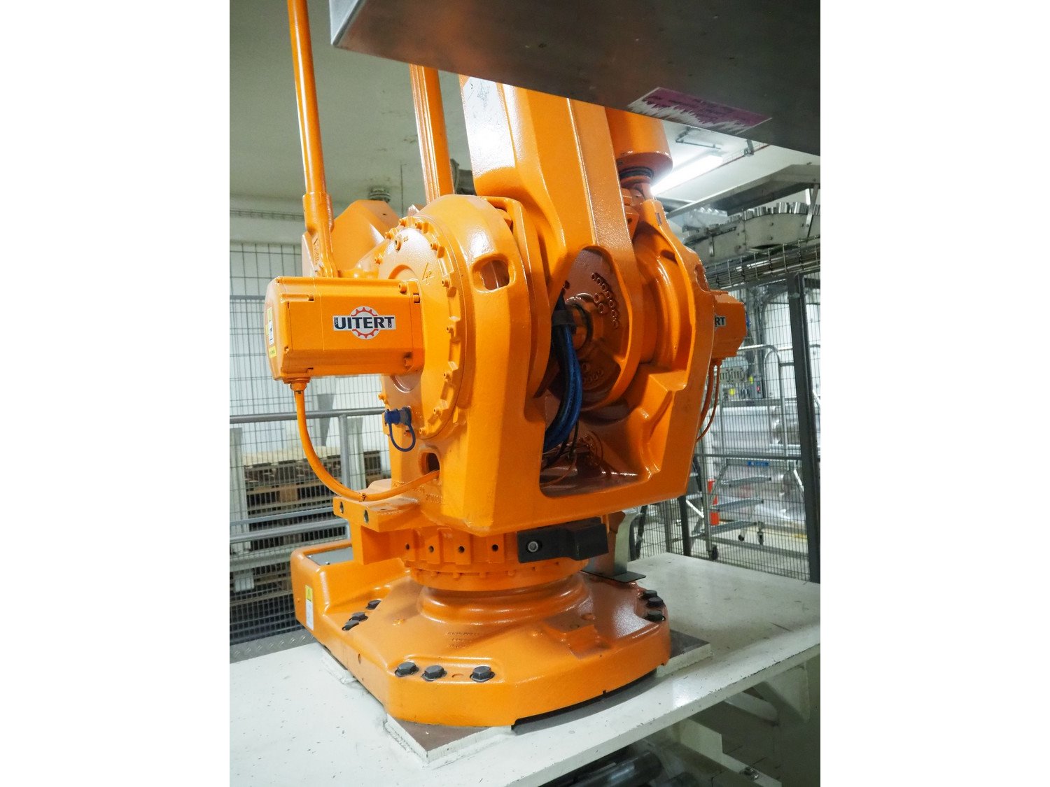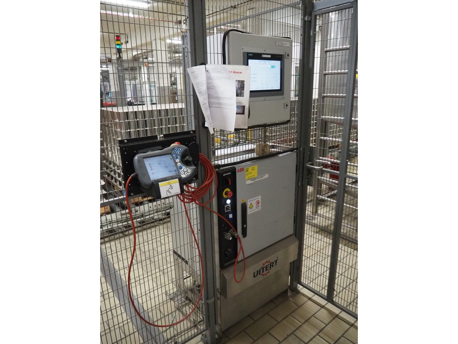 Uitert can depalletizer, with ABB robot and Uitert magnetic grabber, robot type: IRB 760 M2004, robot variant: IRB 760-450/3.2, serial number: 760-100131, year of construction: 2013-08-15, weight: 2300 kg, with Naviflex conveyors, steel rollers, roller width: 1300 mm, total dimensions: 13200 mm x 6800 mm x 3500 mm. Kavel locatie: P. Stuyvesantweg 1, 8937 AC Leeuwarden, Nederland