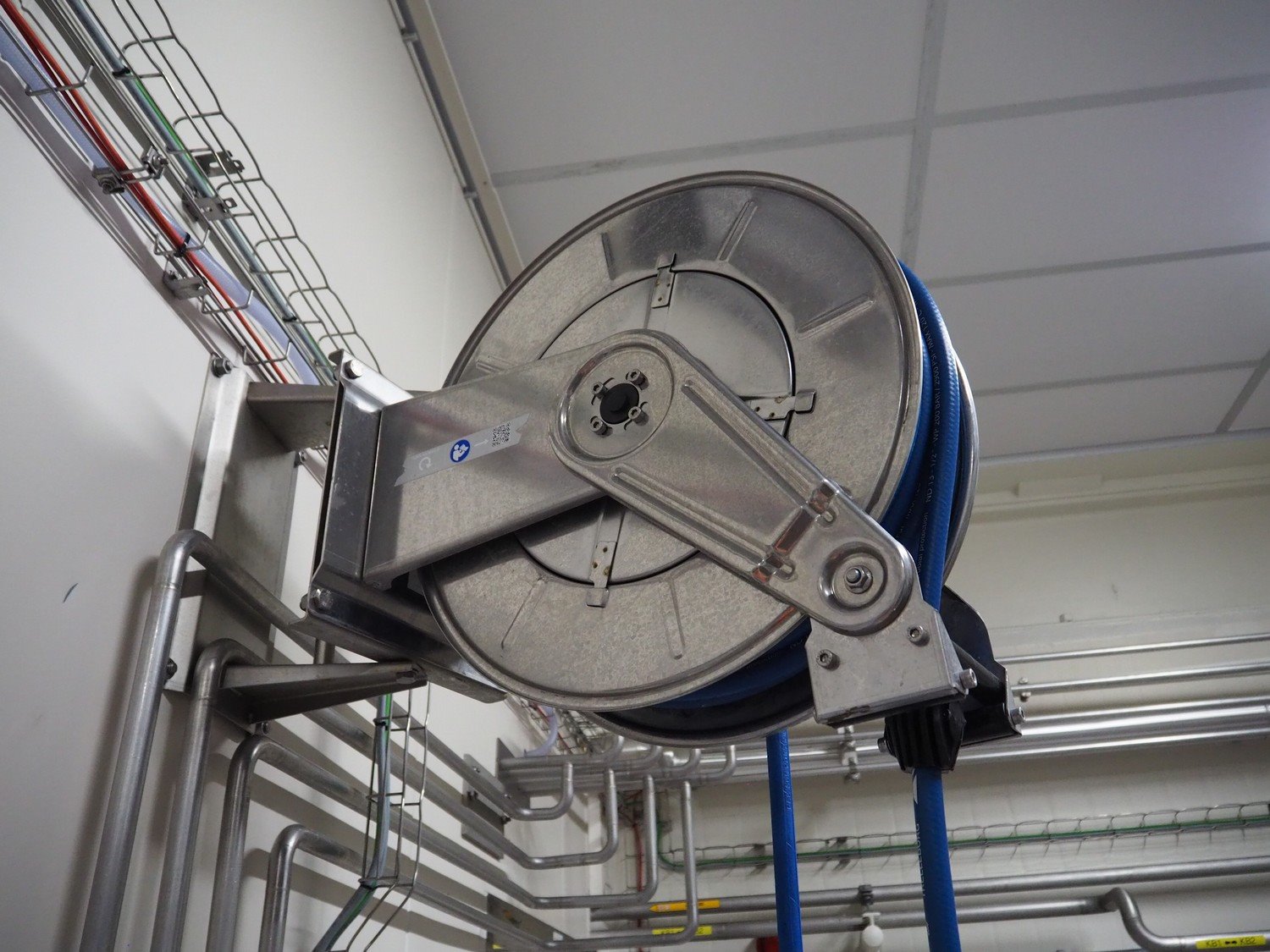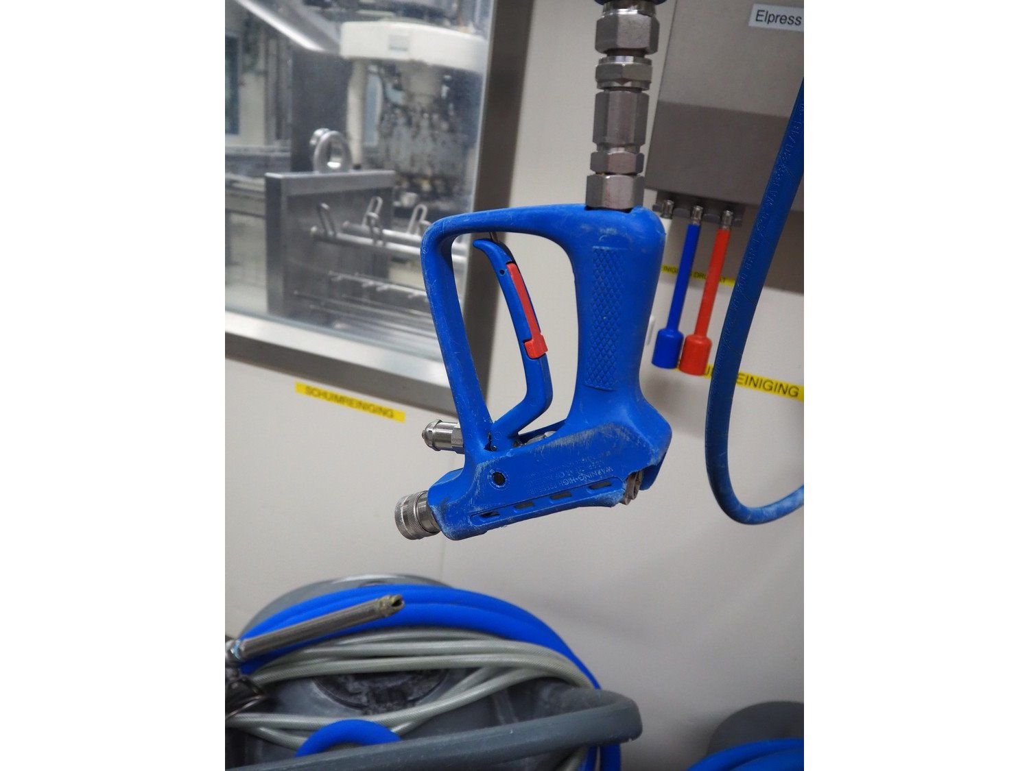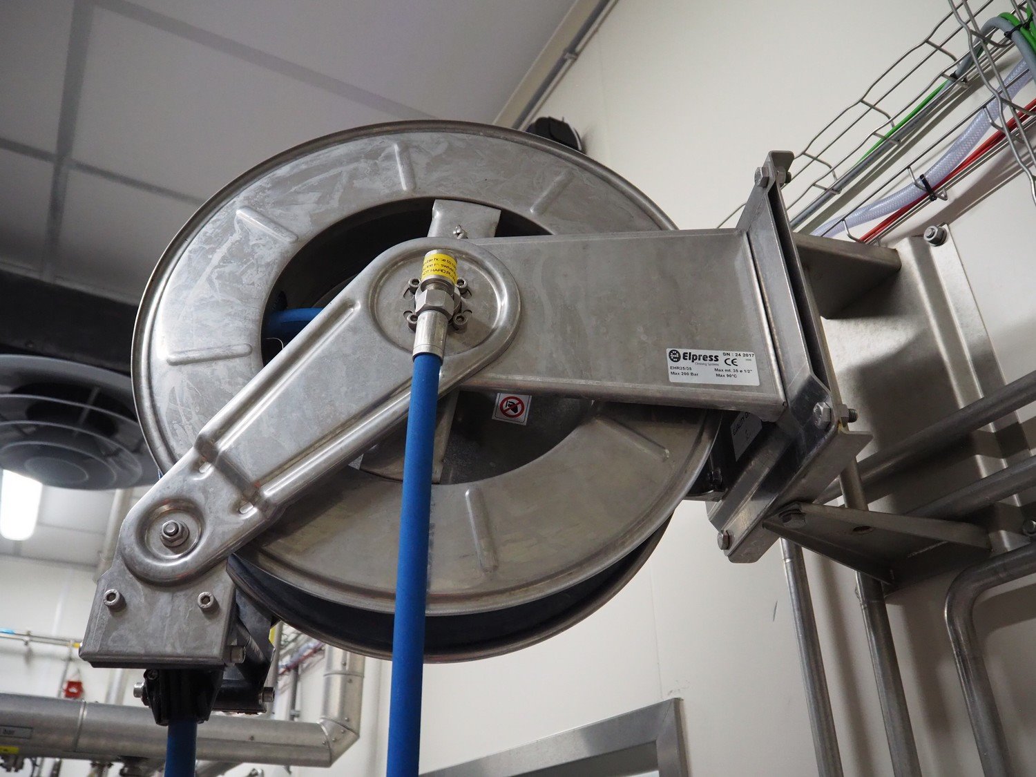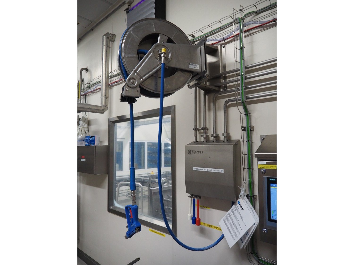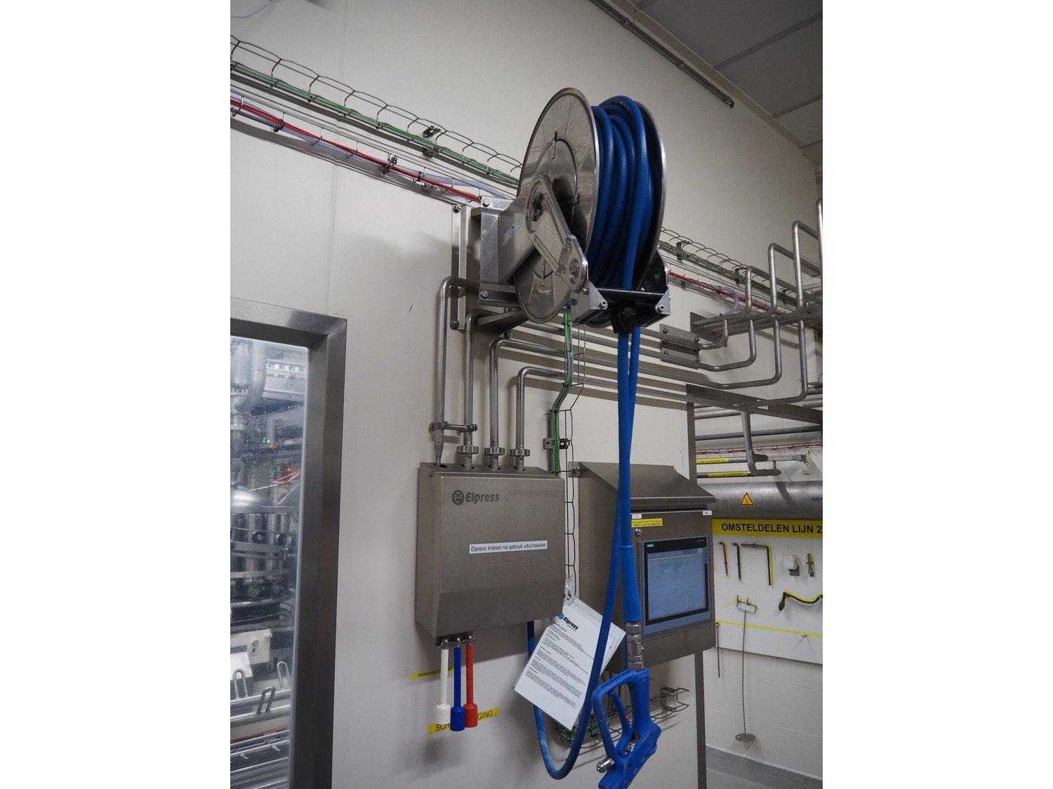 Elpress s/s hose reel with plastic hose, spay pistol and soap mixing station, type: EHR25/35, 83801060, year of construction: 2017, dimensions: 600 mm x 300 mm x 600 mm, 150 mm x 460 mm x 500 mm. Kavel locatie: P. Stuyvesantweg 1, 8937 AC Leeuwarden, Nederland