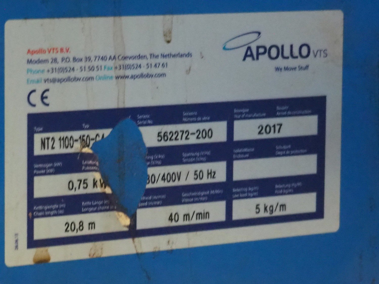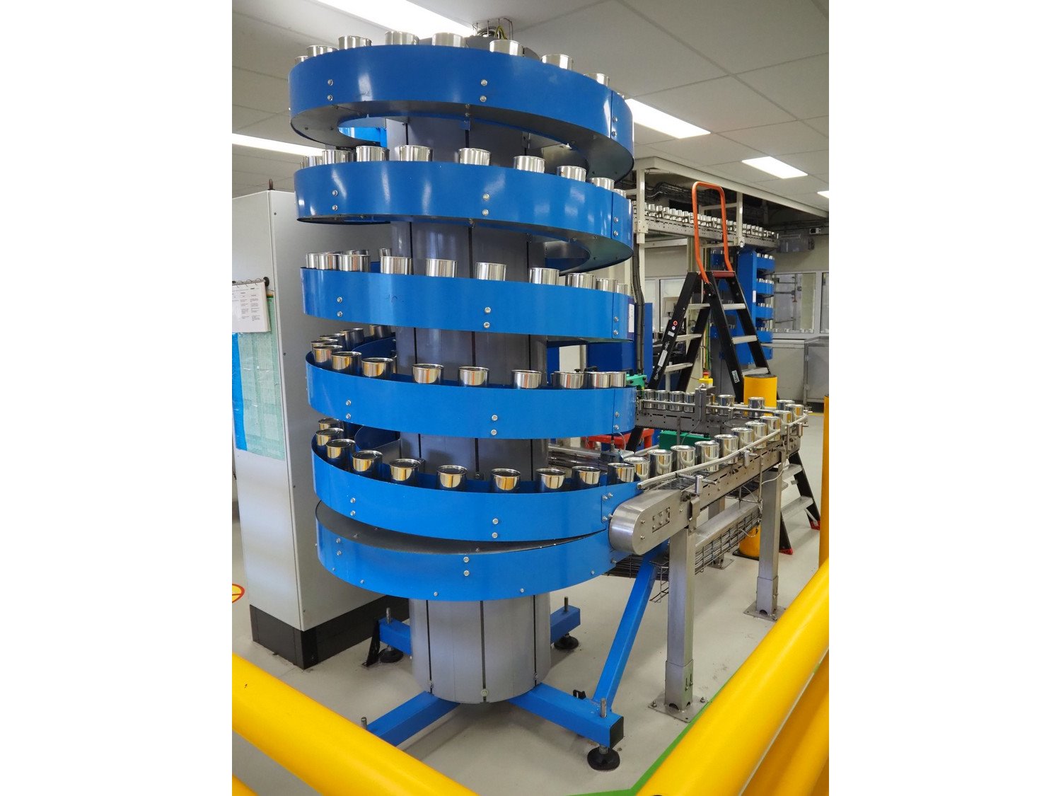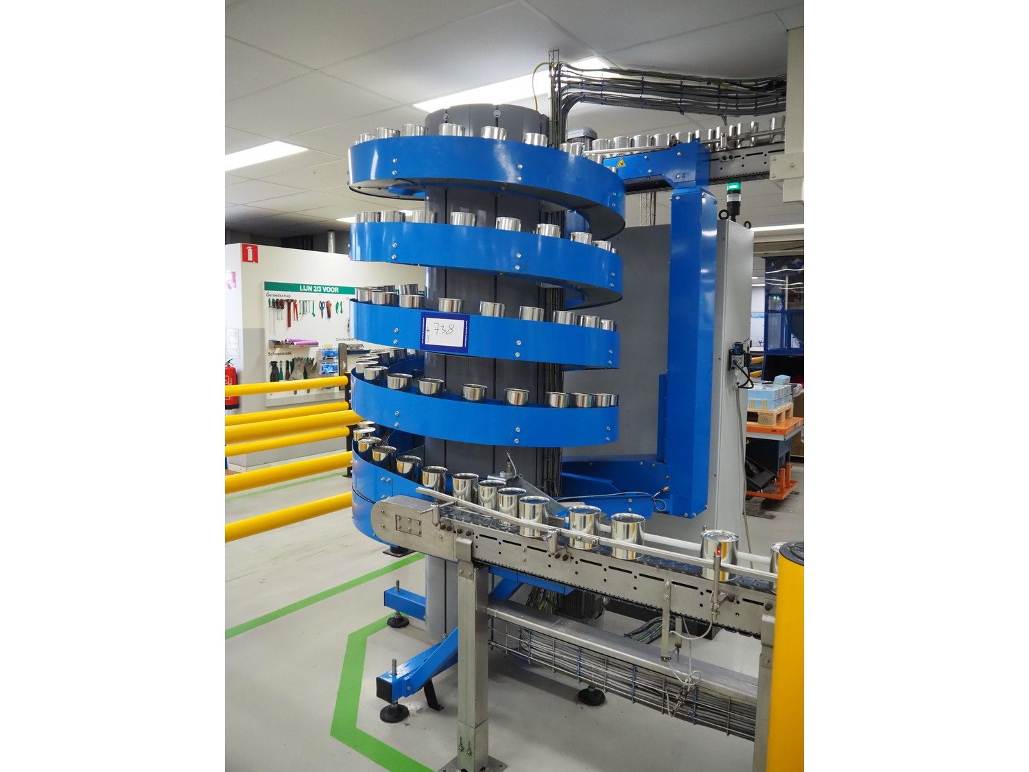 Apollo VTS B.V. spiral de-elevating conveyor, type: NT2 1100-150-C4, serial number: 562272-200, year of construction: 2017, 400 V, 50 Hz, 0.75 kW, chain length: 20,8 m, speed: 40 m/min, live load: 5 kg/m, elevating height: 2500 mm, total dimensions: 1500 mm x 1600 mm x 2500 mm. Kavel locatie: P. Stuyvesantweg 1, 8937 AC Leeuwarden, Nederland