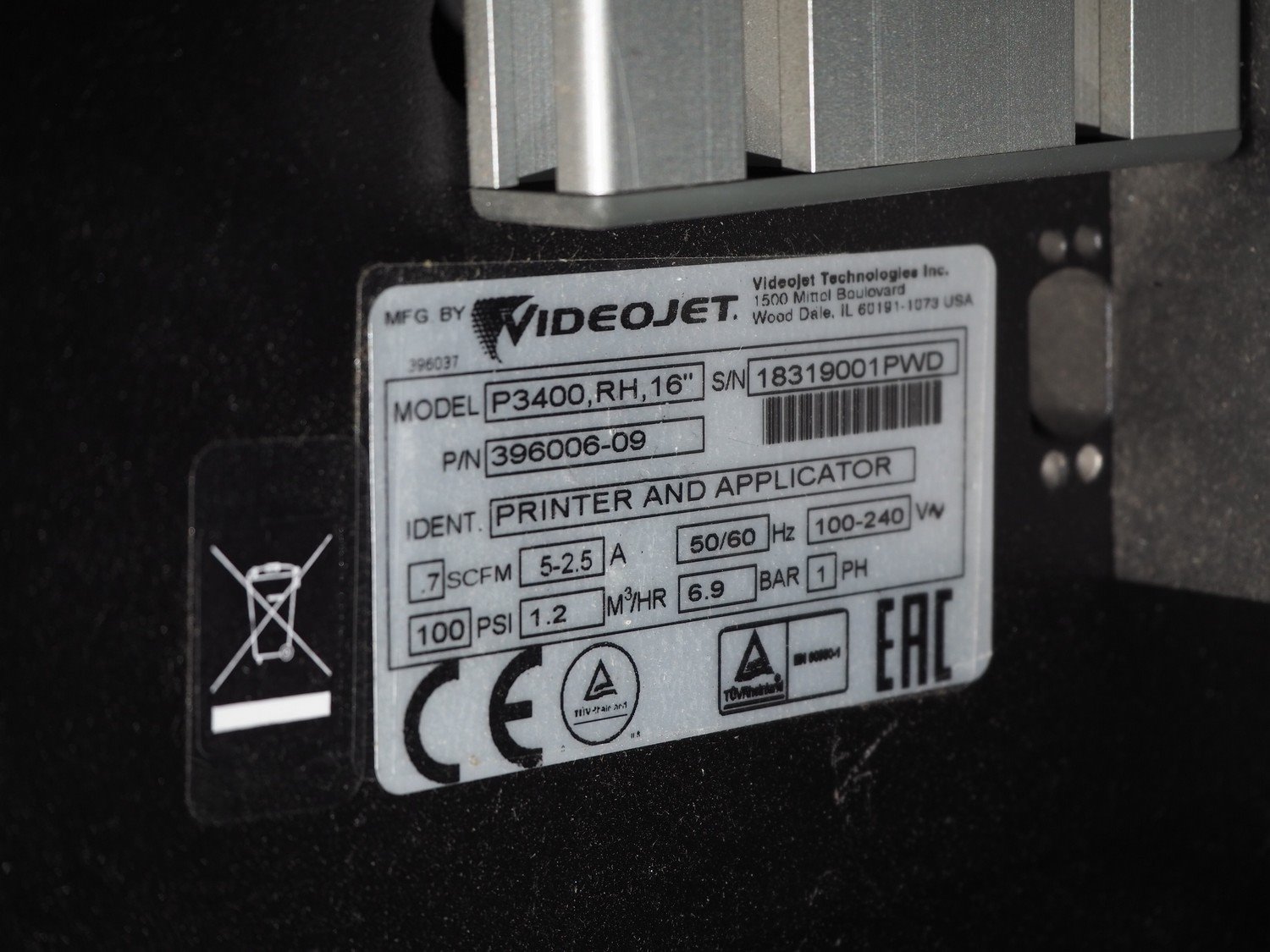 Videojet printer and applicator, model: P3400,RH,16", serial number: 18319001PWD, 100-240 V, 1 Ph, 50/60 Hz, 5-2.5 A, dimensions: 900 mm x 900 mm x 2200 mm. Kavel locatie: P. Stuyvesantweg 1, 8937 AC Leeuwarden, Nederland