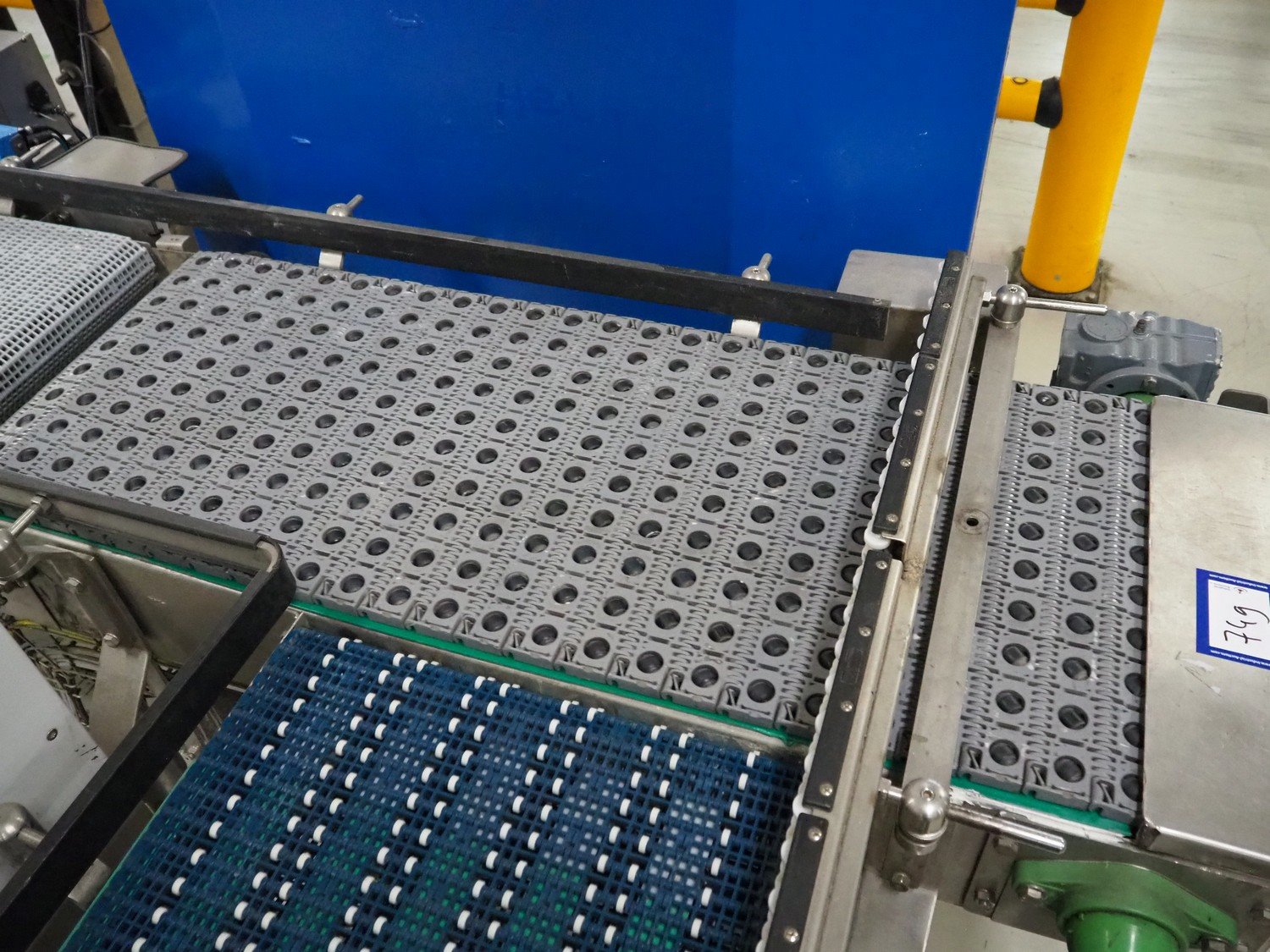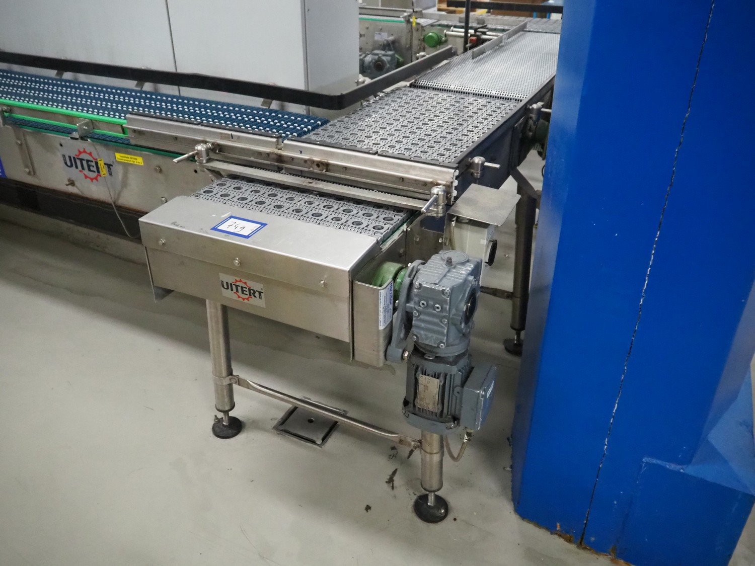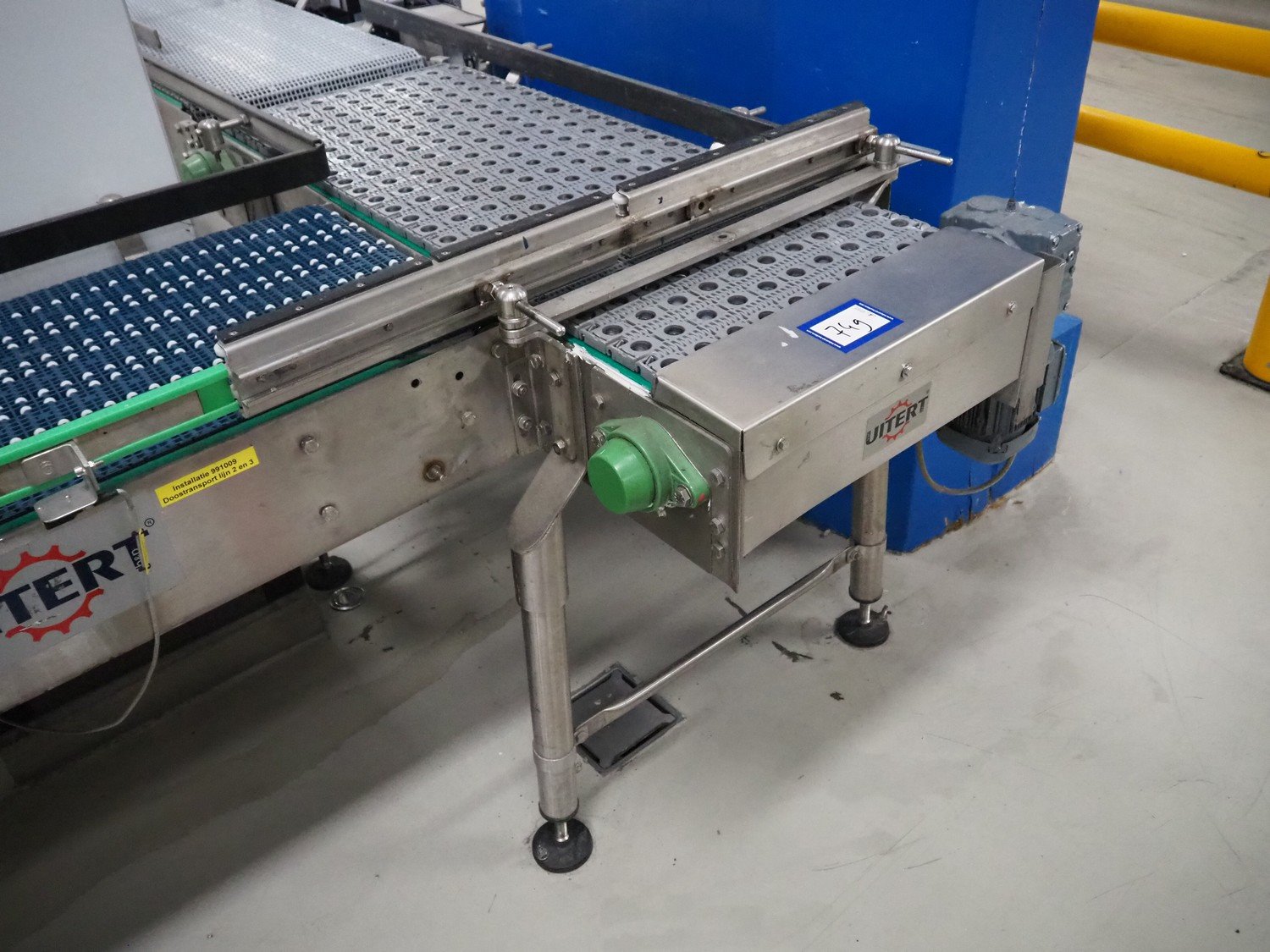 Van Uitert b&p turning conveyor, plastic belt with rollers, belt width: 510 mm, total dimensions: 2900 mm x 800 mm x 1200 mm. Kavel locatie: P. Stuyvesantweg 1, 8937 AC Leeuwarden, Nederland