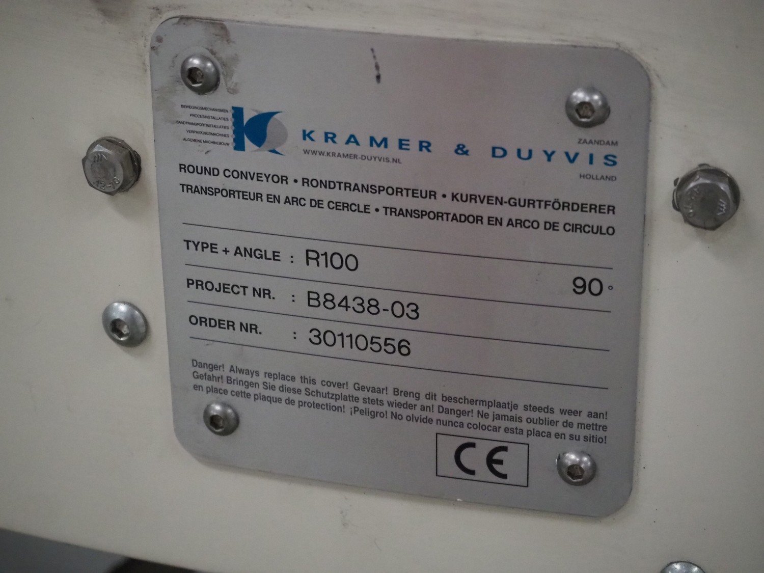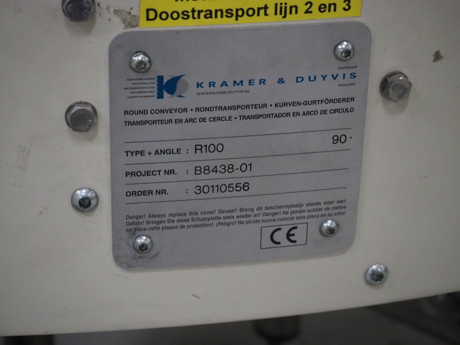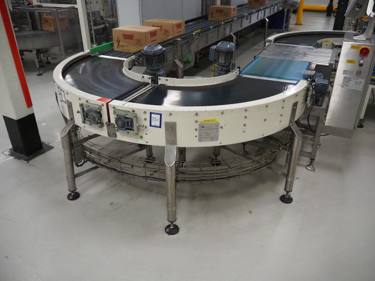 Kramer&Duyvis 180° curve conveyor, type+angle: (2x) R100 90°, plastic belt, belt width: 480 mm, total dimensions: 1200 mm x 2400 mm x 1200 mm. Kavel locatie: P. Stuyvesantweg 1, 8937 AC Leeuwarden, Nederland